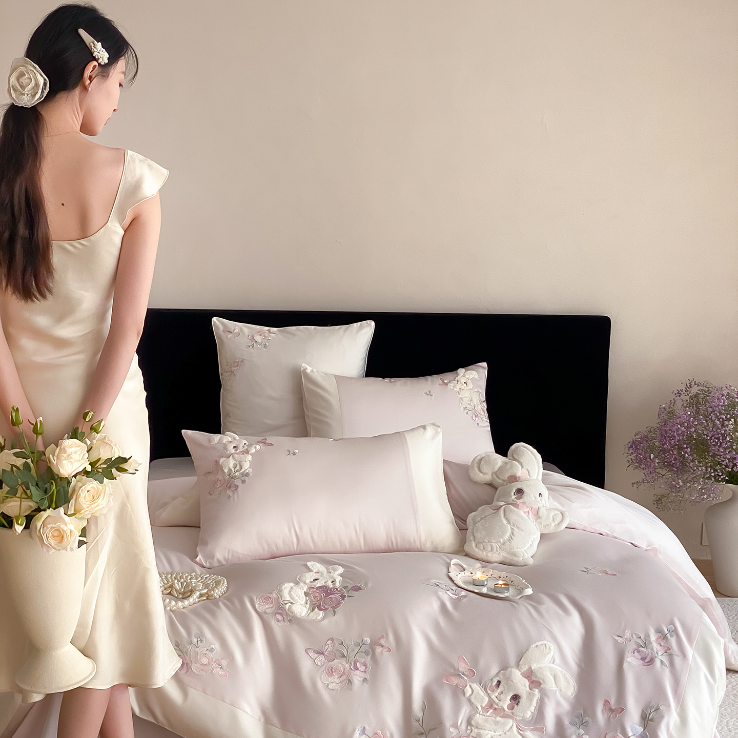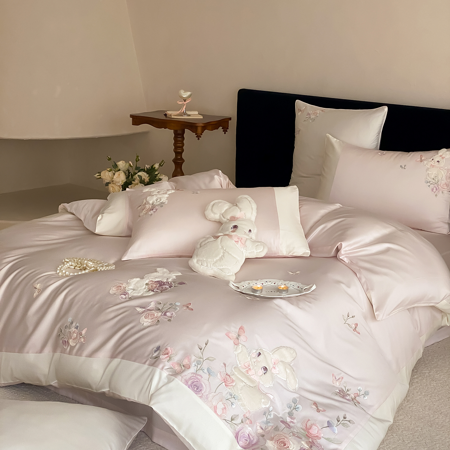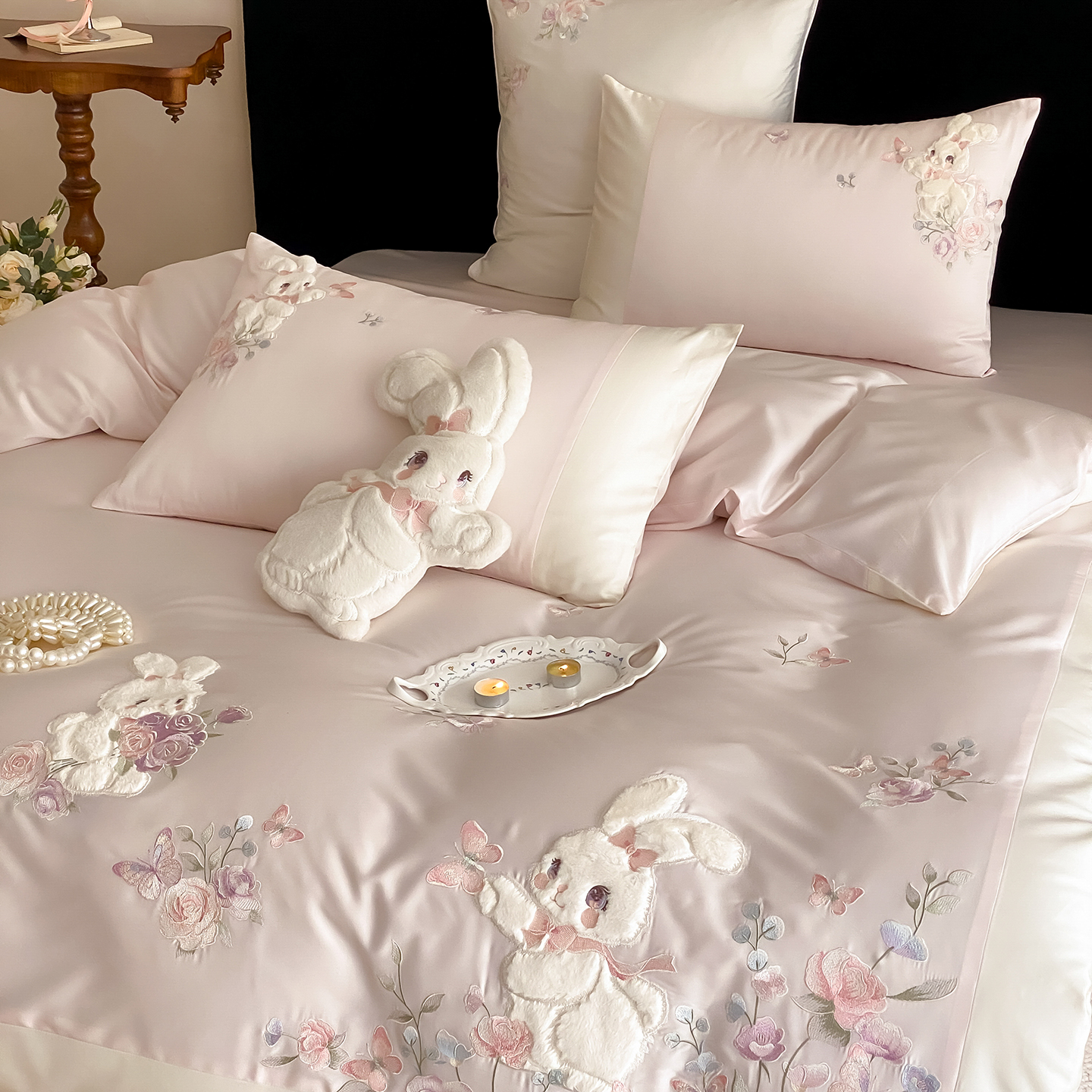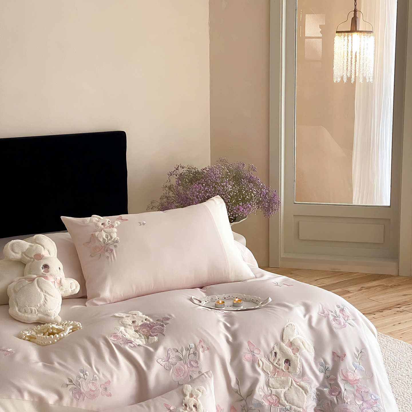 商品名称:(总)莎臣豹 2026新款100支新疆长绒棉精美兔毛立体贴布绣四件套-小兔花语