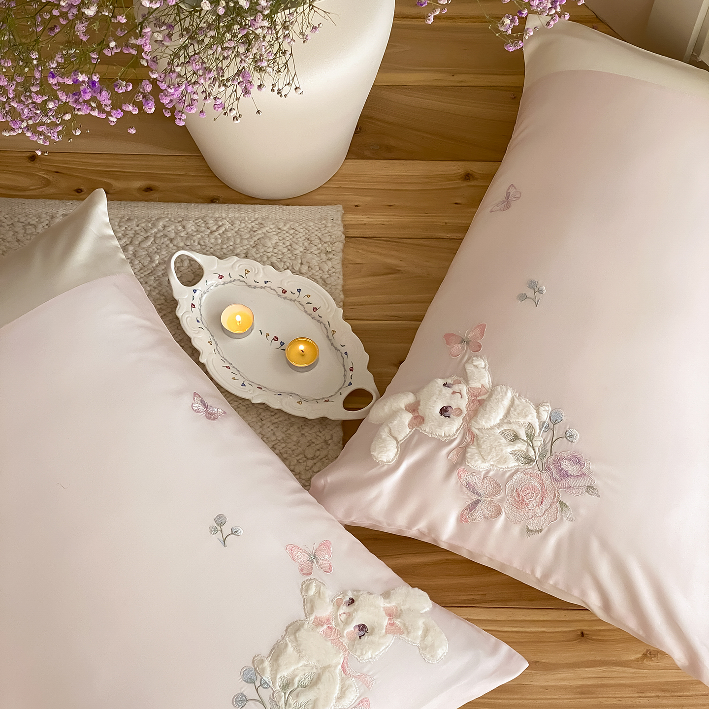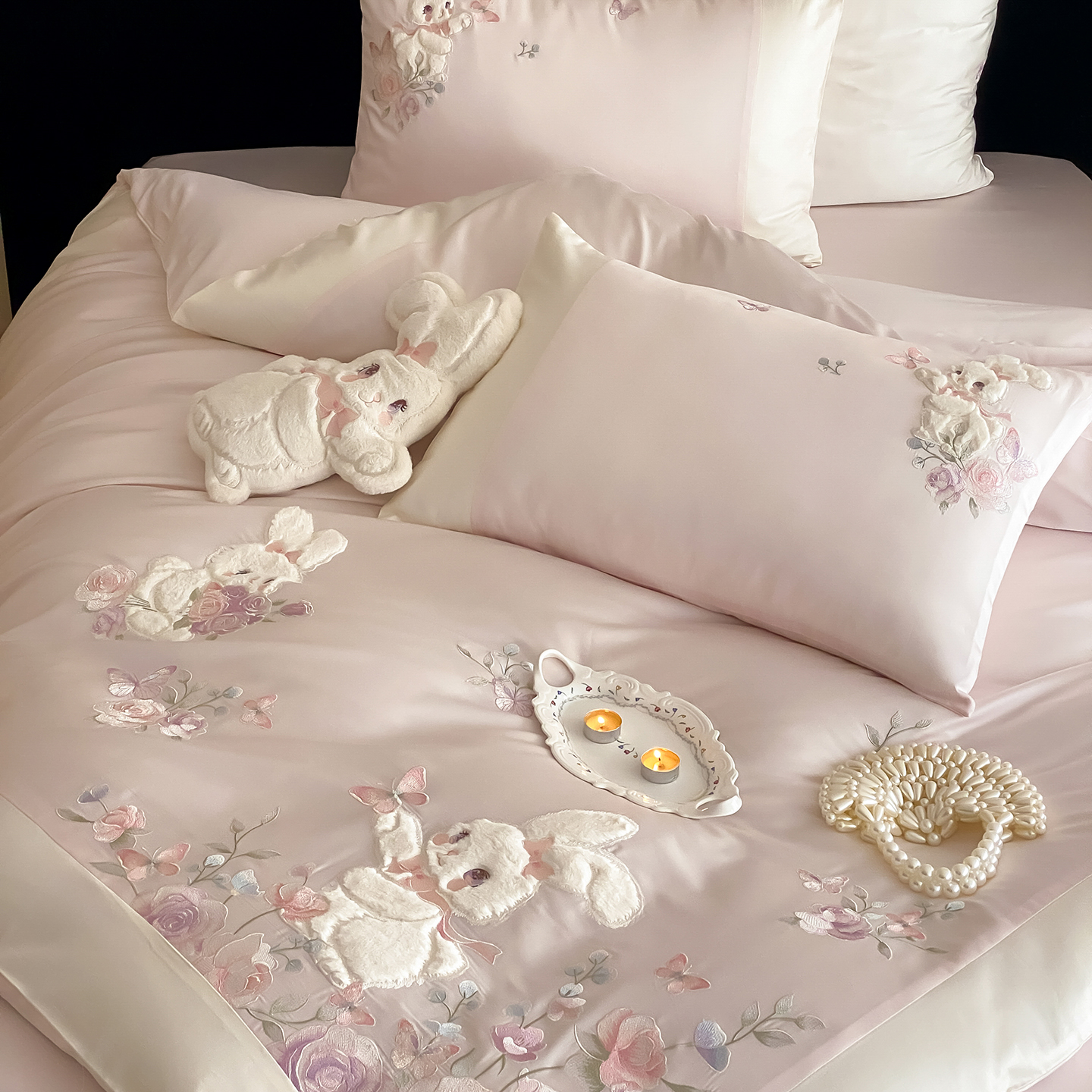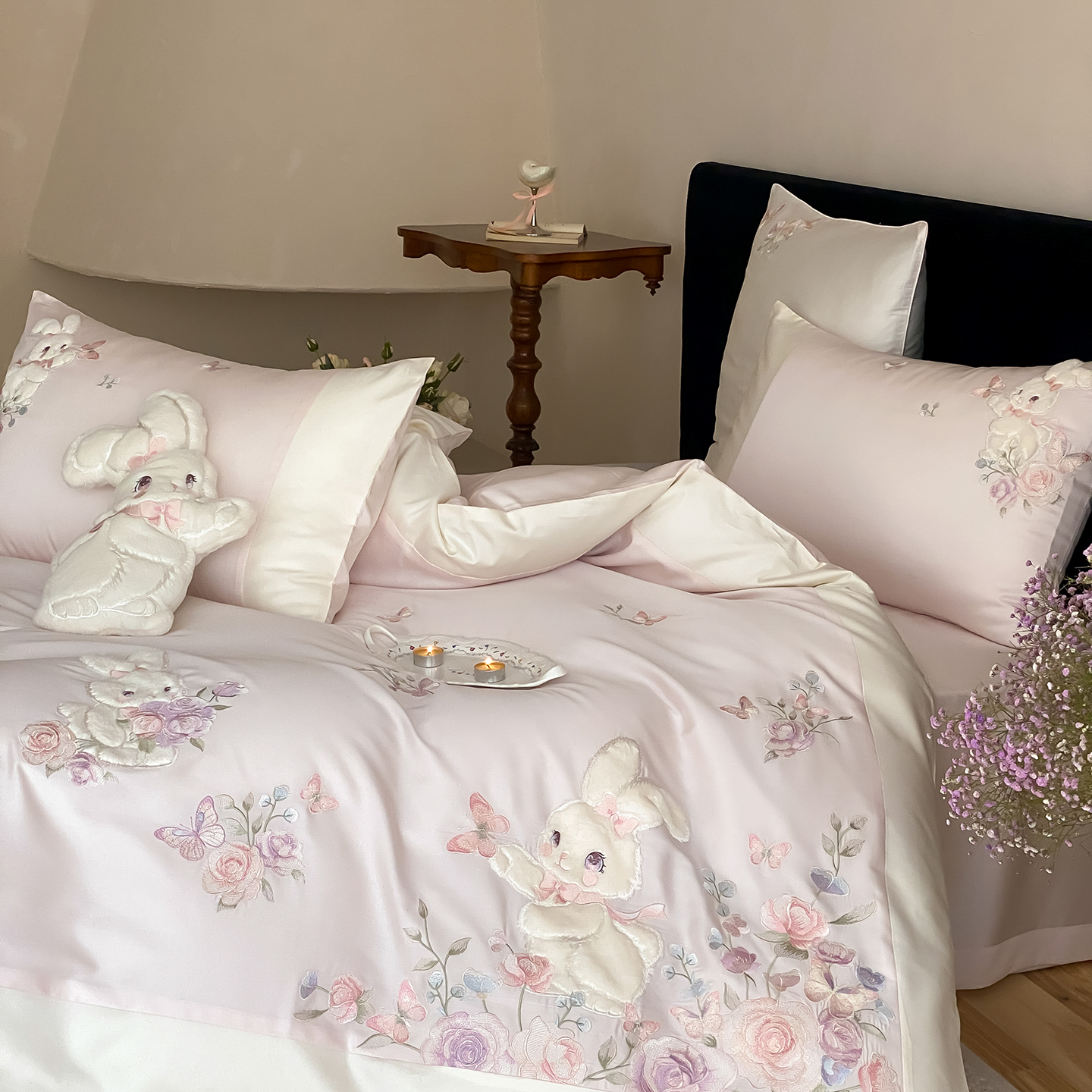 (总)莎臣豹 2026新款100支新疆长绒棉精美兔毛立体贴布绣四件套-小兔花语