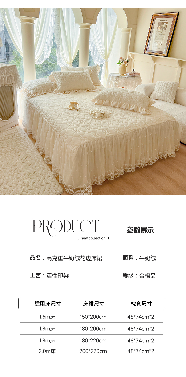 • 91家纺网 家纺一手货源 找家纺 麒豆豆 2023新款高克重牛奶绒花边单床裙-山茶系列 山茶-米