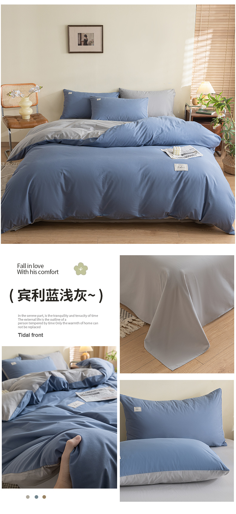 当前位置: 91家纺网 > 商品网购 > 床品套件 > 四件套 > 全棉普通四件套 > 木子家纺 2024新款纯色双拼40支全棉水洗棉四件套 宾利蓝浅灰