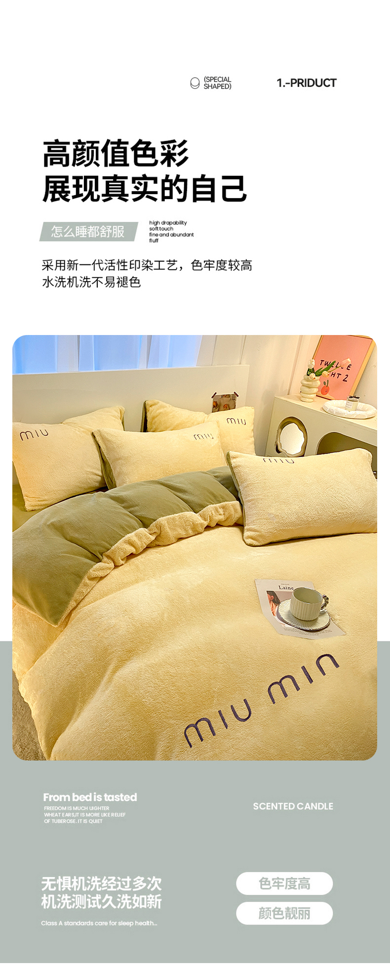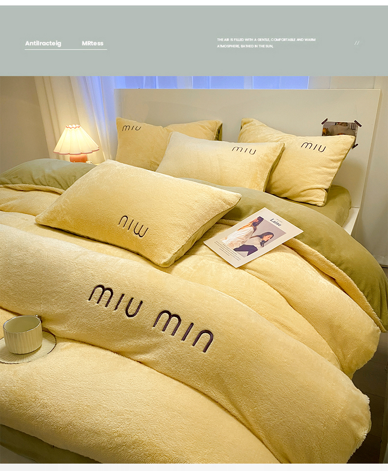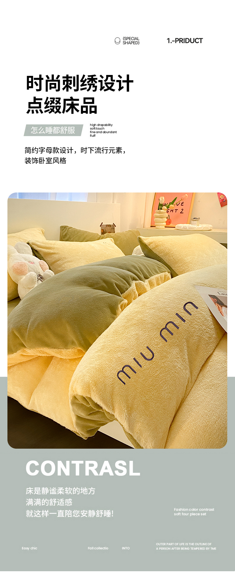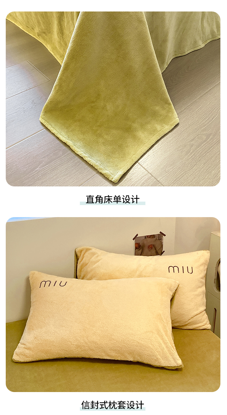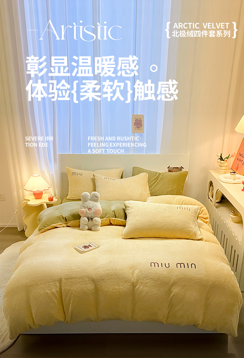 当前位置: 91家纺网 > 商品网购 > 床品套件 > 四件套 > 牛奶绒四件套 > 启程家纺 2024新款A类加厚北极绒拼牛奶绒字母刺绣四件套 北极绒-麦芽黄+浅草绿