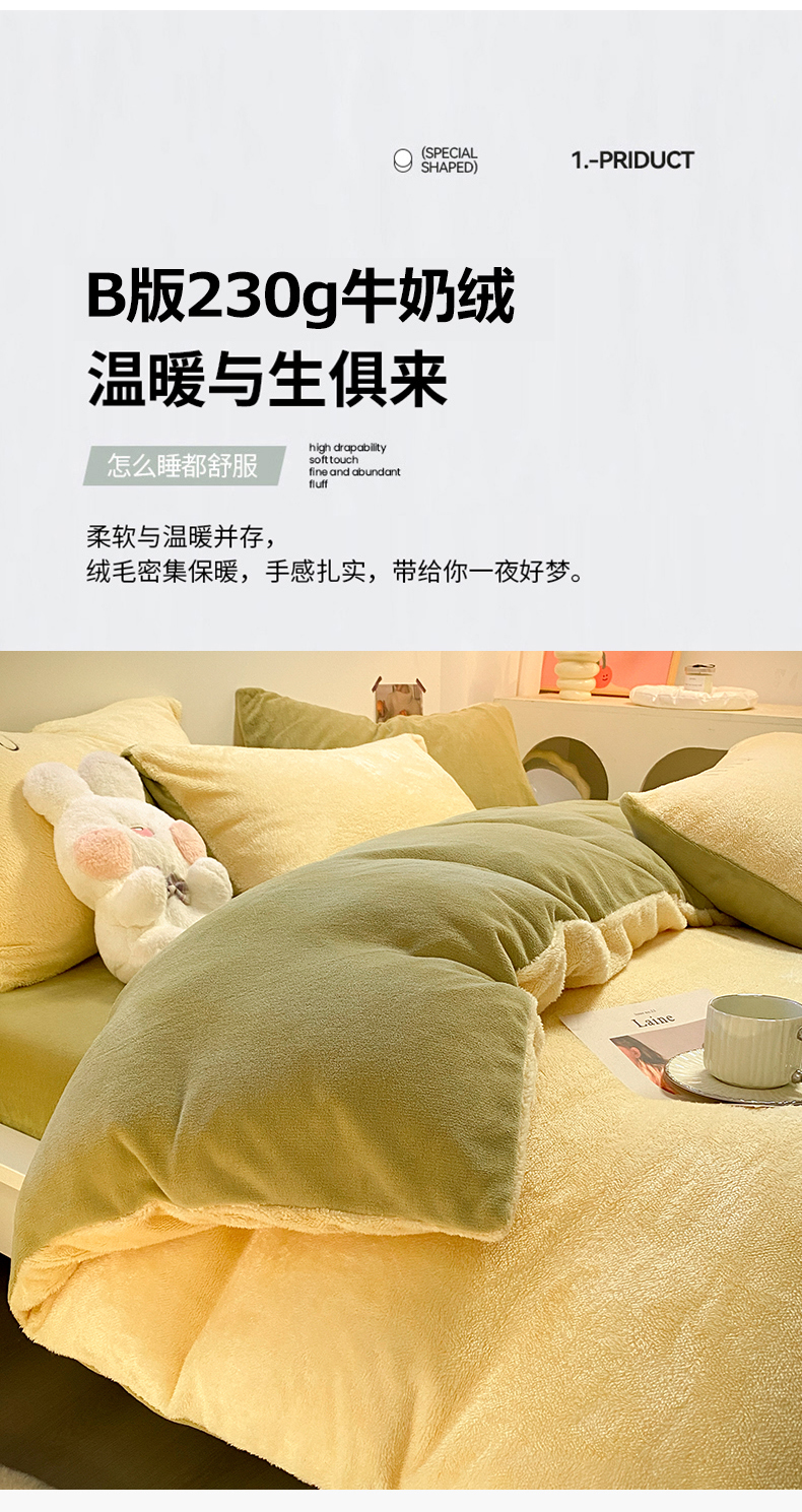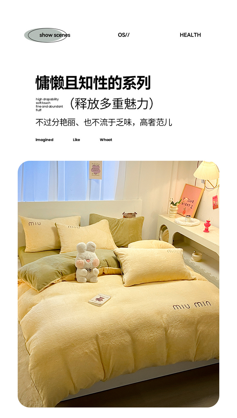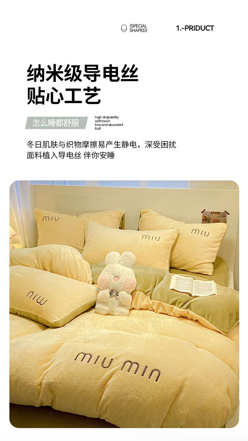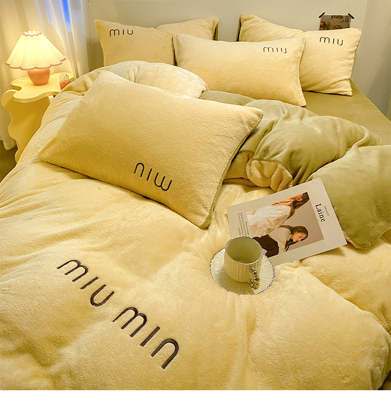 当前位置: 91家纺网 > 商品网购 > 床品套件 > 四件套 > 牛奶绒四件套 > 启程家纺 2024新款A类加厚北极绒拼牛奶绒字母刺绣四件套 北极绒-麦芽黄+浅草绿