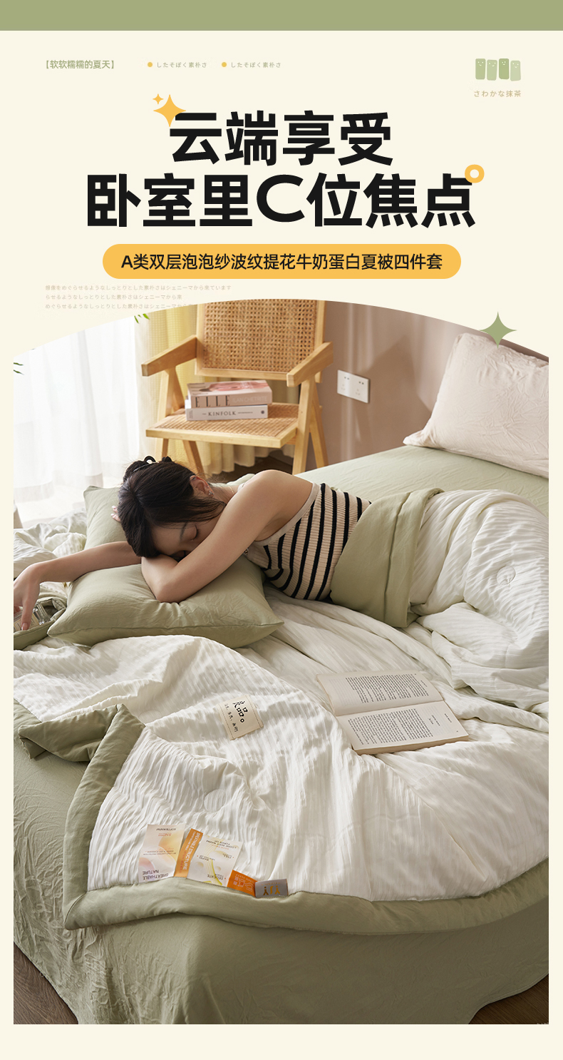 当前位置: 91家纺网 > 商品网购 > 被子 > 夏被 > 一加一家纺2025新款A类双层泡泡纱波纹提花牛奶蛋白夏被四件套 良品波浪纹-草绿色
