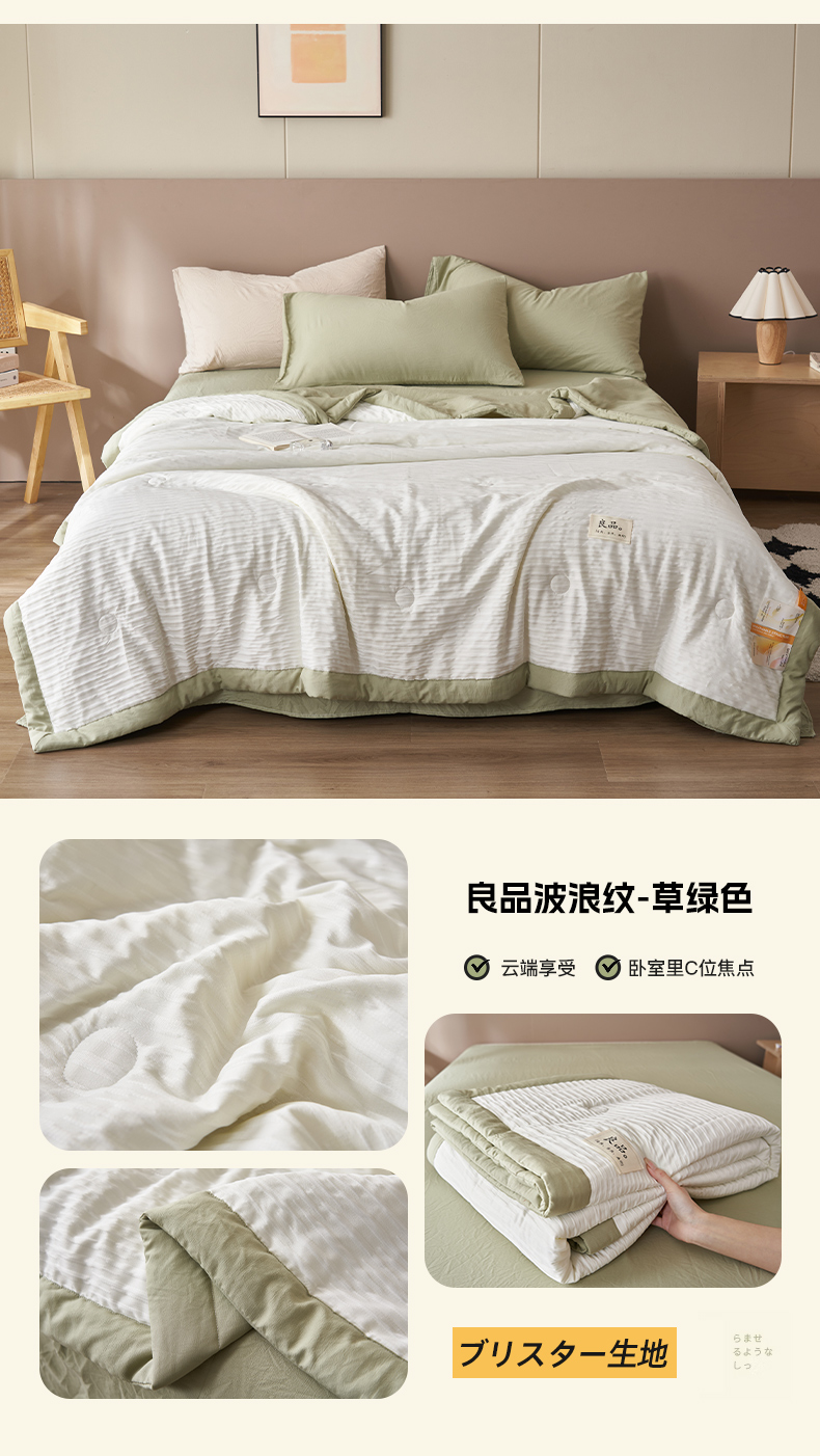 • 91家纺网 家纺一手货源 找家纺 一加一家纺2025新款A类双层泡泡纱波纹提花牛奶蛋白夏被四件套 良品波浪纹-草绿色