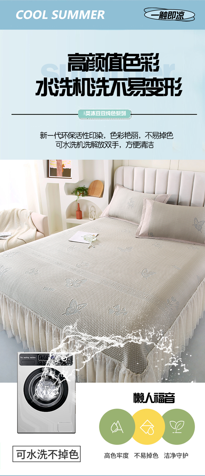 (总)莱轩席业 2024新款A类抗菌刺绣冰丝席可拆卸床裙款凉席,冰川粉,冰川咖,冰川蓝,冰川绿