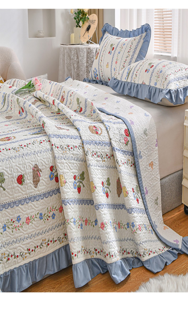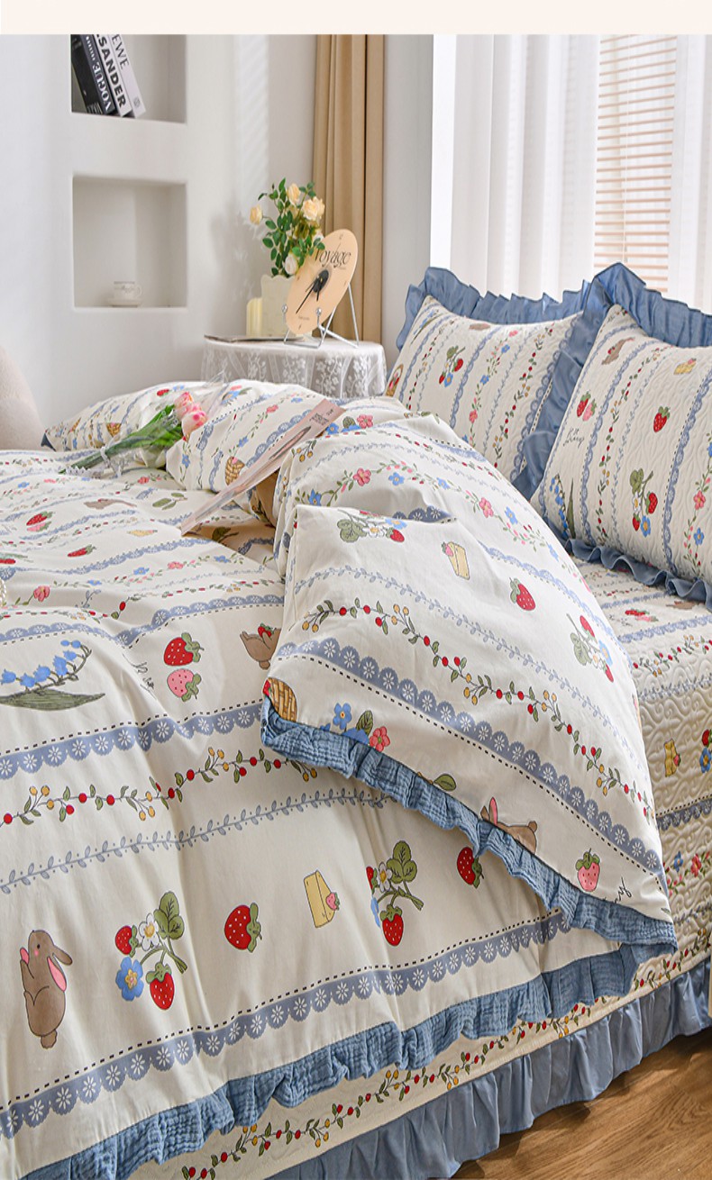 梦精灵家纺 2025新款韩系全棉花边款单被套 浆果小兔