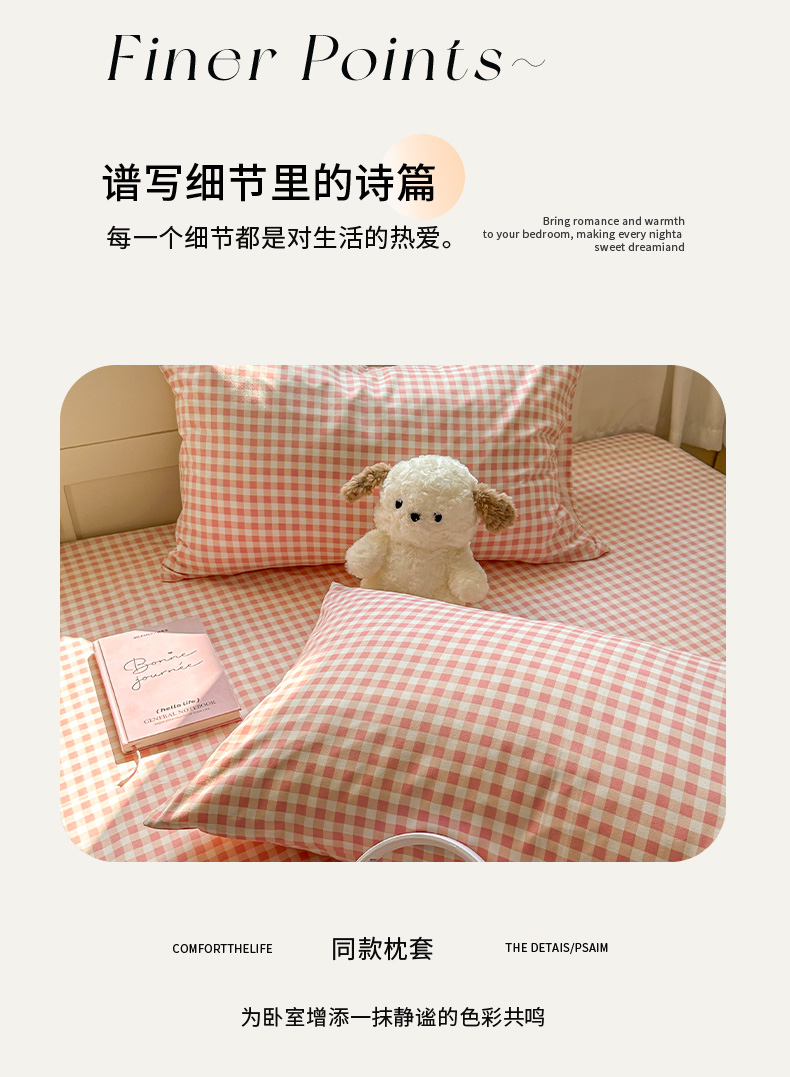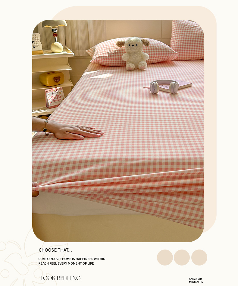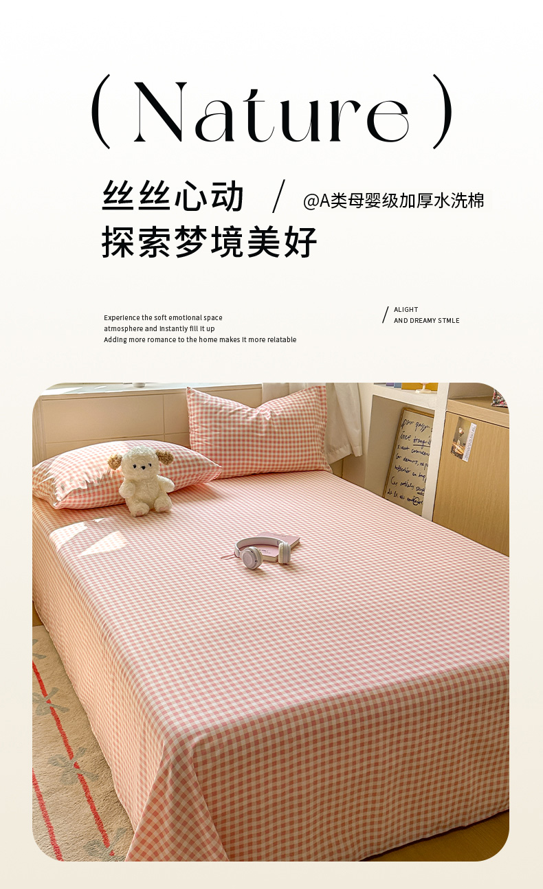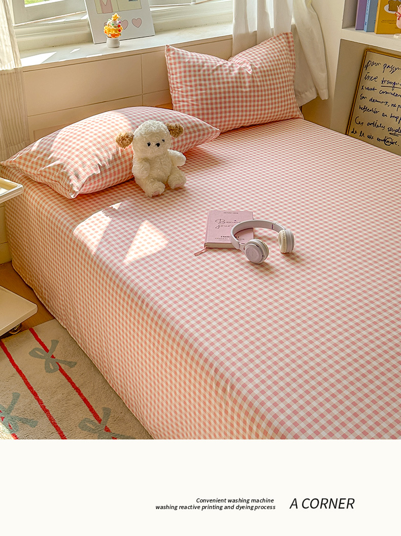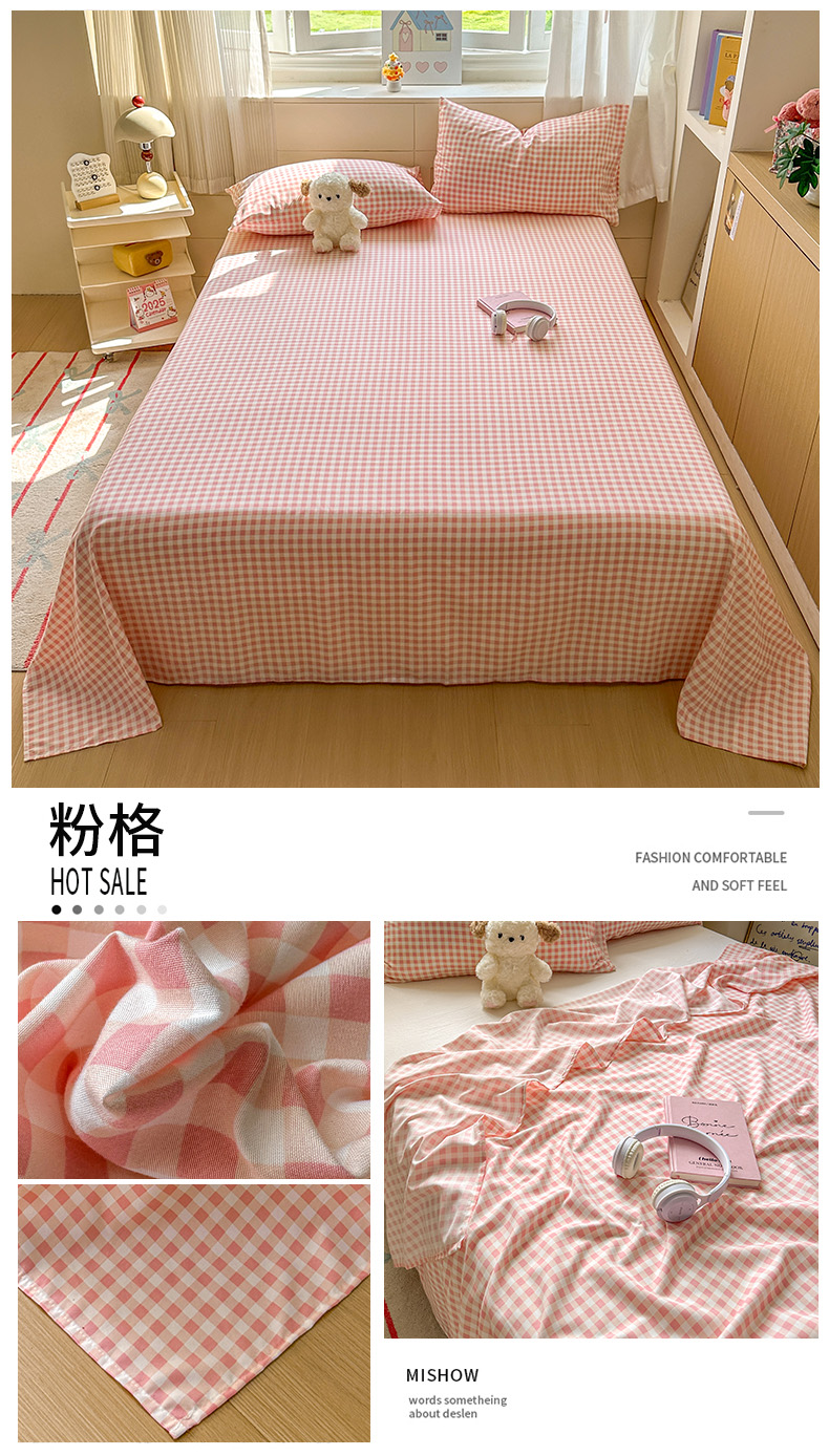 冕悠家纺 2025新款A类加厚水洗棉格子点点印花超柔单品床单枕套 粉格