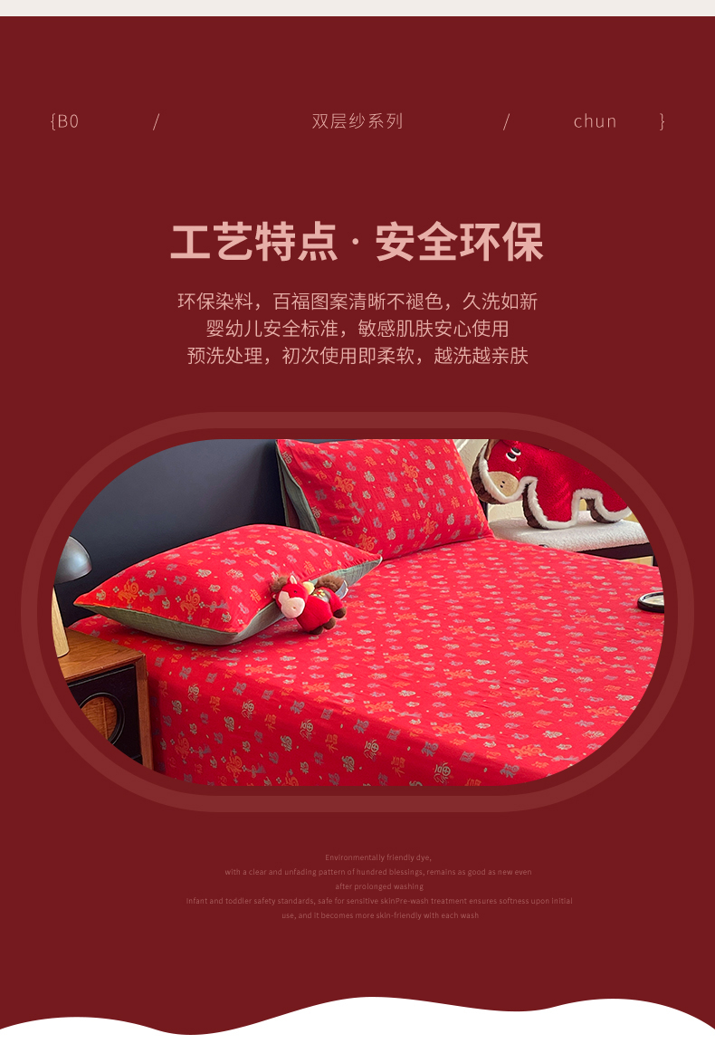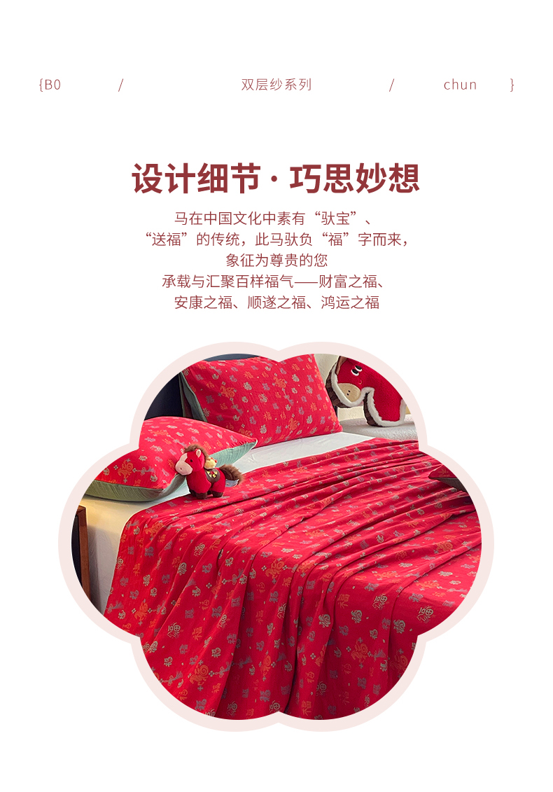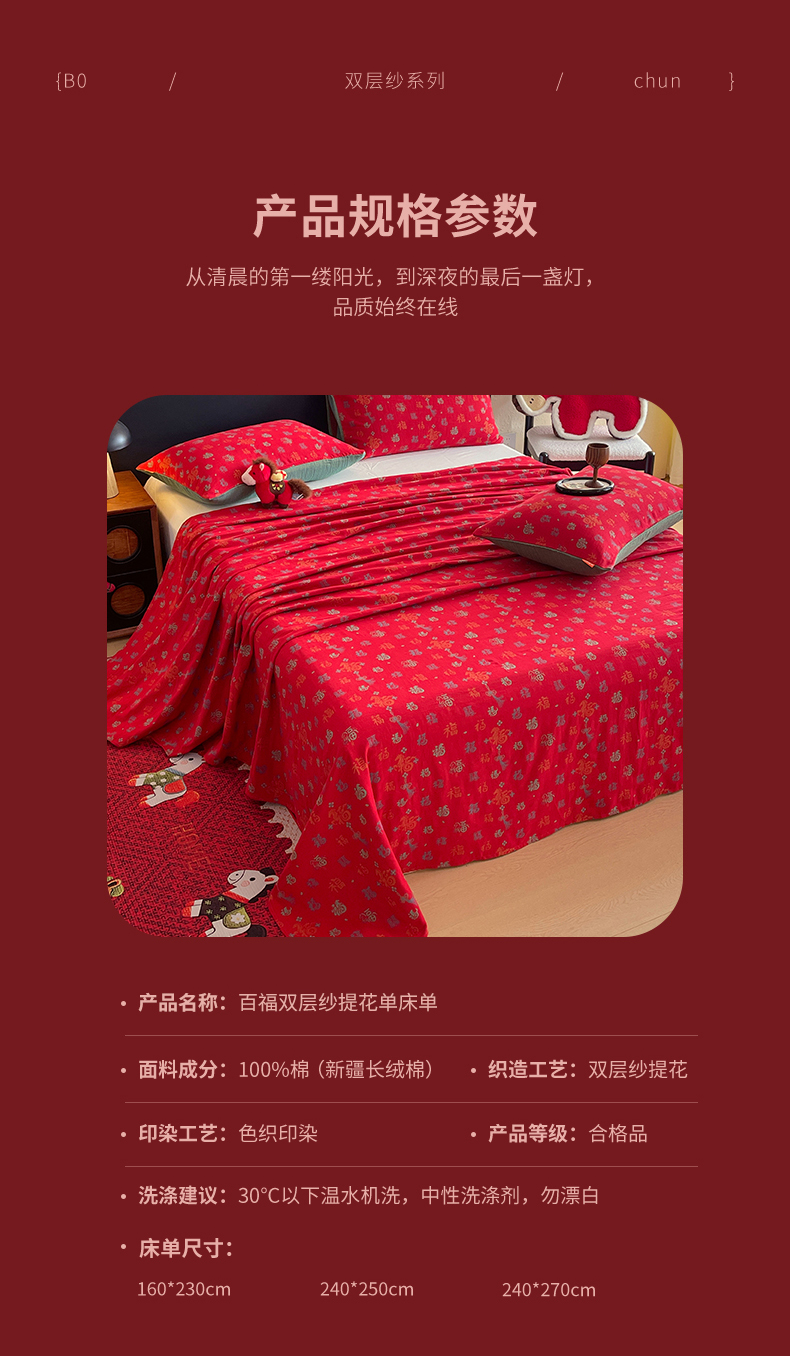 商品名称:春皖家纺 2026新款全棉色织双层纱提花百福系列拉链款-单床单 红福马