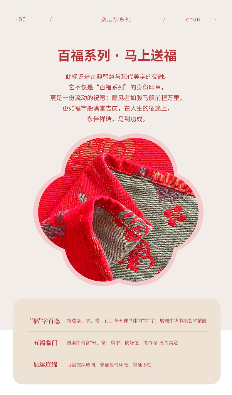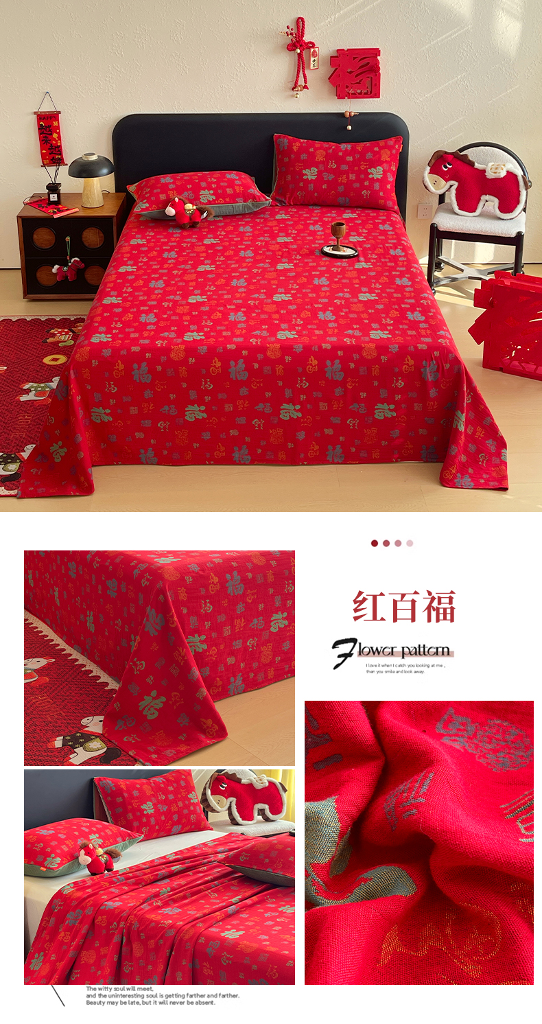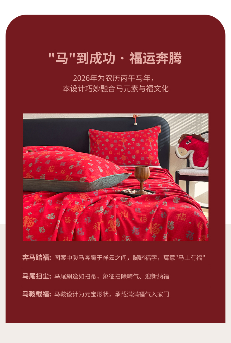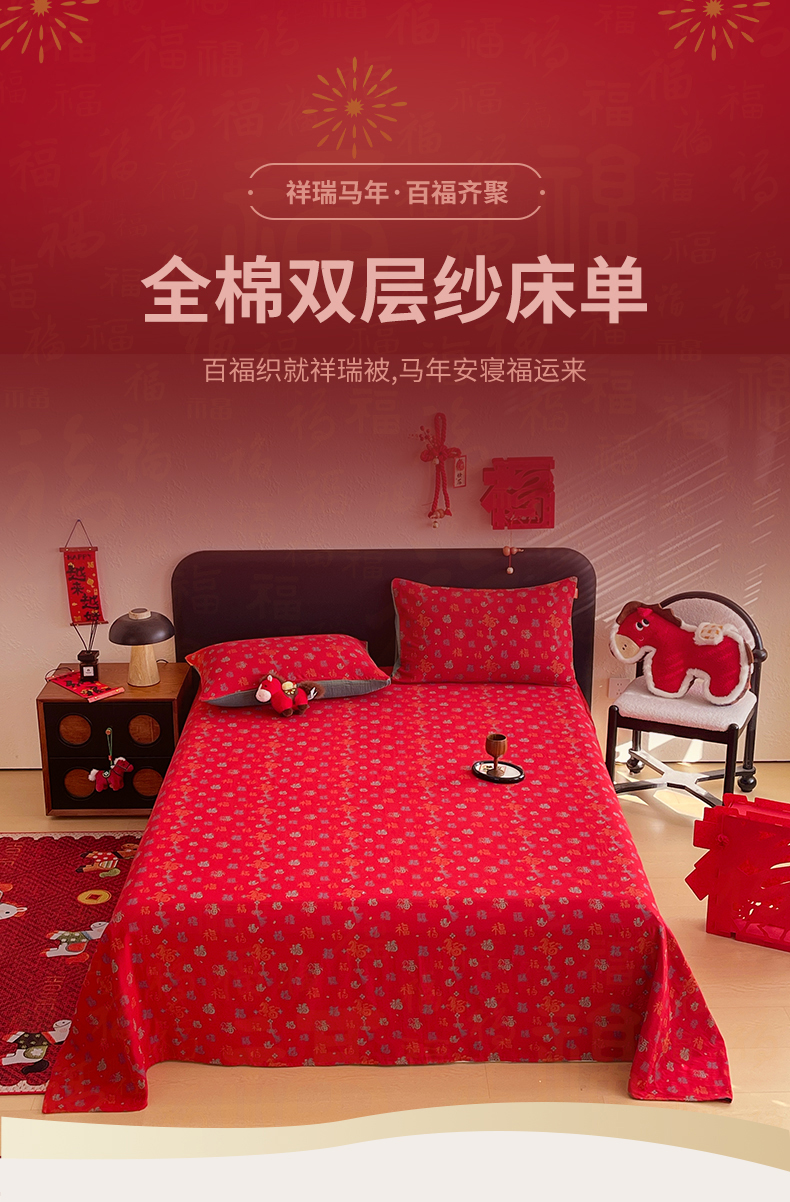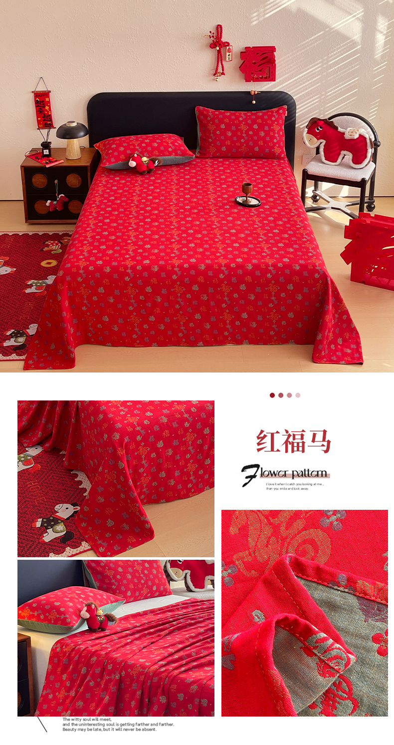 春皖家纺 2026新款全棉色织双层纱提花百福系列拉链款-单床单 红福马