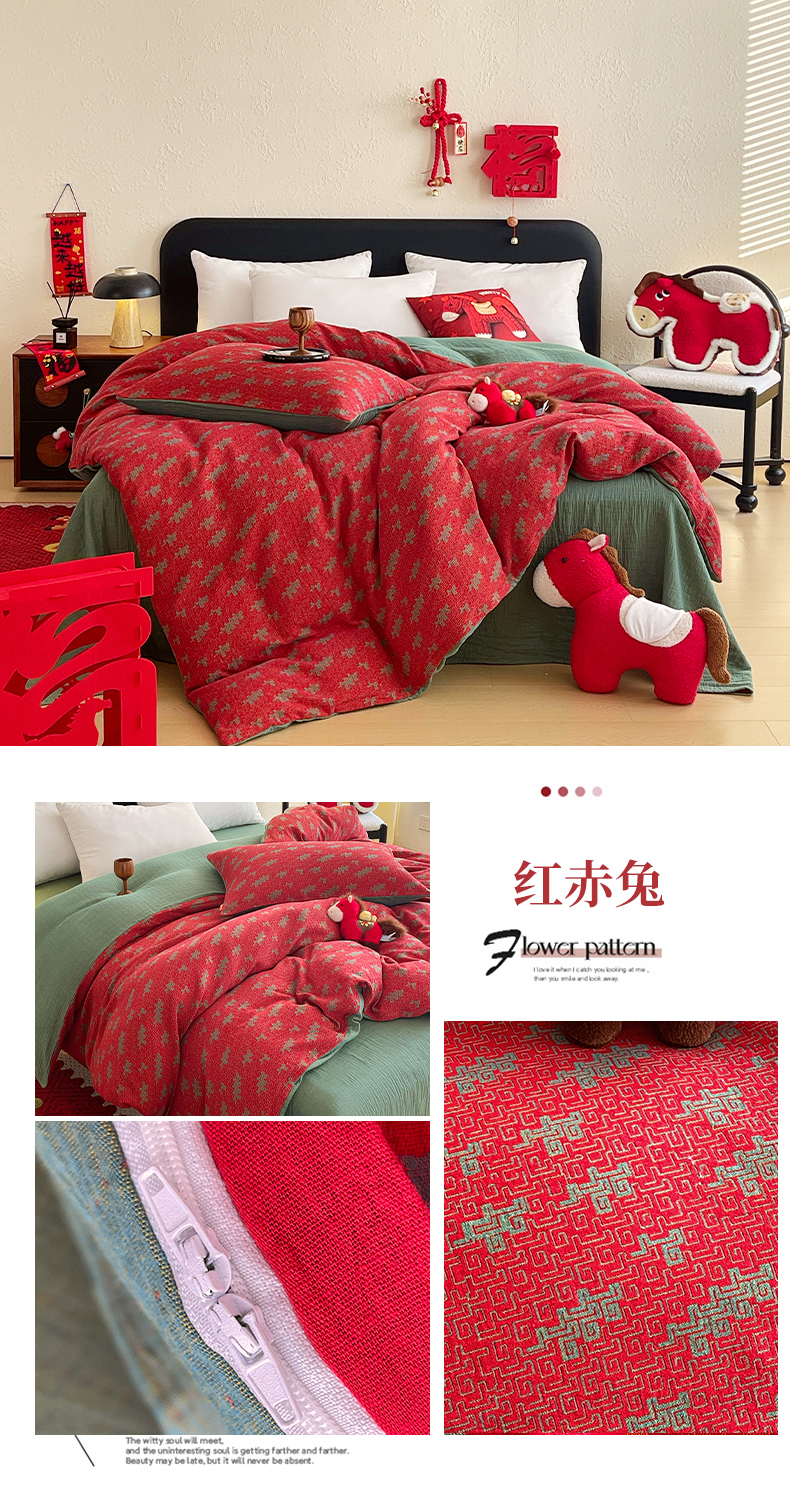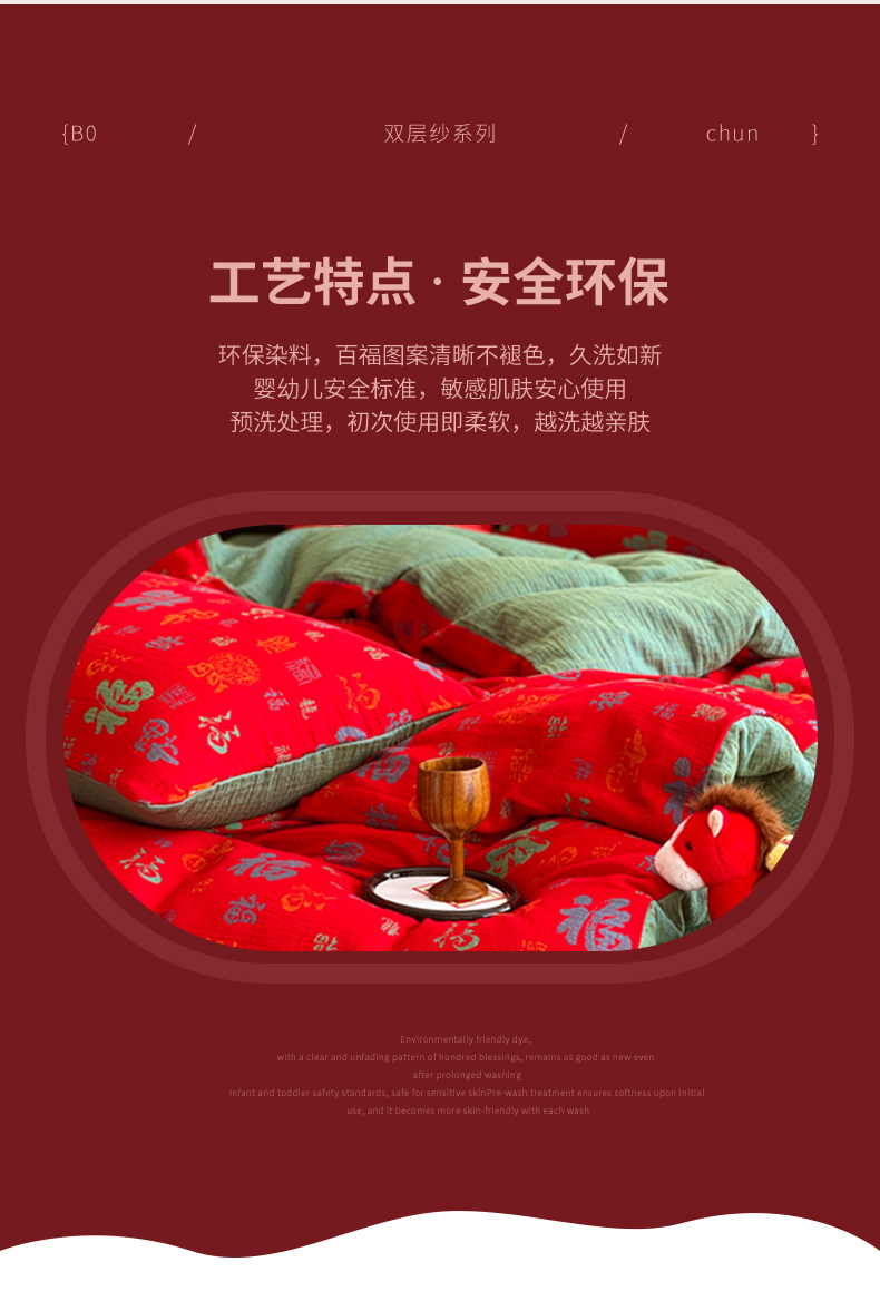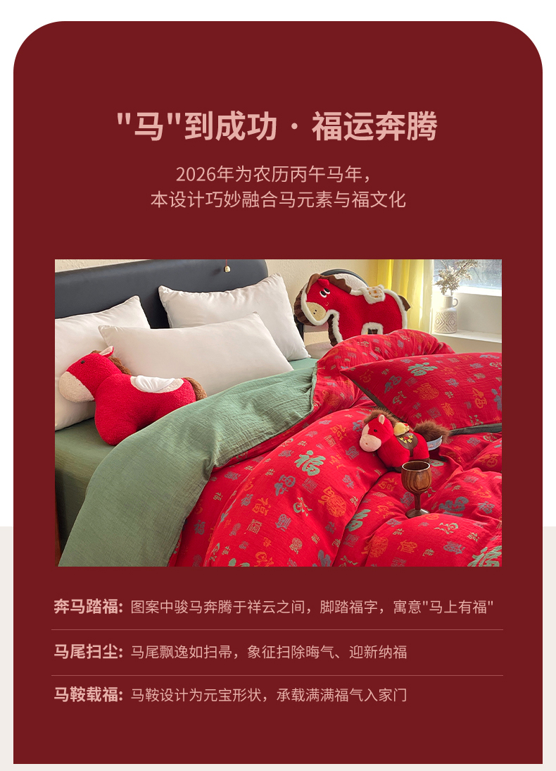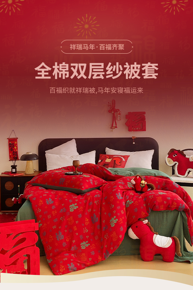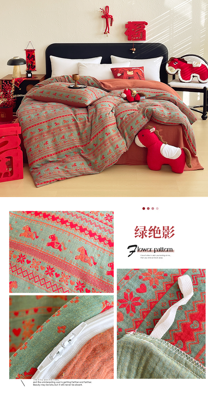 (总)春皖家纺 2026新款全棉色织双层纱提花百福系列拉链款-四件套,红百福,红赤兔,红福马,绿赤兔,绿福马,红绝影,绿绝影