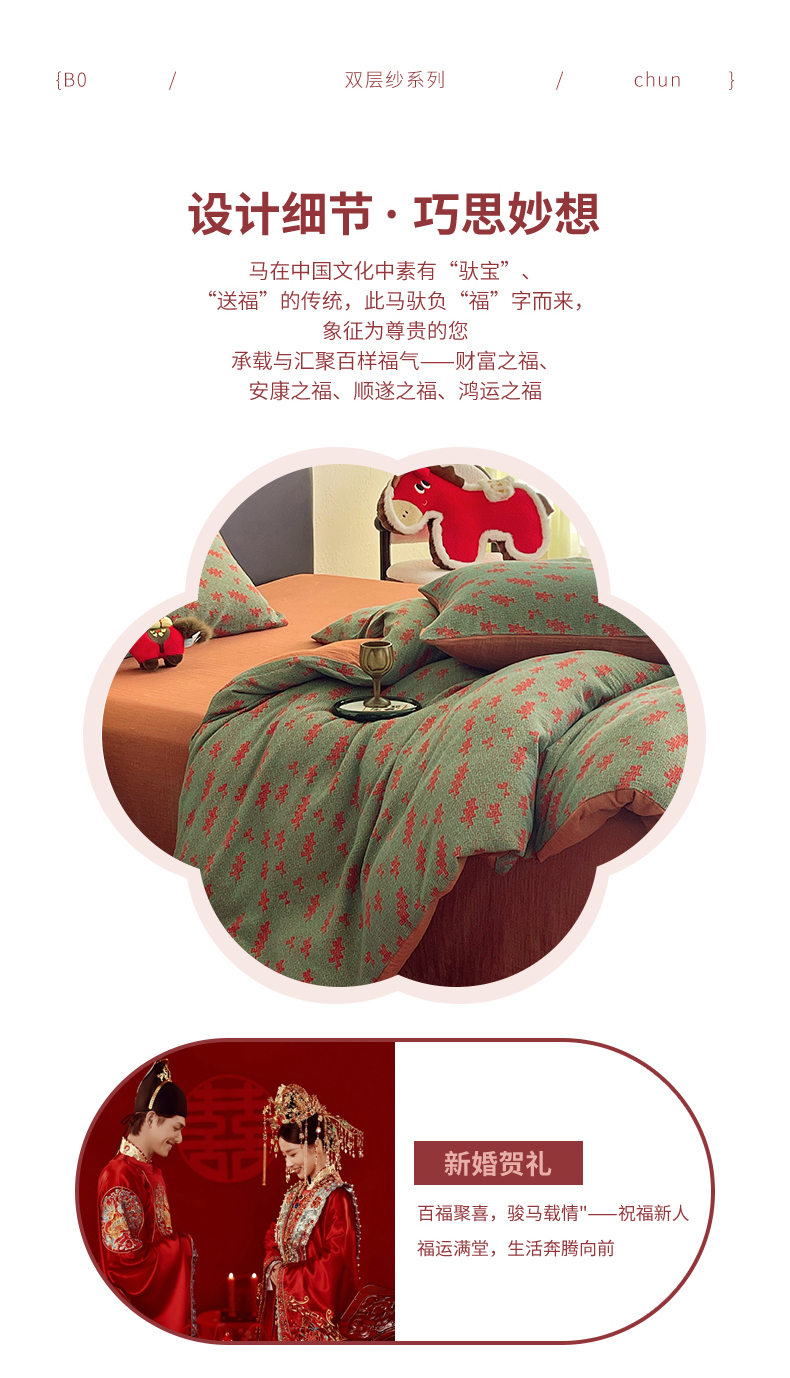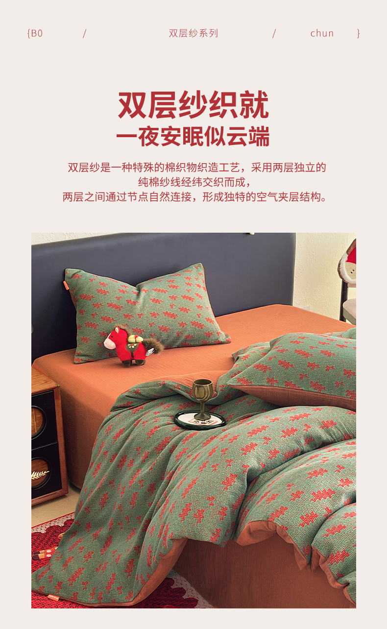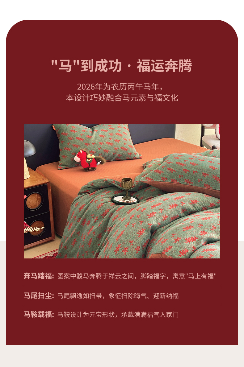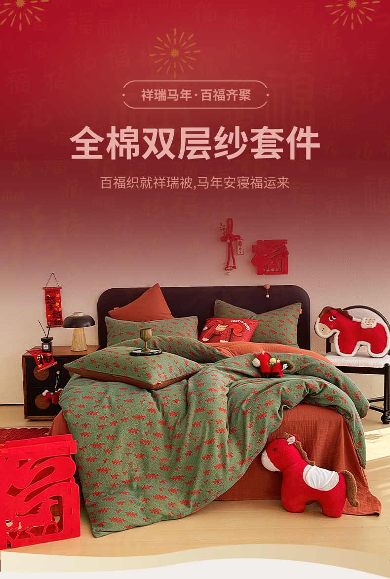 当前位置: 91家纺网 > 商品网购 > 床品套件 > 四件套 > 双层纱四件套 > 春皖家纺 2026新款全棉色织双层纱提花百福系列拉链款-四件套 绿赤兔