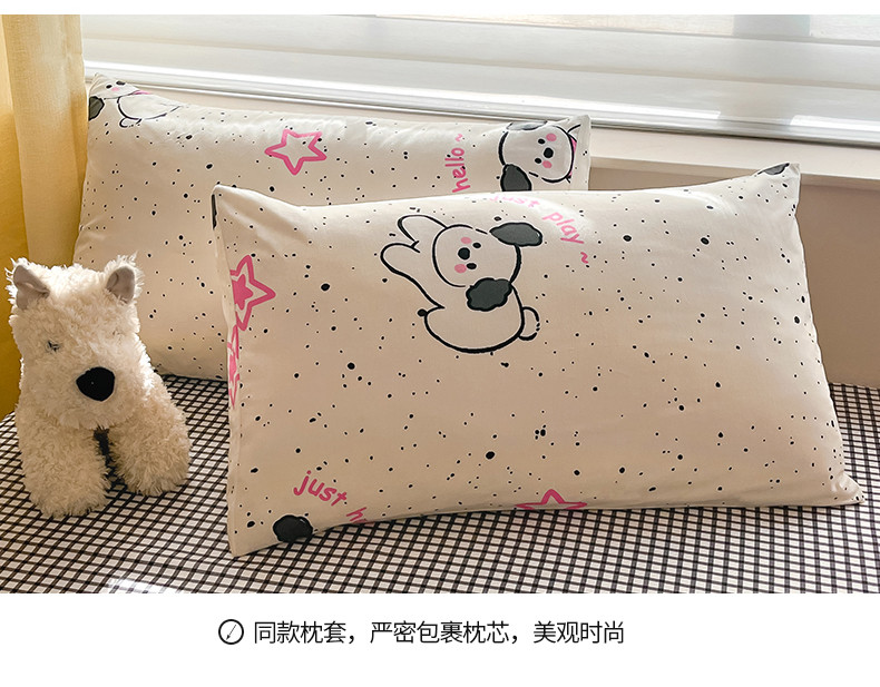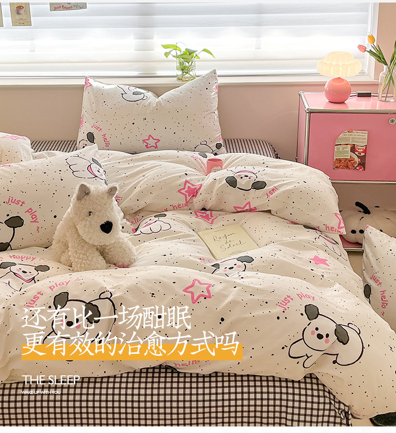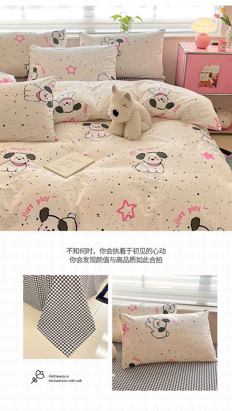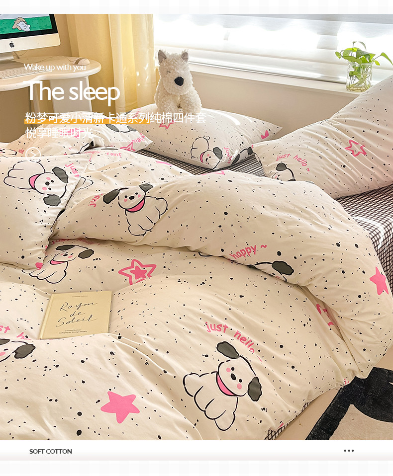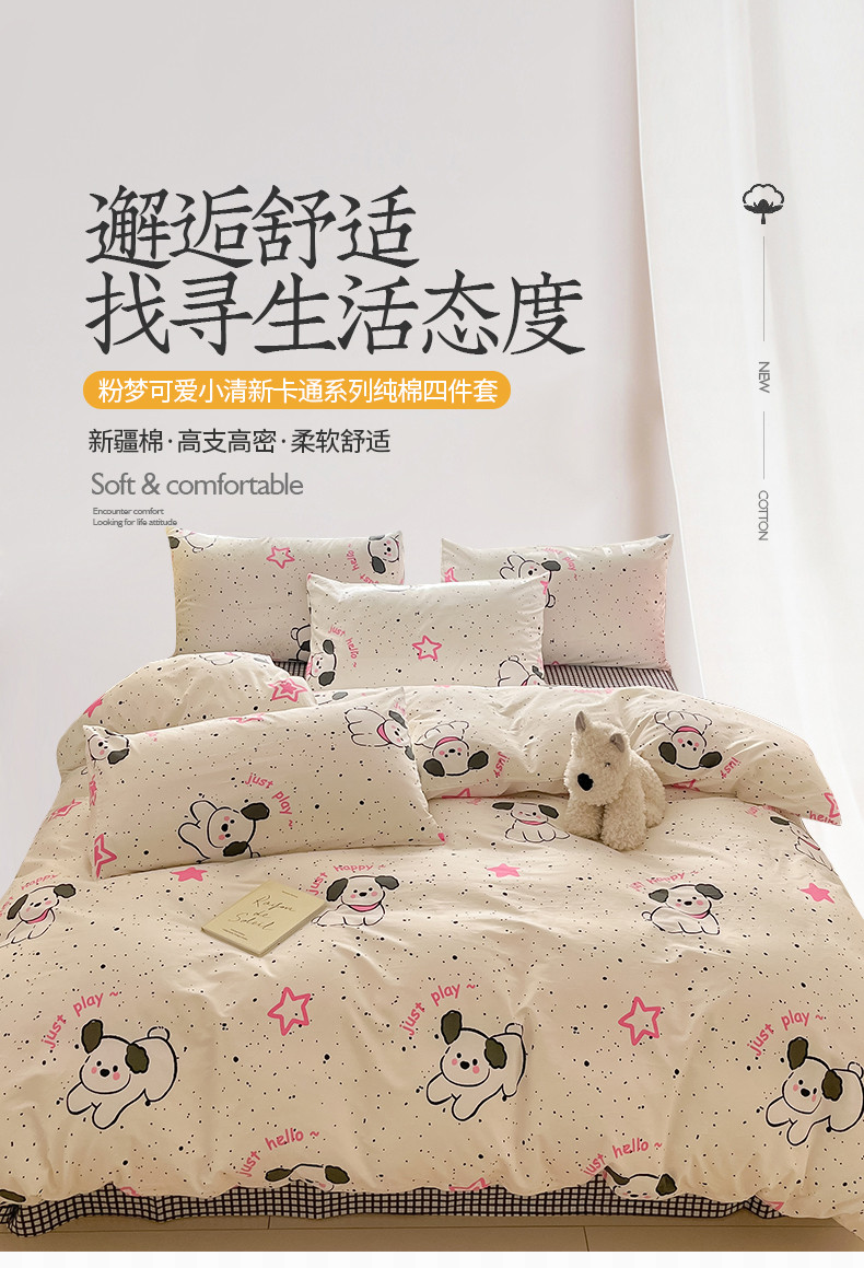 商品名称:桃子家居 2024新款纯棉13372粉梦可爱小清新卡通系列四件套 棉-粉萌小狗