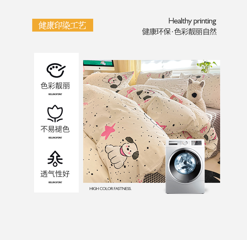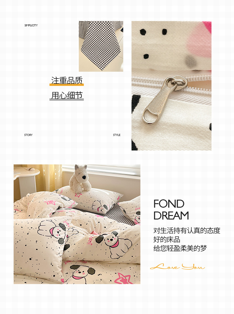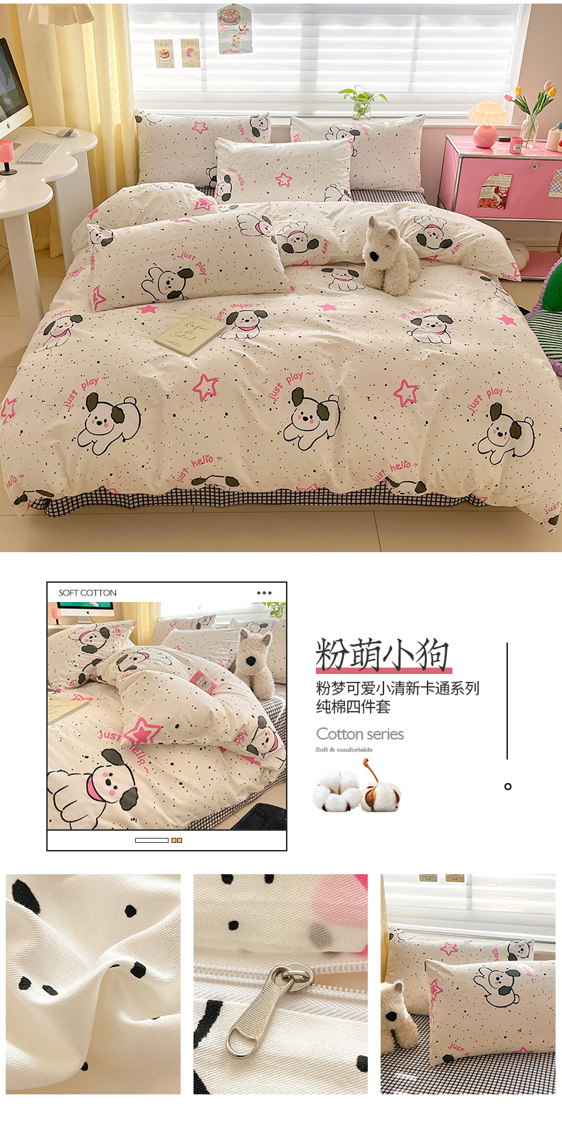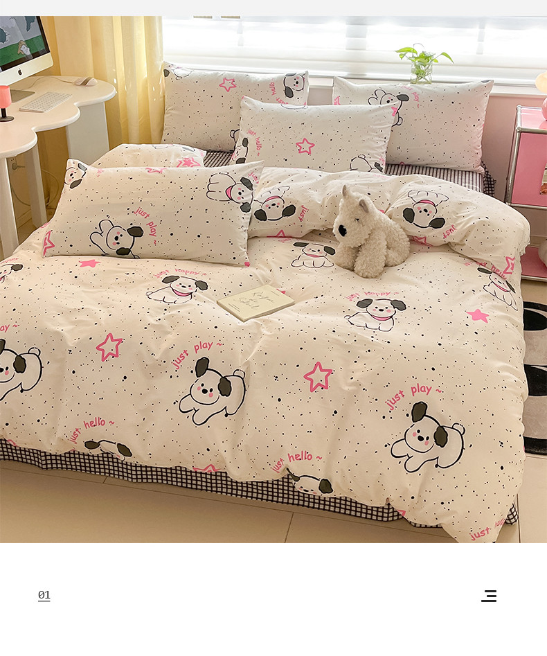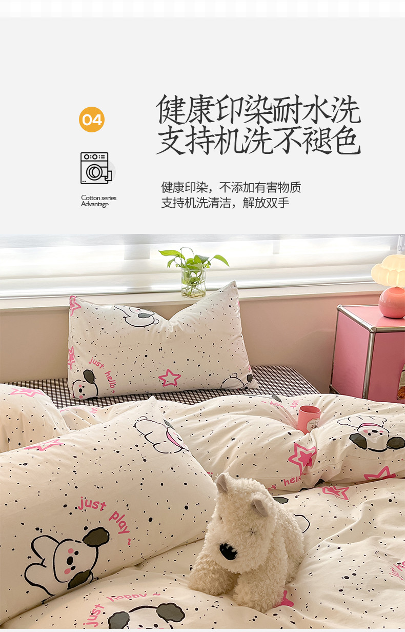 商品名称:桃子家居 2024新款纯棉13372粉梦可爱小清新卡通系列四件套 棉-粉萌小狗