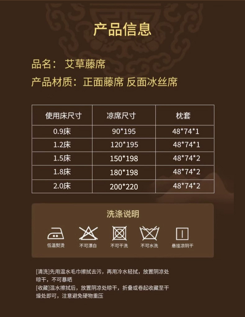 商品名称:青雅席业 2025新款艾草刺绣双面驱蚊御藤席-正面藤席-背面冰丝双面两用 双面席步步高
