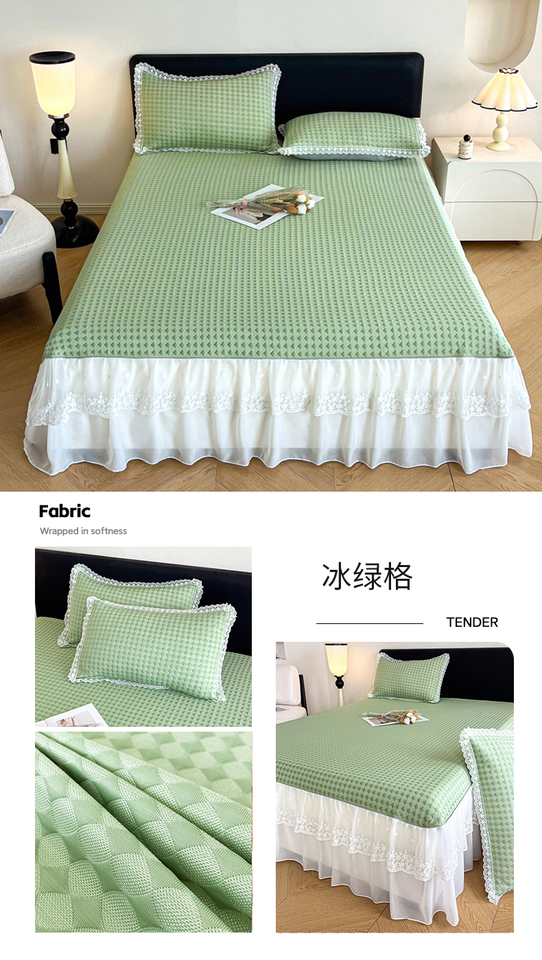 商品名称:吉祥家纺 2024新款华夫格冰豆豆凉感床裙套件 冰绿格