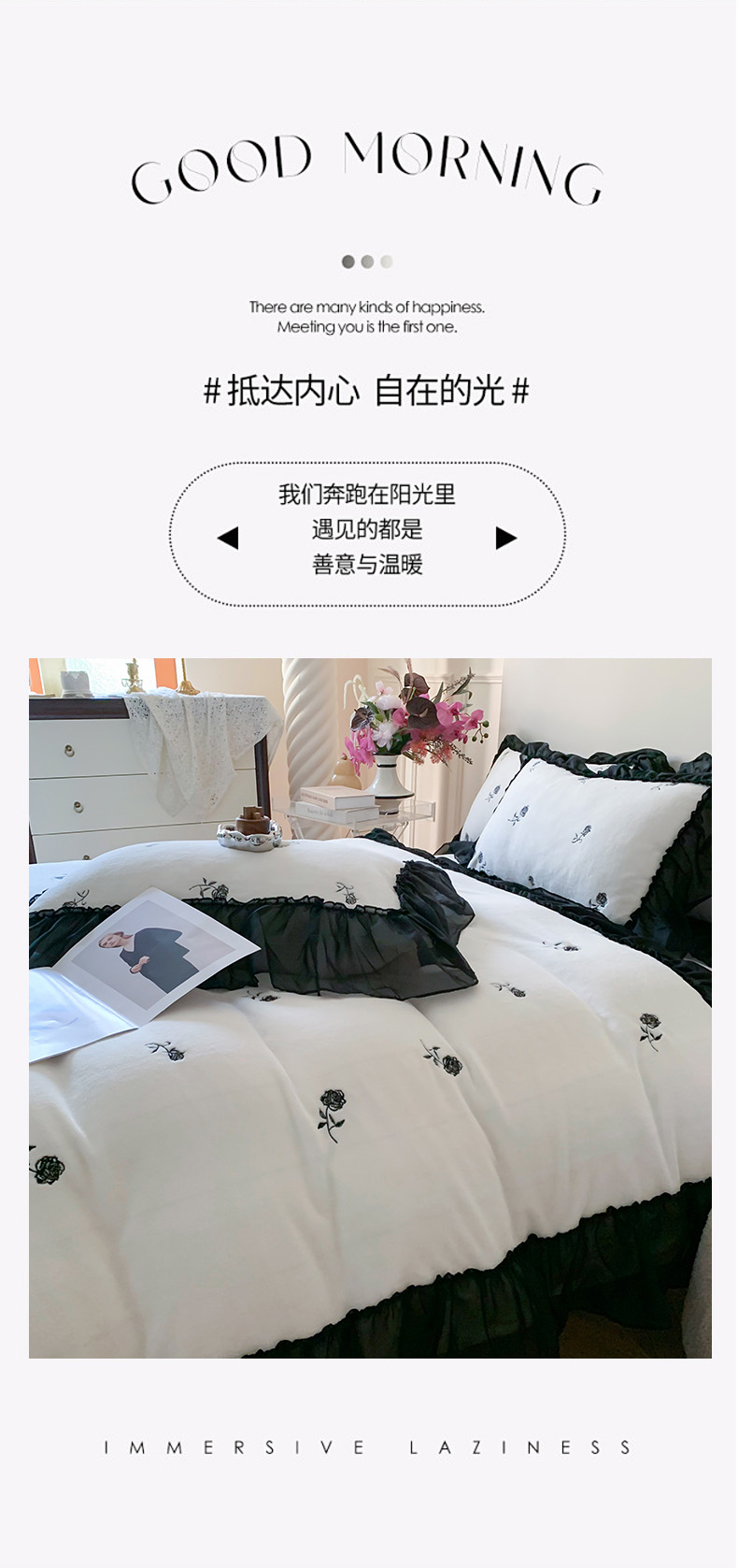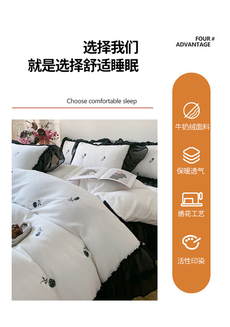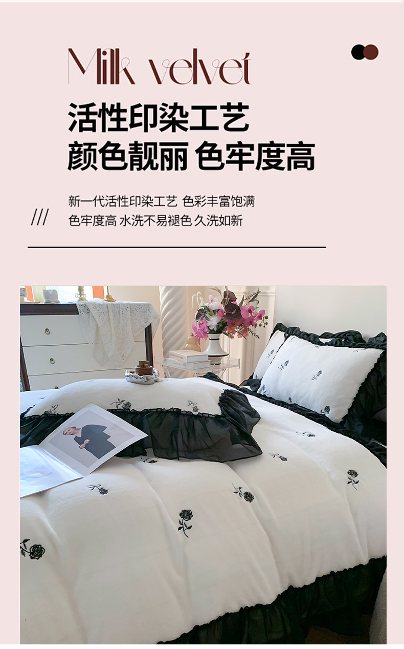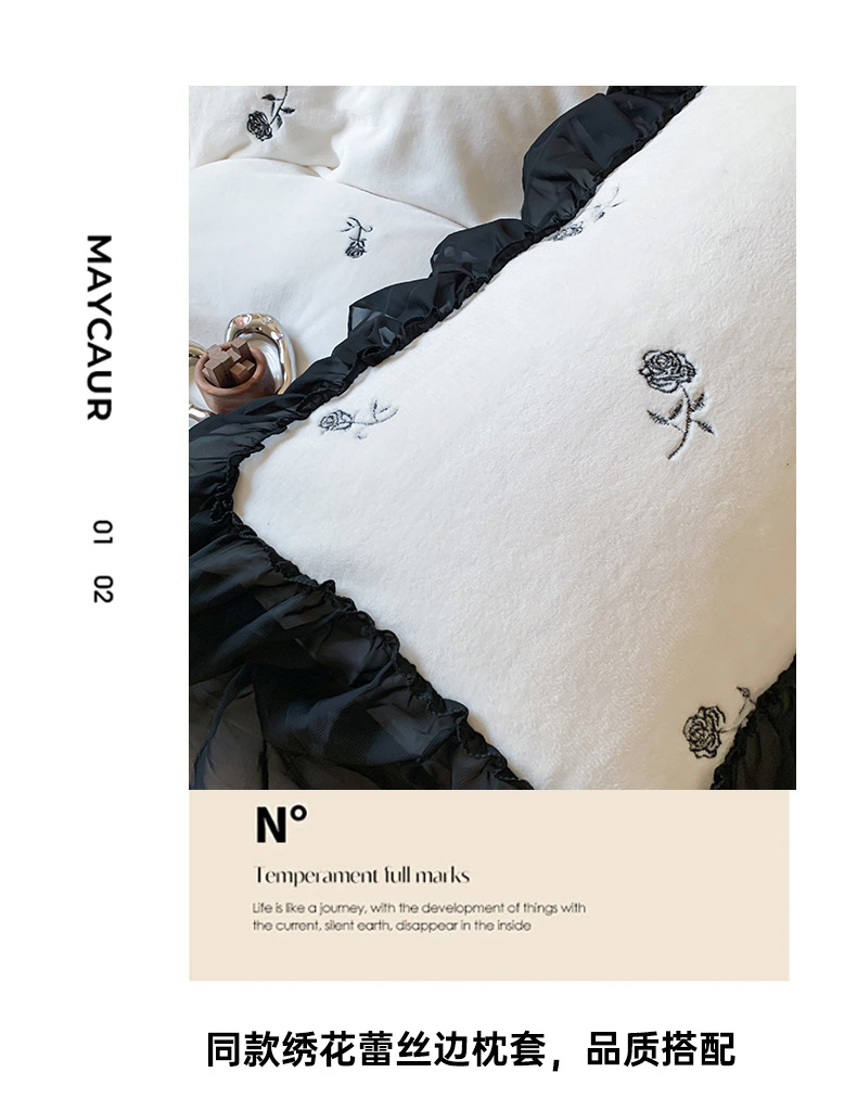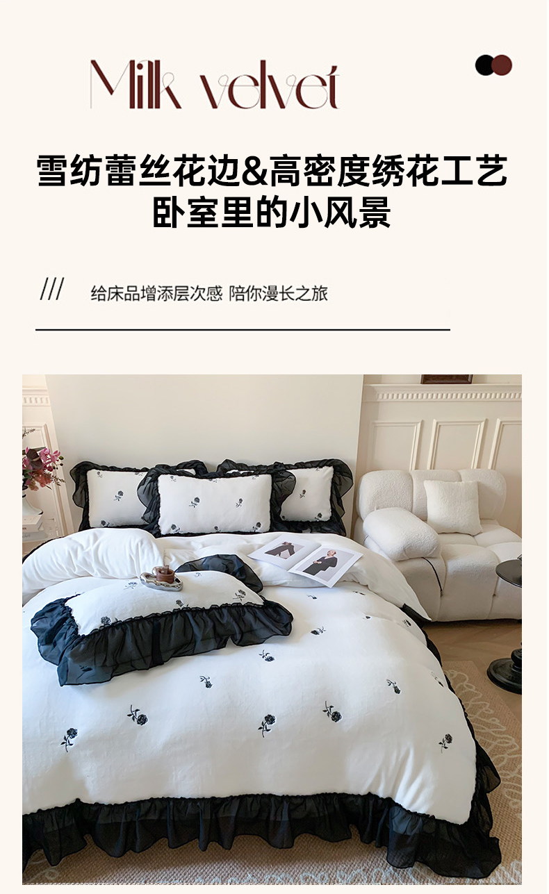 当前位置: 91家纺网 > 商品网购 > 床品套件 > 四件套 > 牛奶绒四件套 > 你好美丽 2025新款A类200克牛奶绒安娜满版刺绣花边四件套 安娜白黑