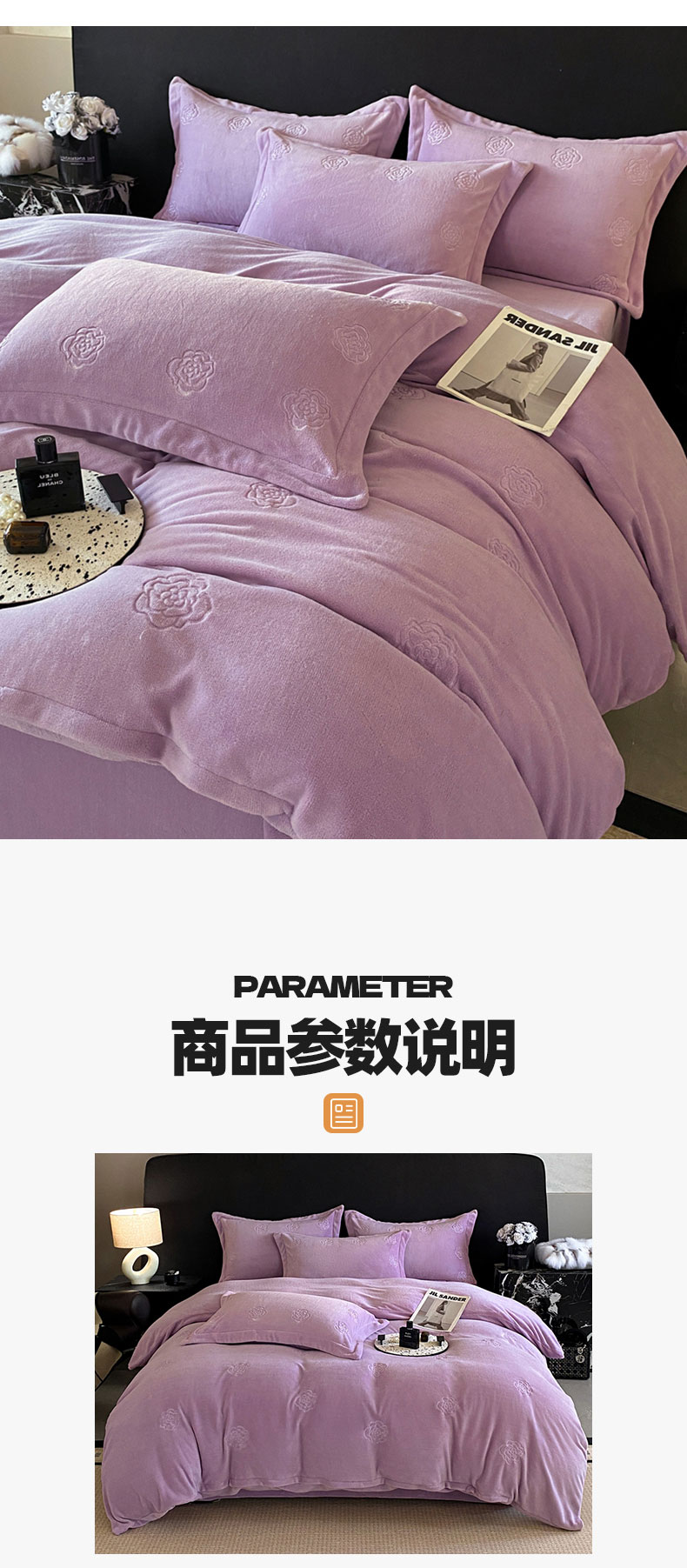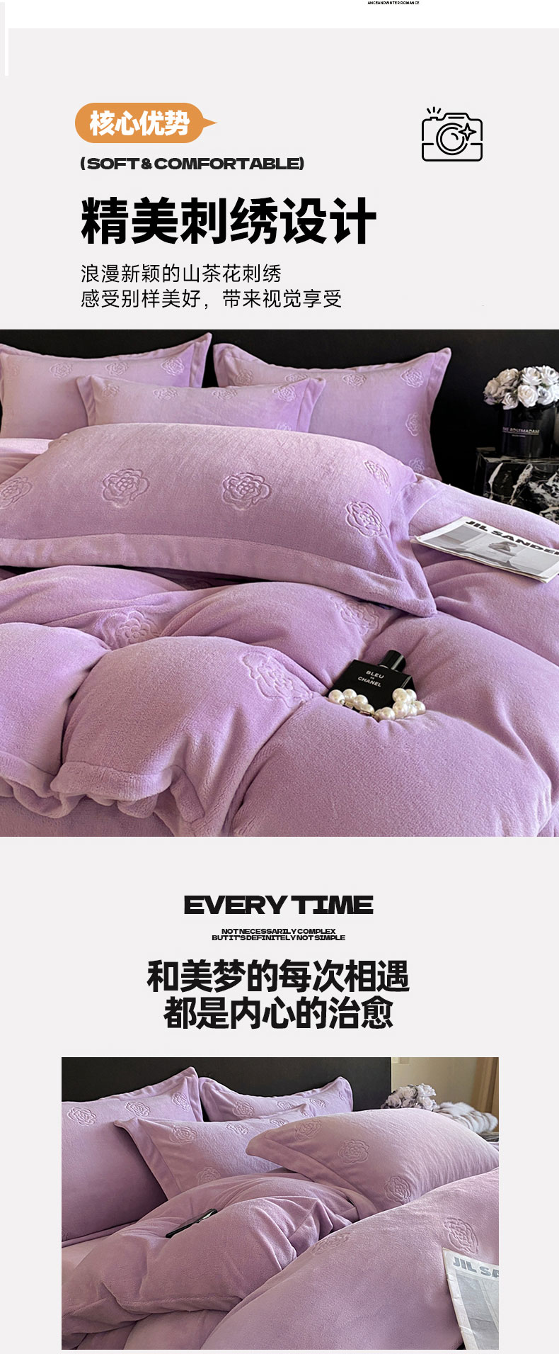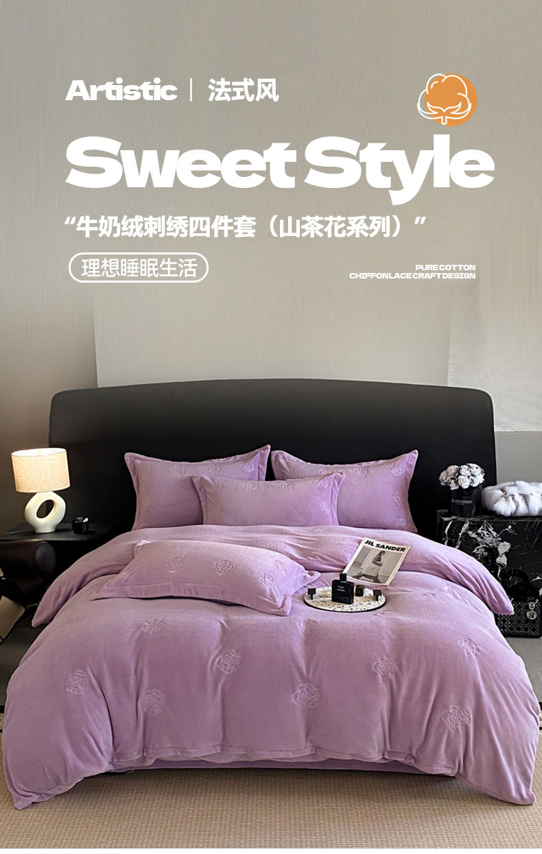 当前位置: 91家纺网 > 商品网购 > 床品套件 > 四件套 > 牛奶绒四件套 > 你好美丽 2025新款A类200克牛奶绒山茶花刺绣四件套 山茶花紫