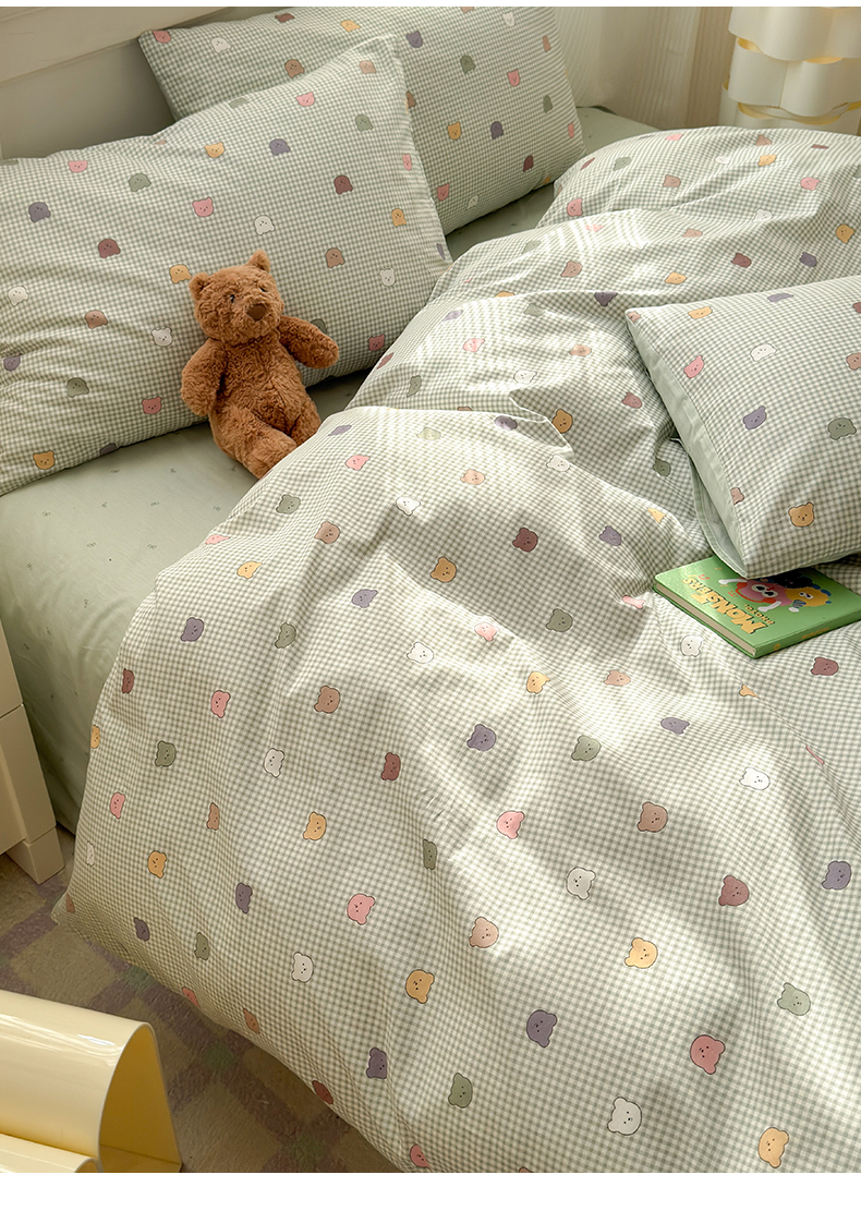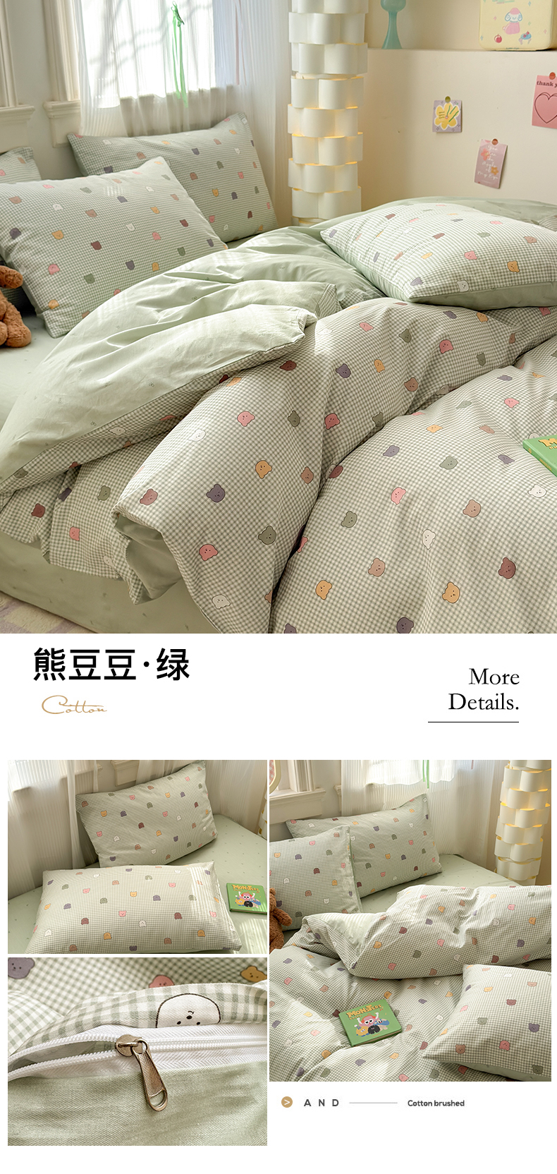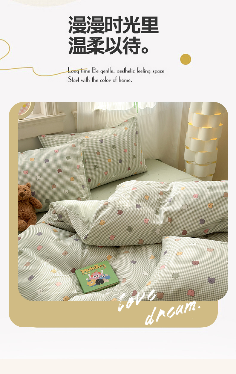 清雅福 2025全棉13372小清新四件套和单被套早春系列第二批--单枕套 熊豆豆·绿