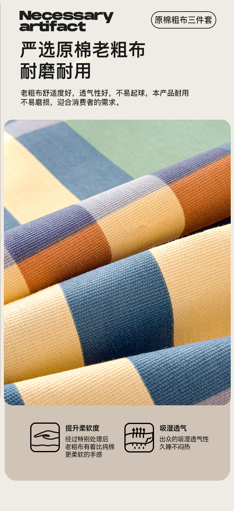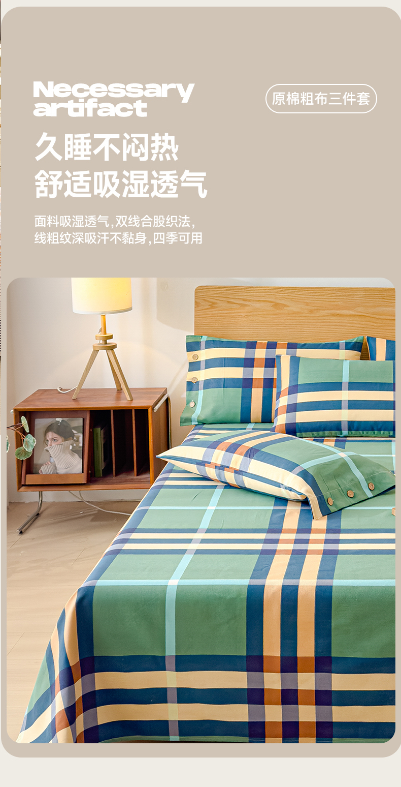 仟网汇 2025新款活性印染无印纽扣原棉老粗布三件套 清雅灰