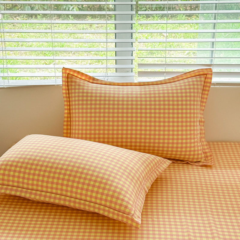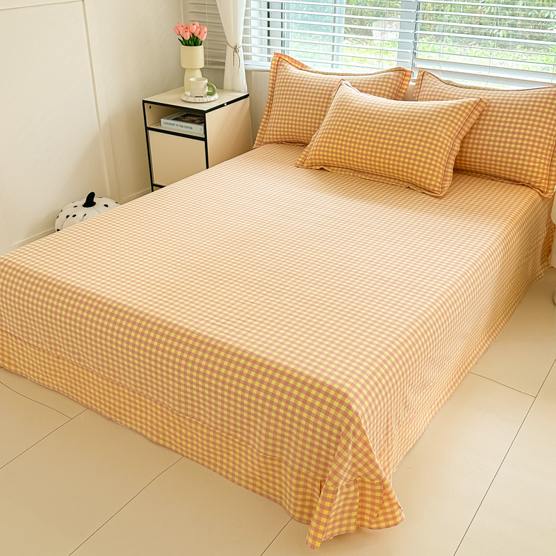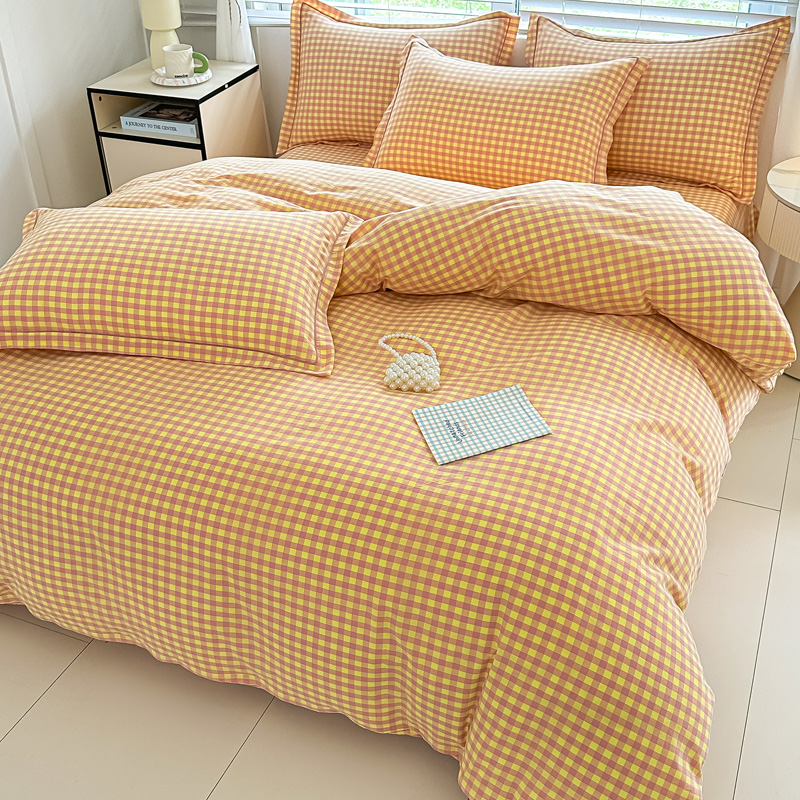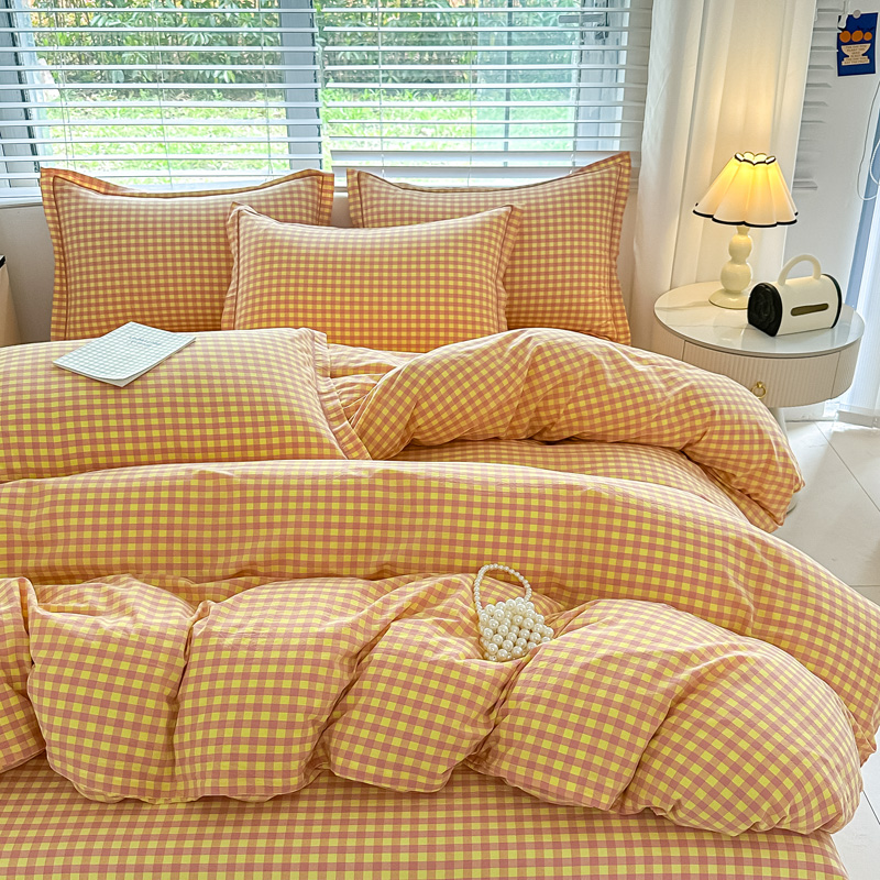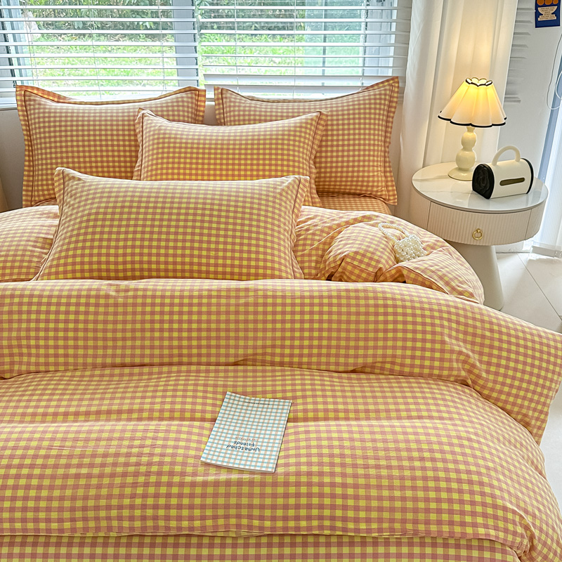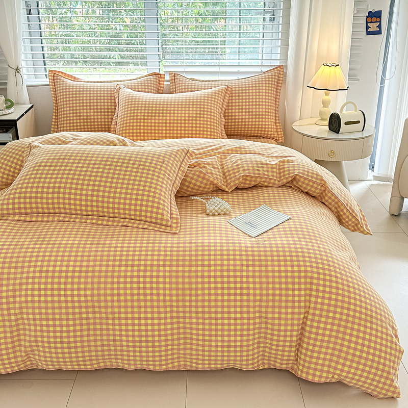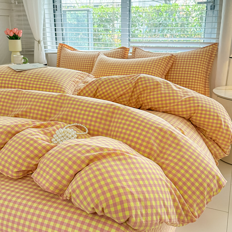 侯先生家纺 2025新款全棉色织四件套纯棉被套床单四季款格子三件套 黄粉小格