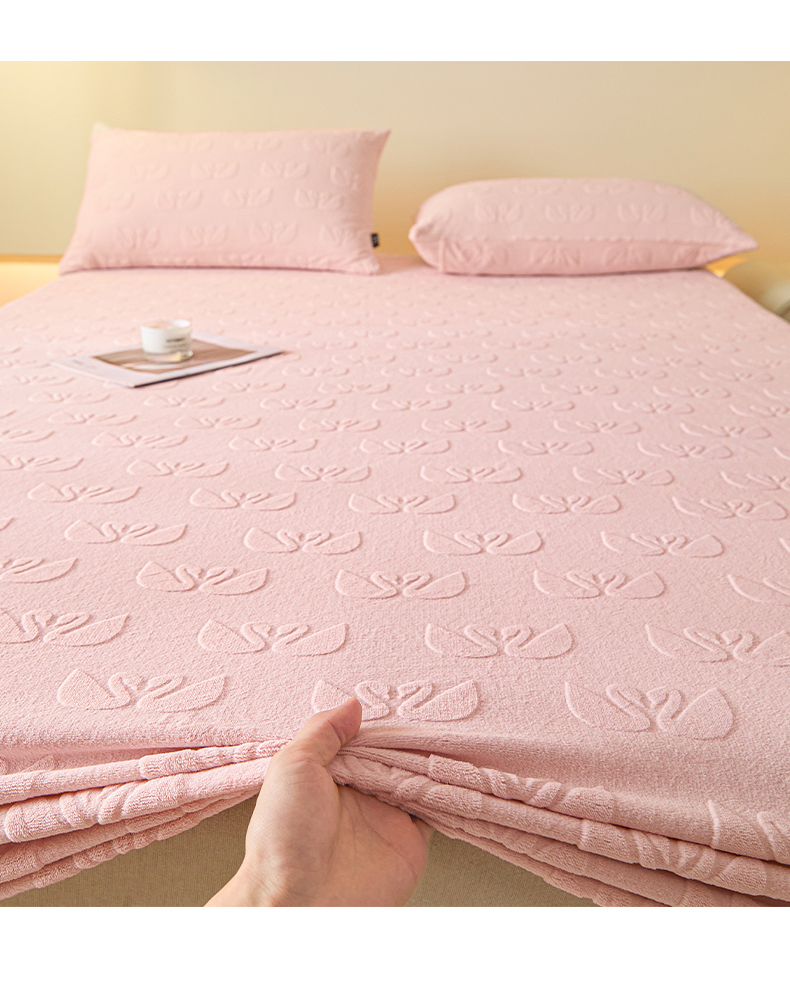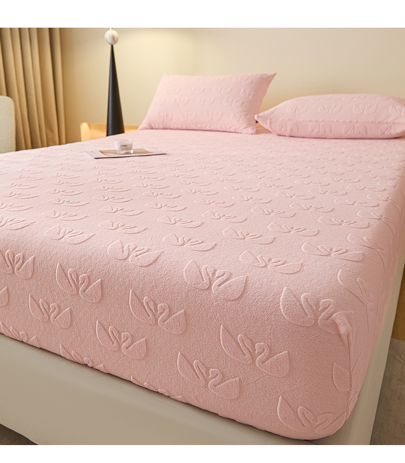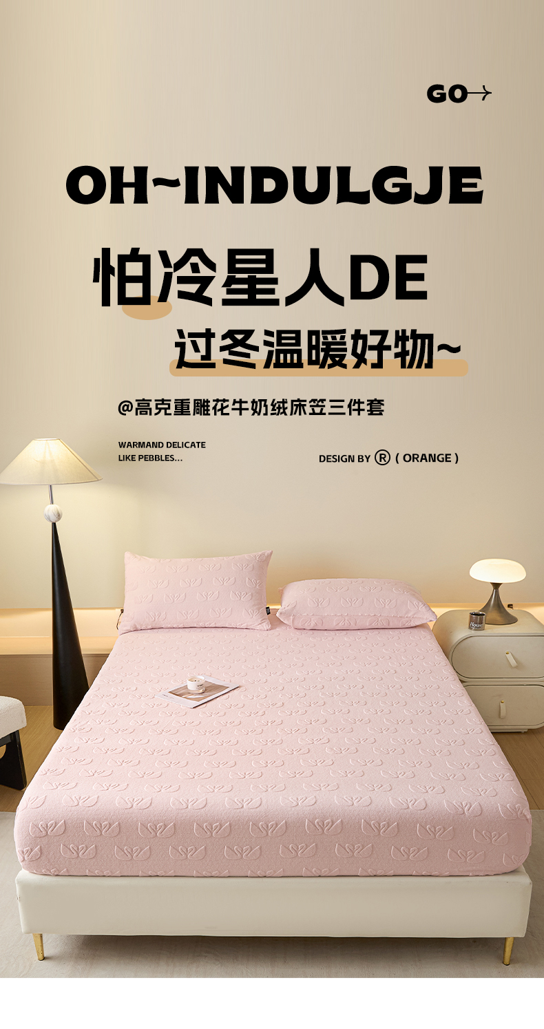 乐美家纺 2025新款A类高克重牛奶绒雕花床笠三件套 天鹅湖畔(粉)