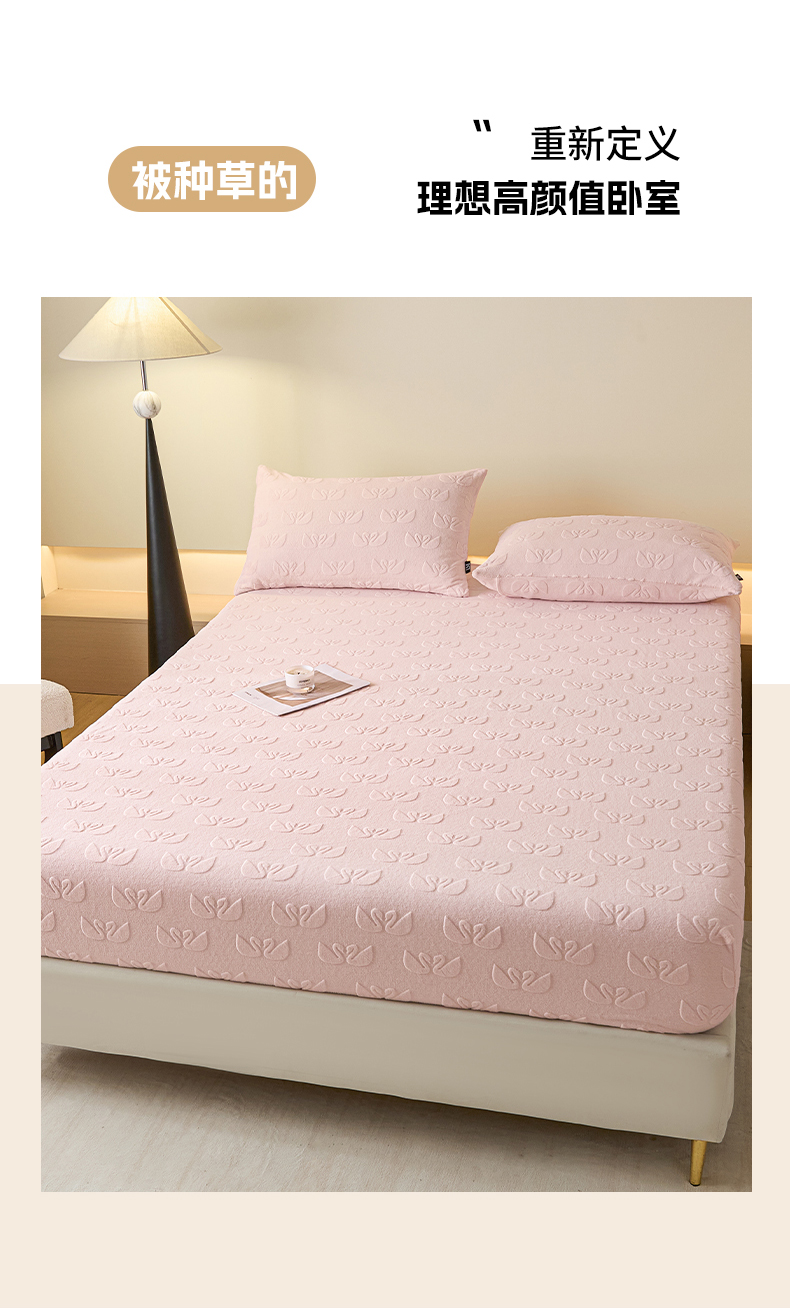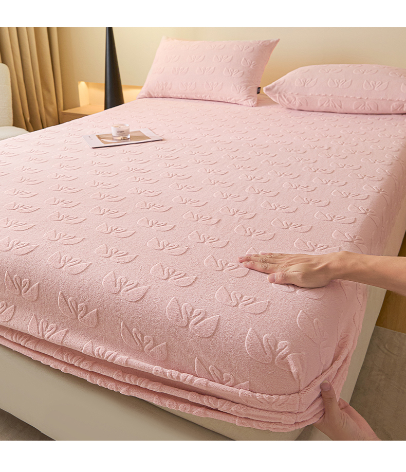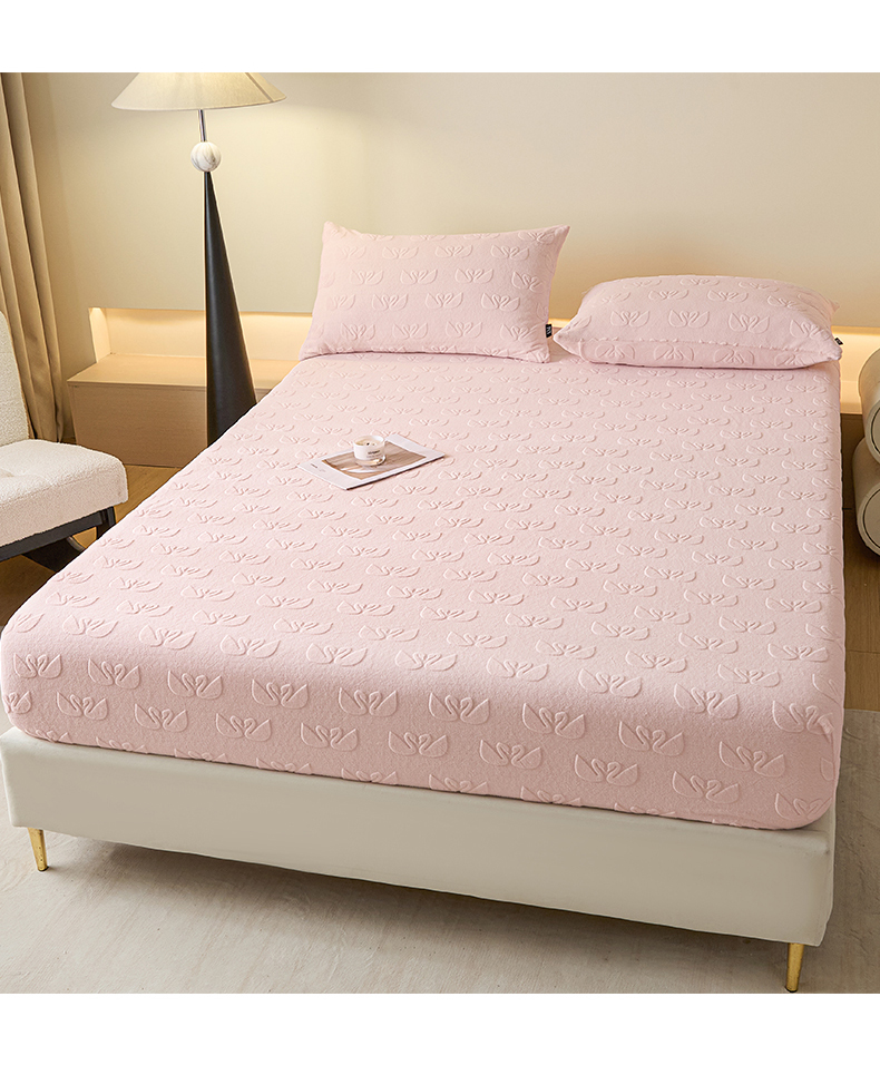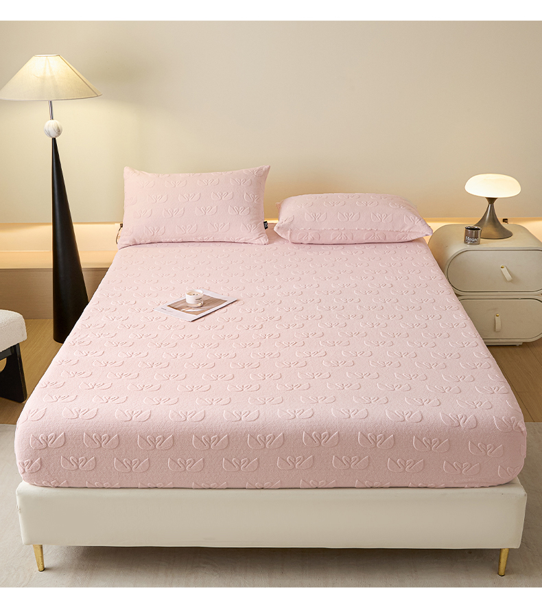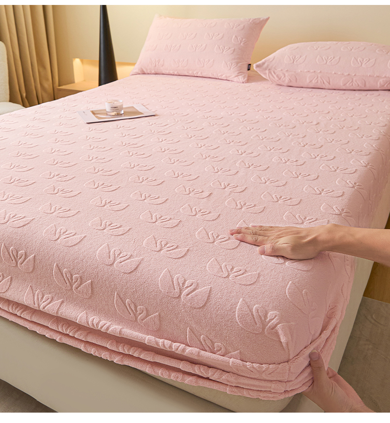 • 91家纺网 家纺一手货源 找家纺 乐美家纺 2025新款A类高克重牛奶绒雕花床笠三件套 天鹅湖畔(粉)