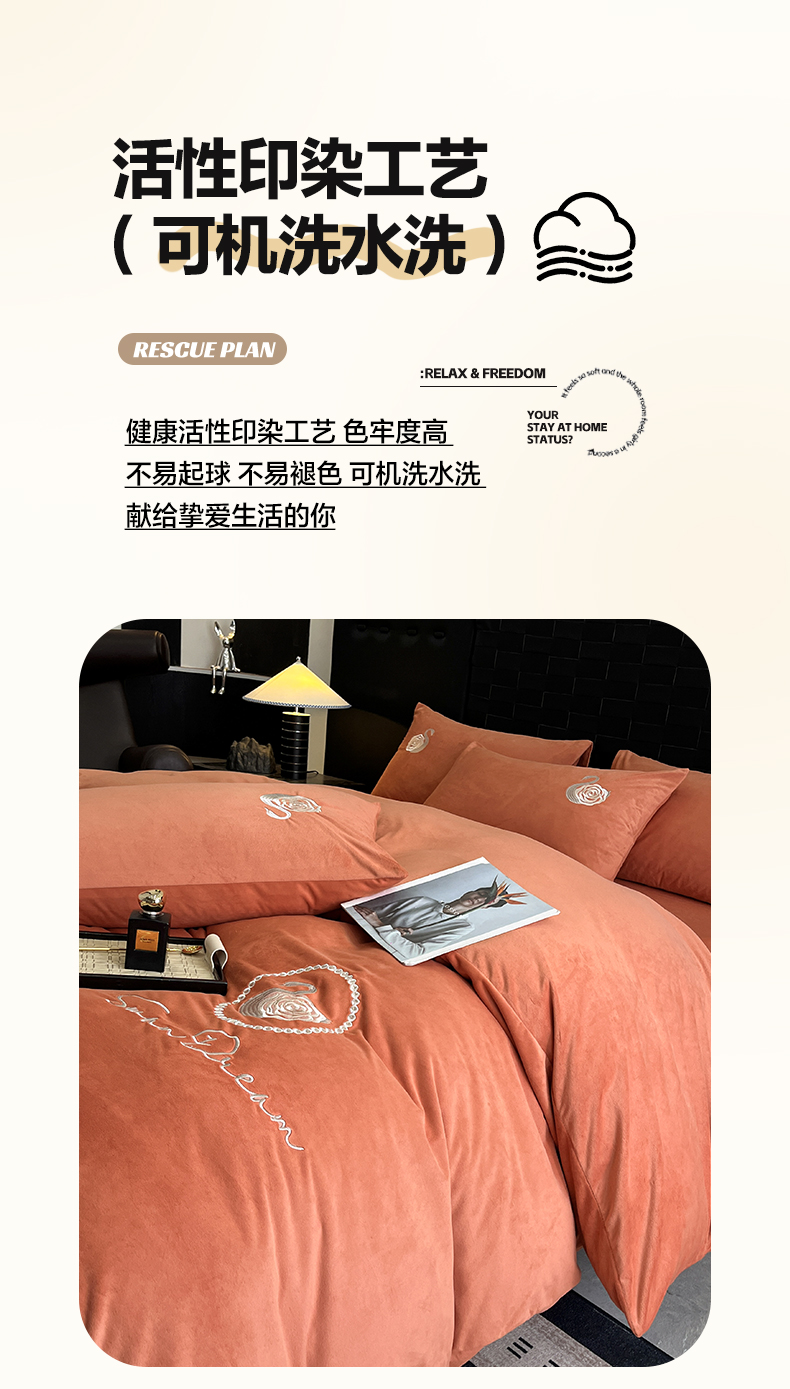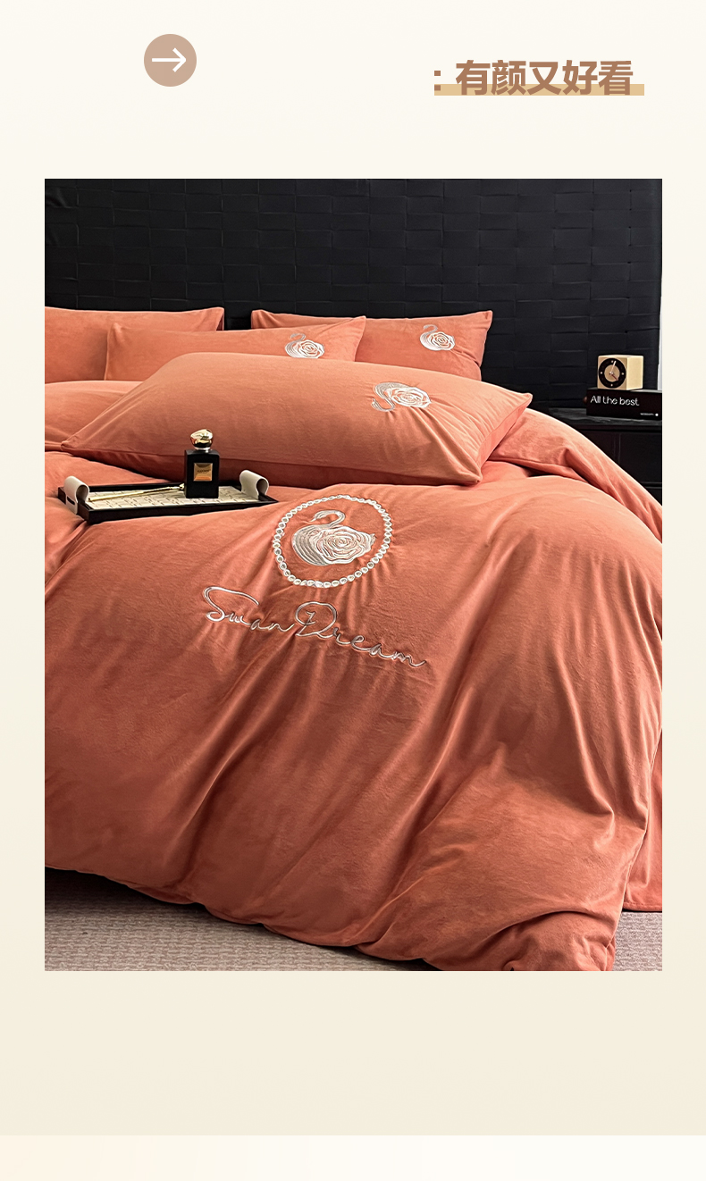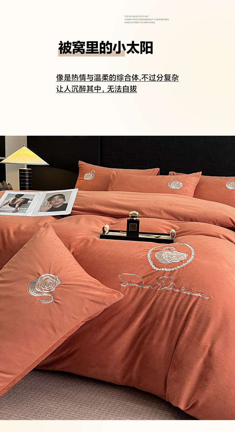 当前位置: 91家纺网 > 商品网购 > 床品套件 > 四件套 > 水晶绒四件套 > 如一 2025新款水晶绒刺绣四件套 天鹅-魅力橙