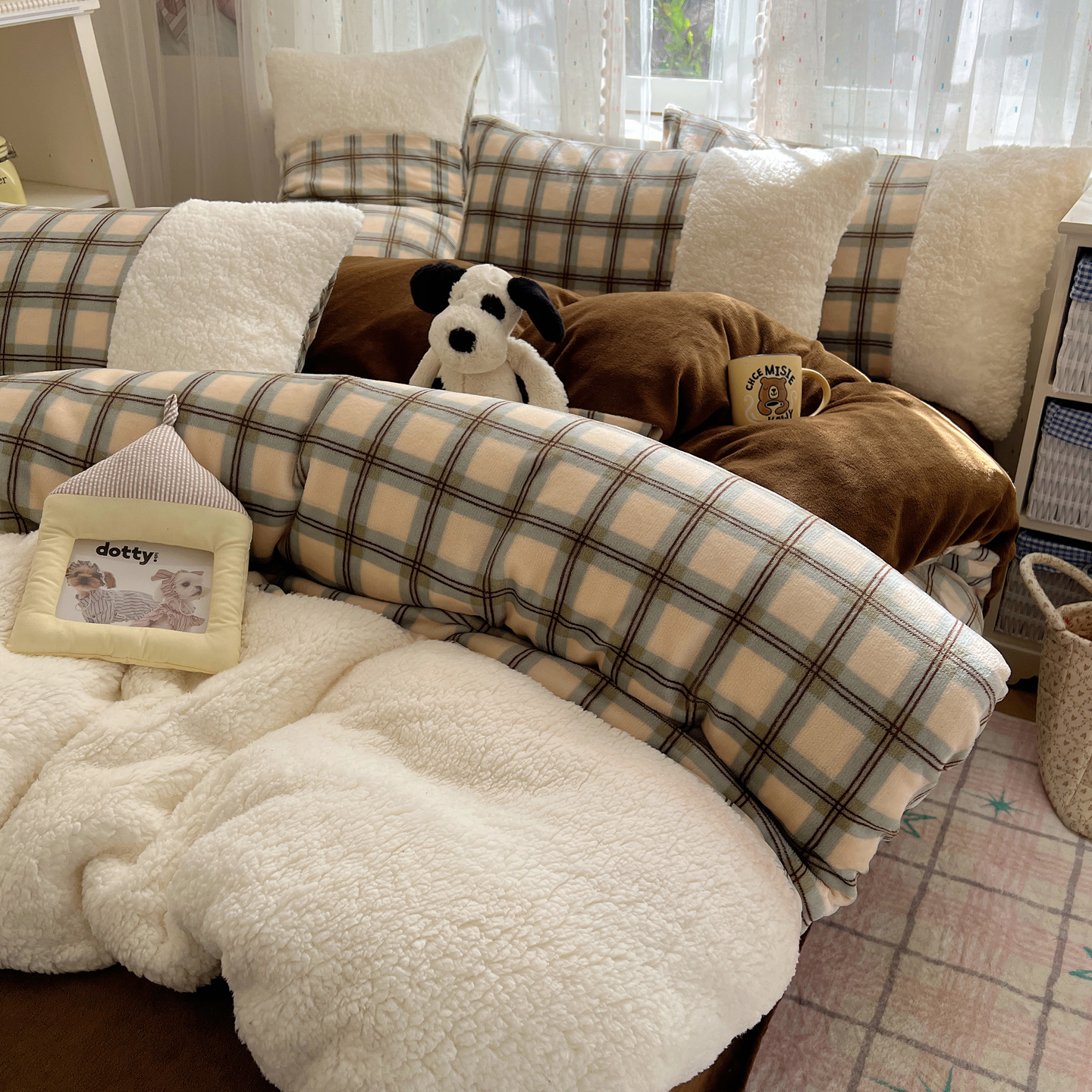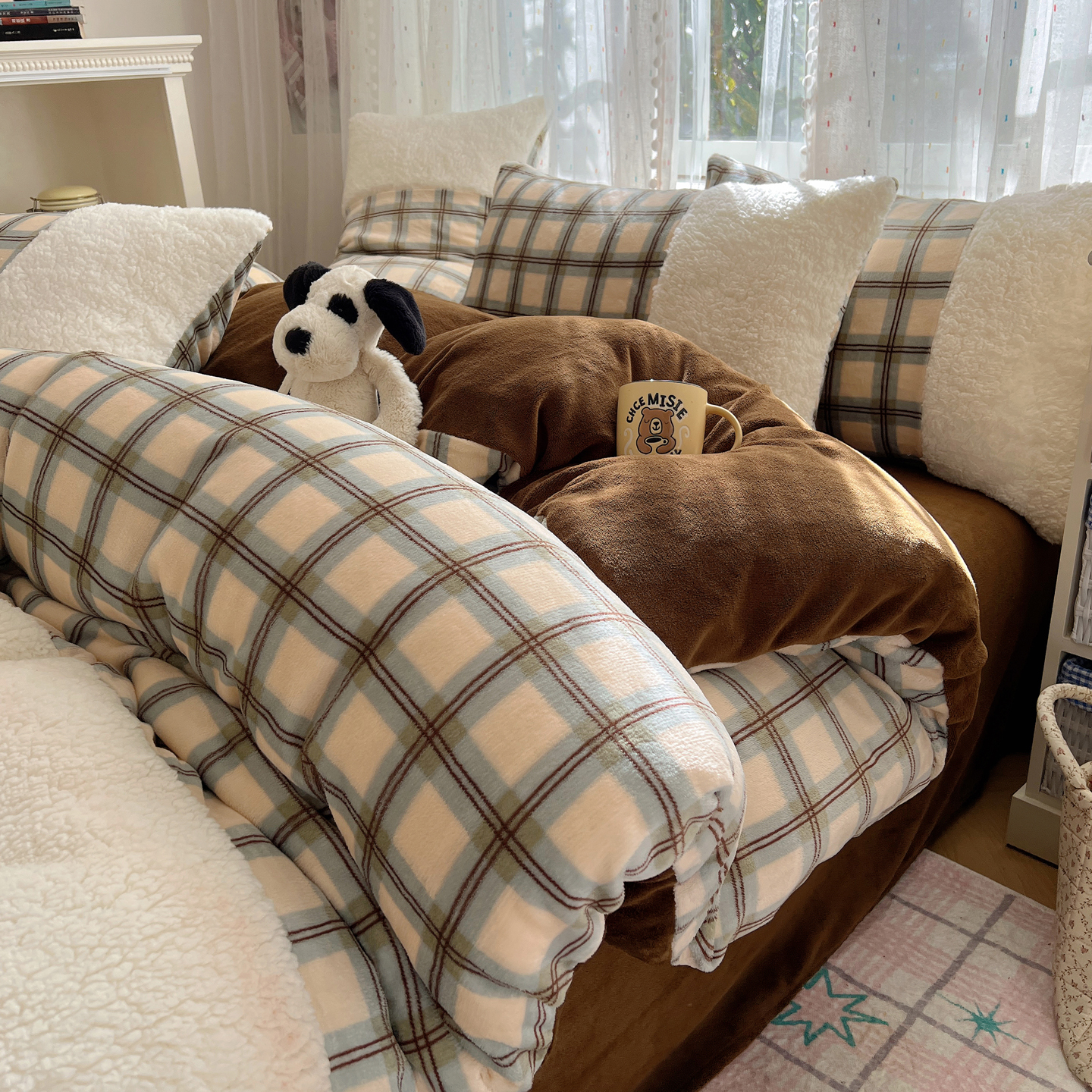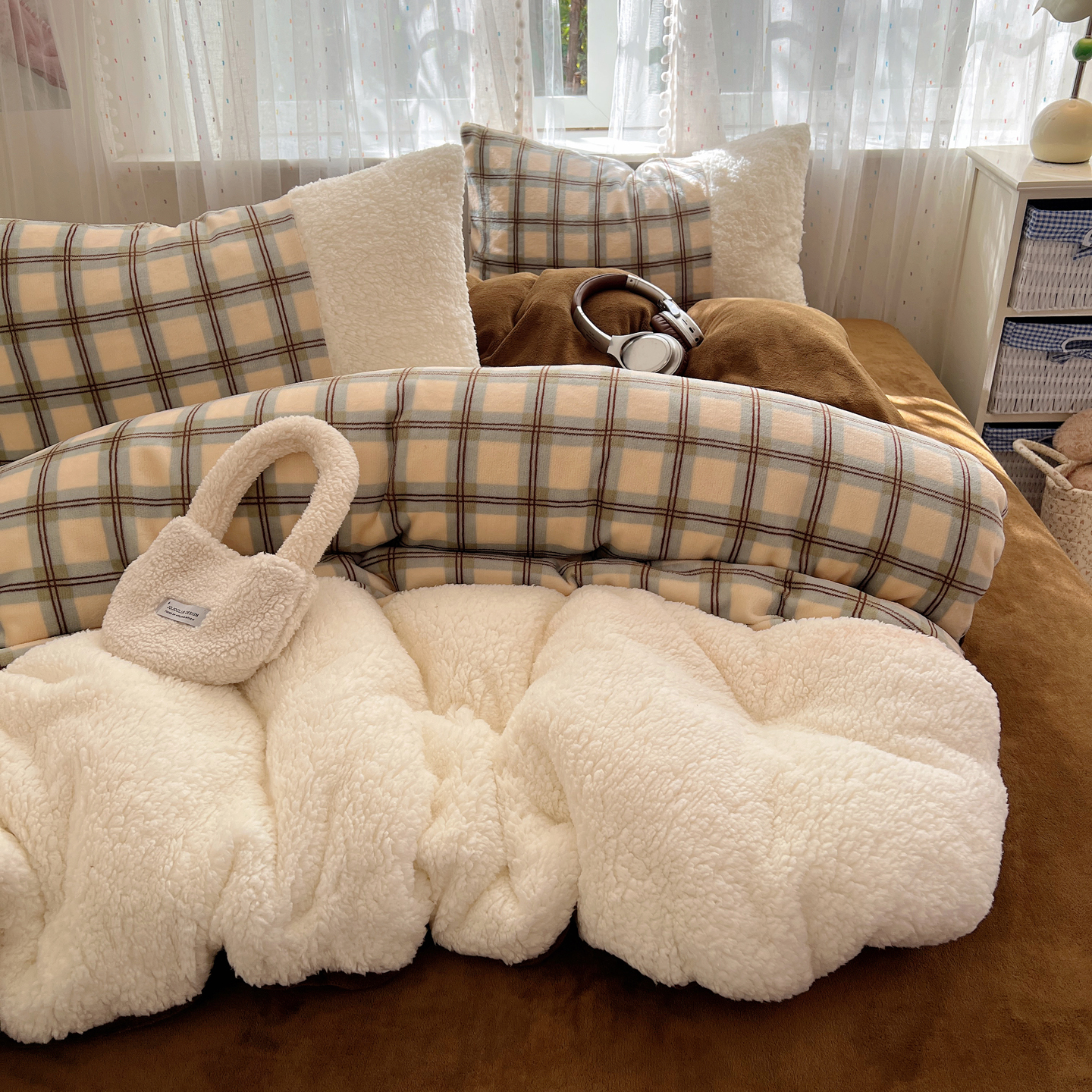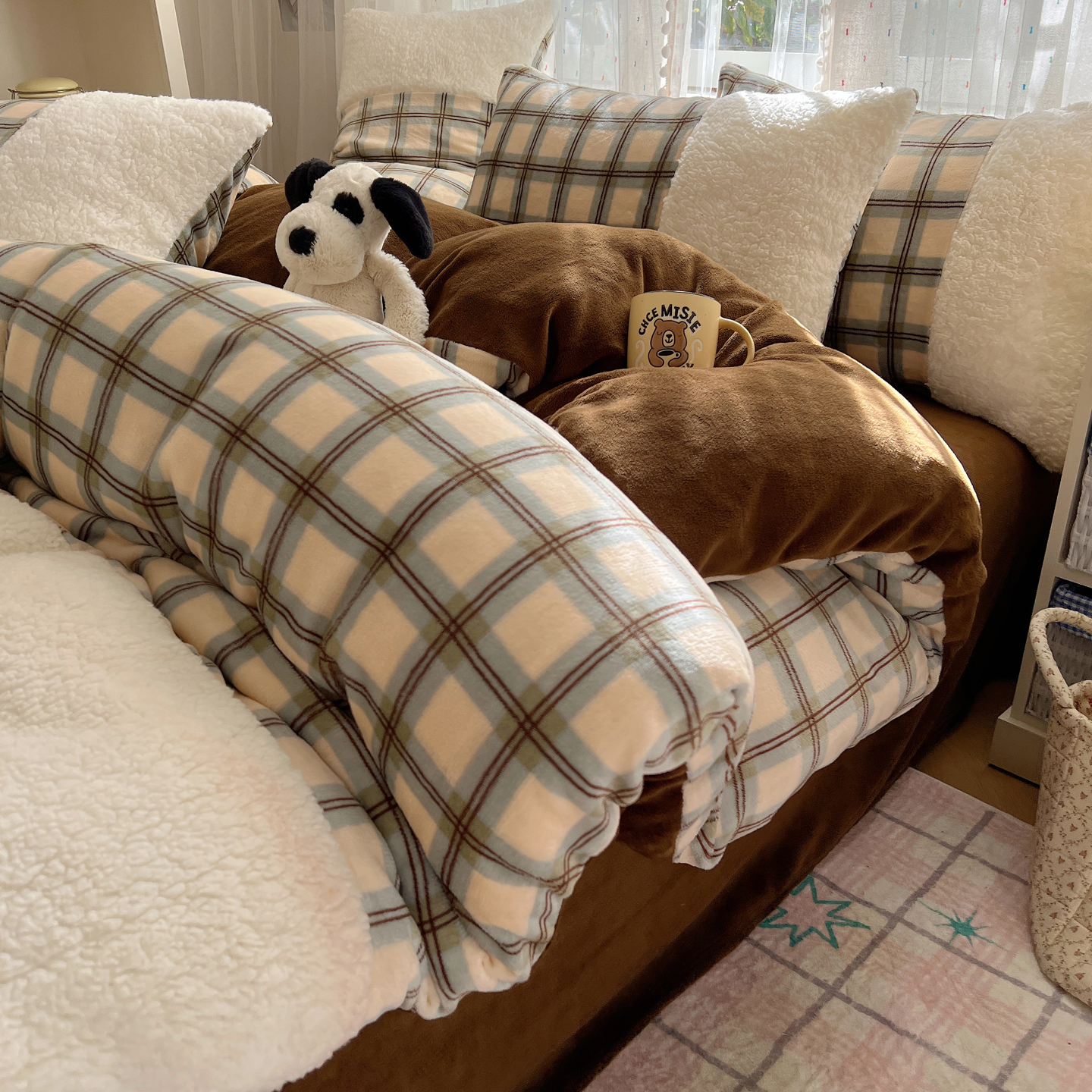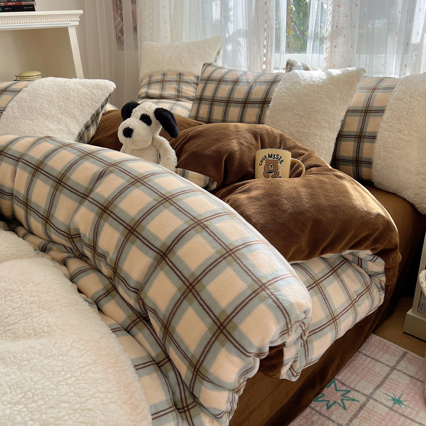 顾里家纺 2025新款复古博主风高克重羊羔毛拼接牛奶绒套件 松露奶昔