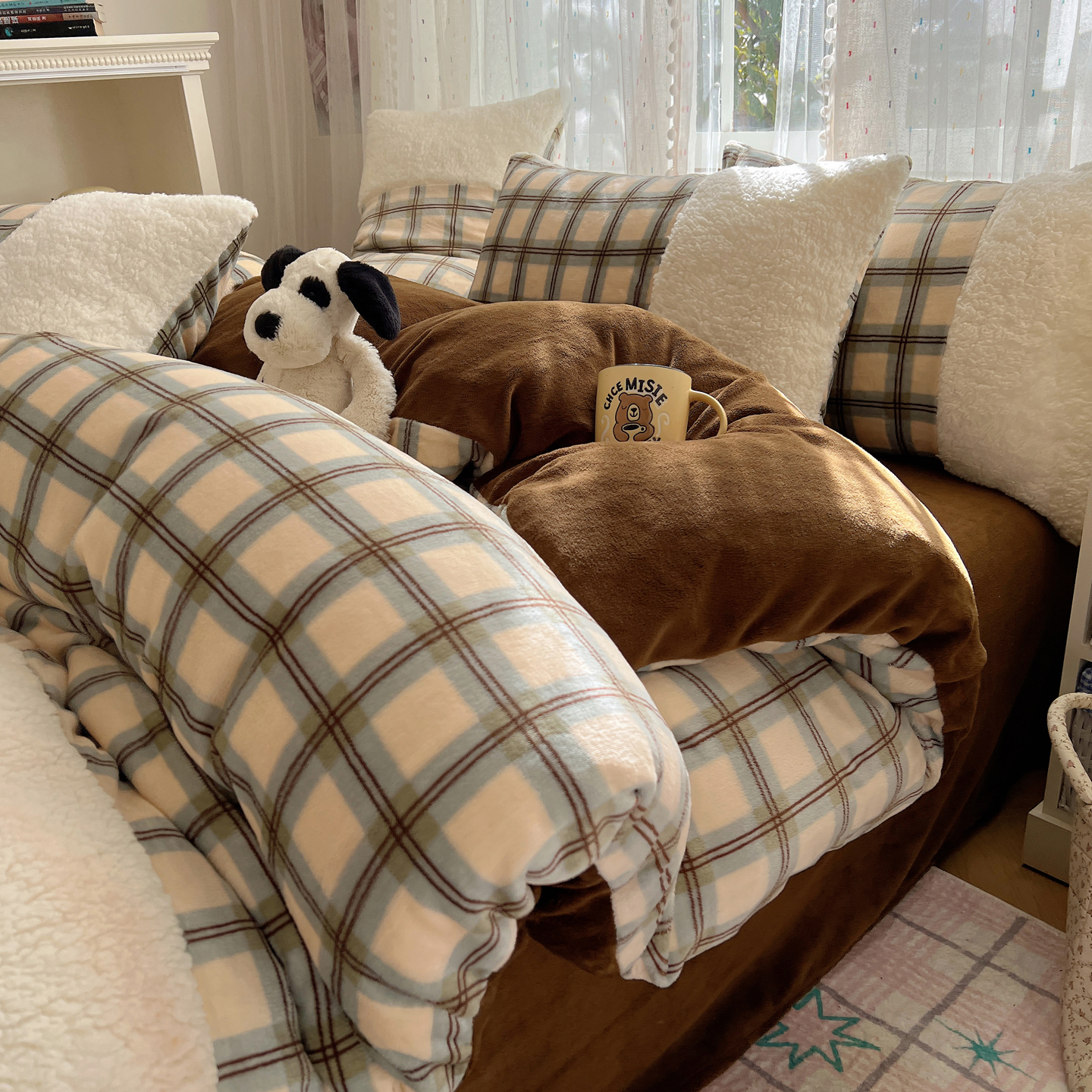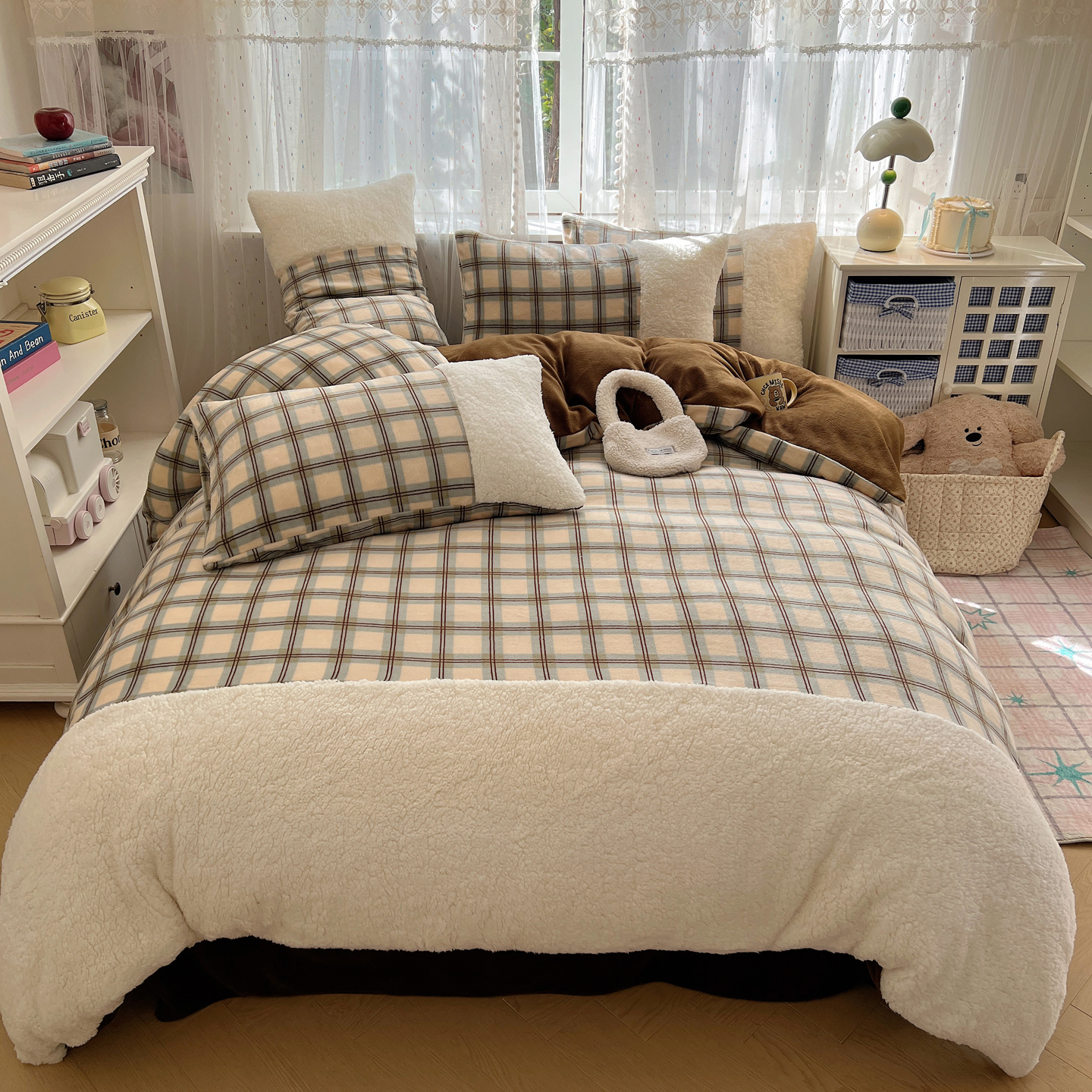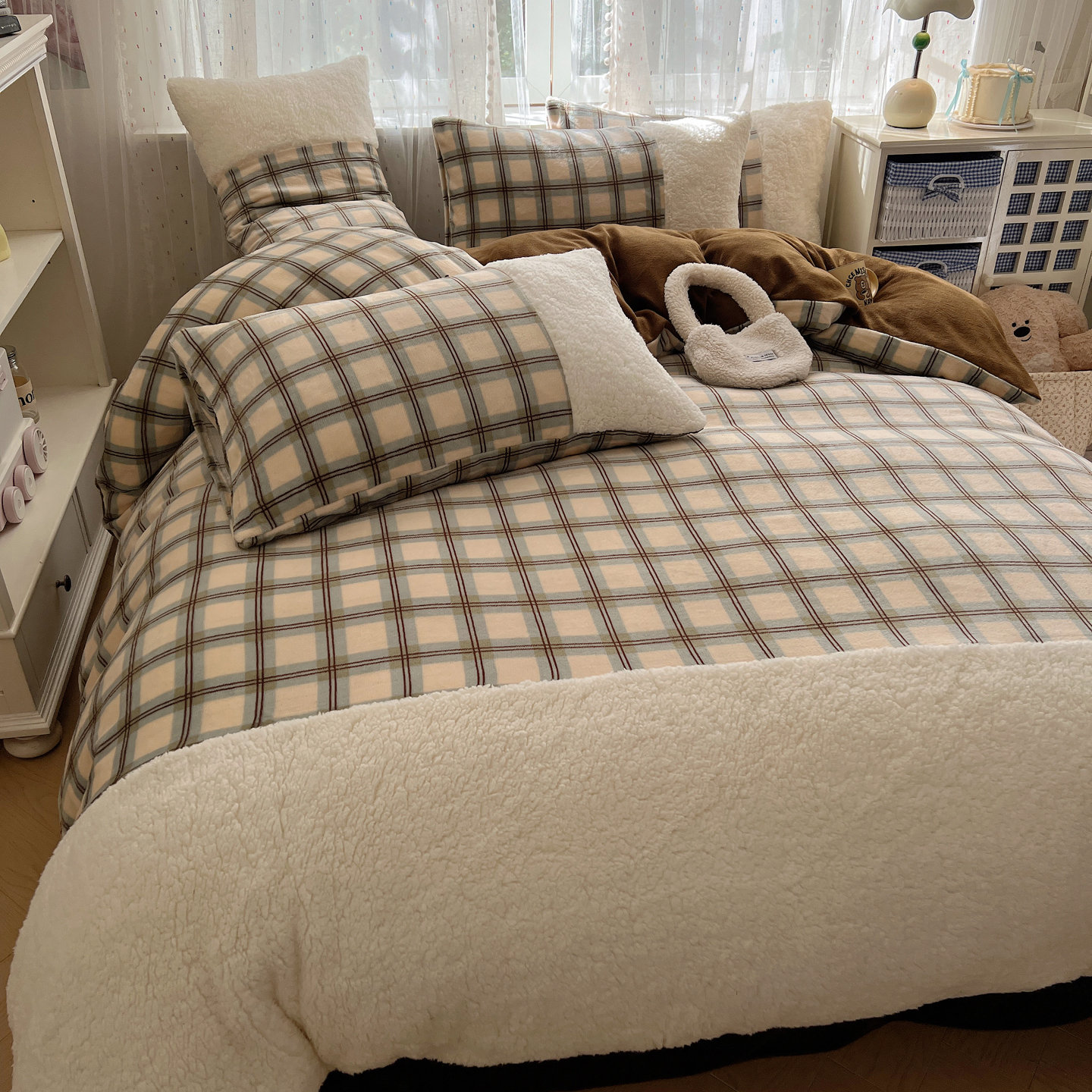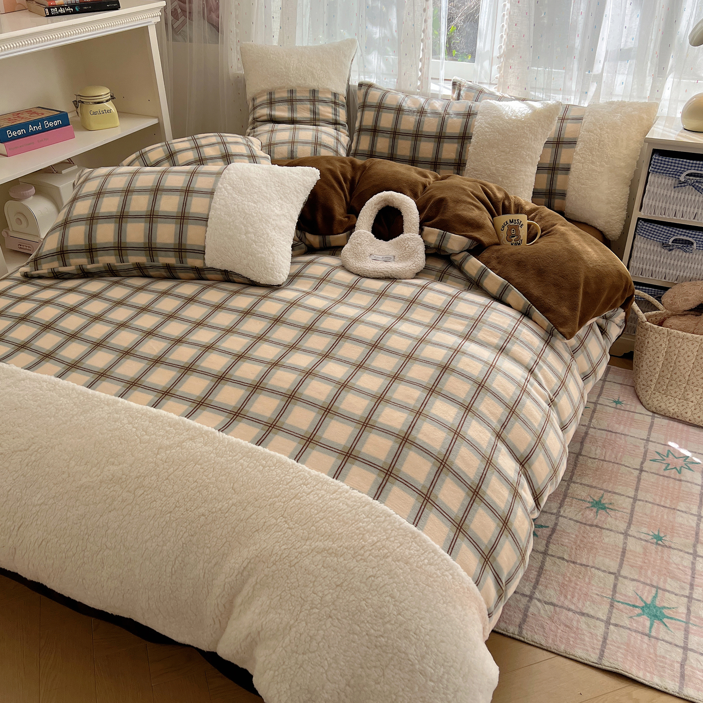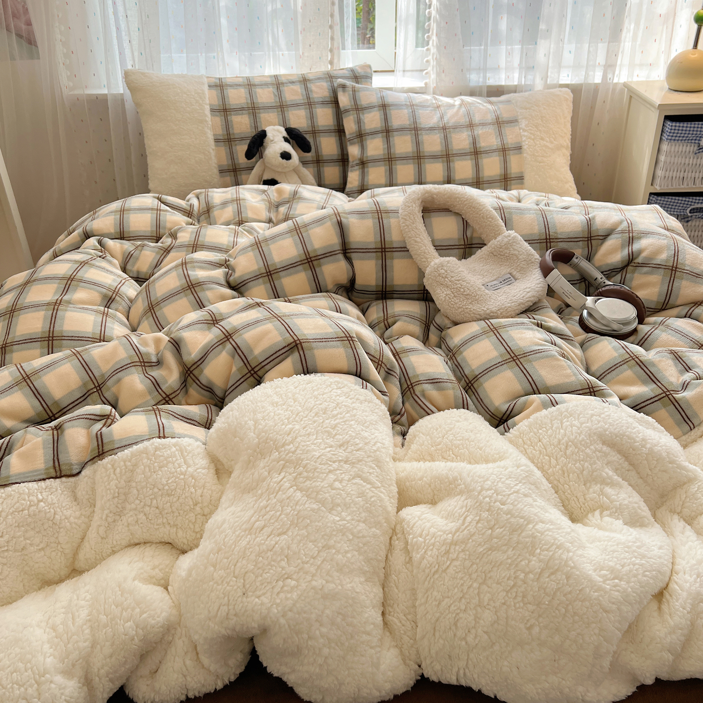 顾里家纺 2025新款复古博主风高克重羊羔毛拼接牛奶绒套件 松露奶昔