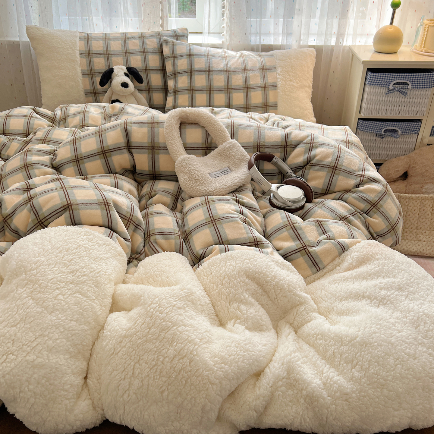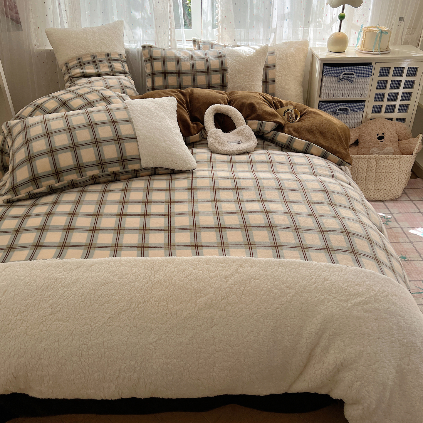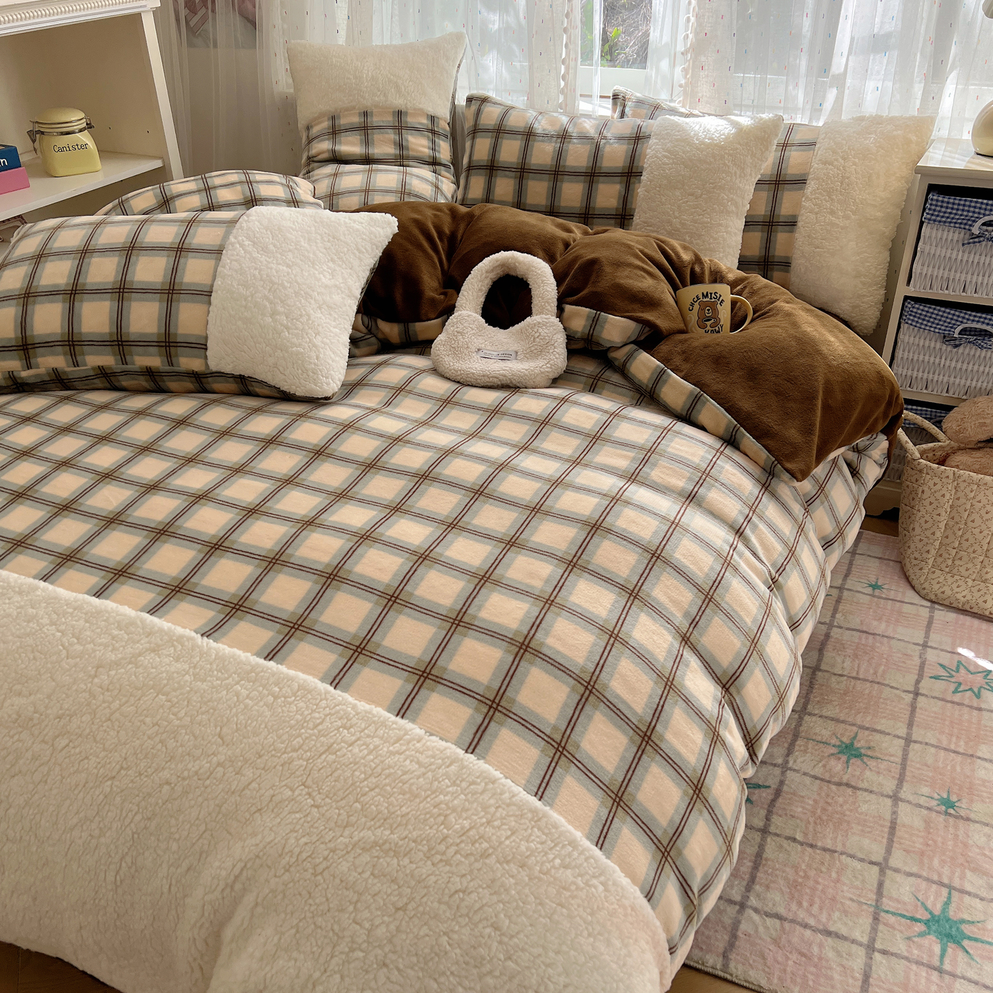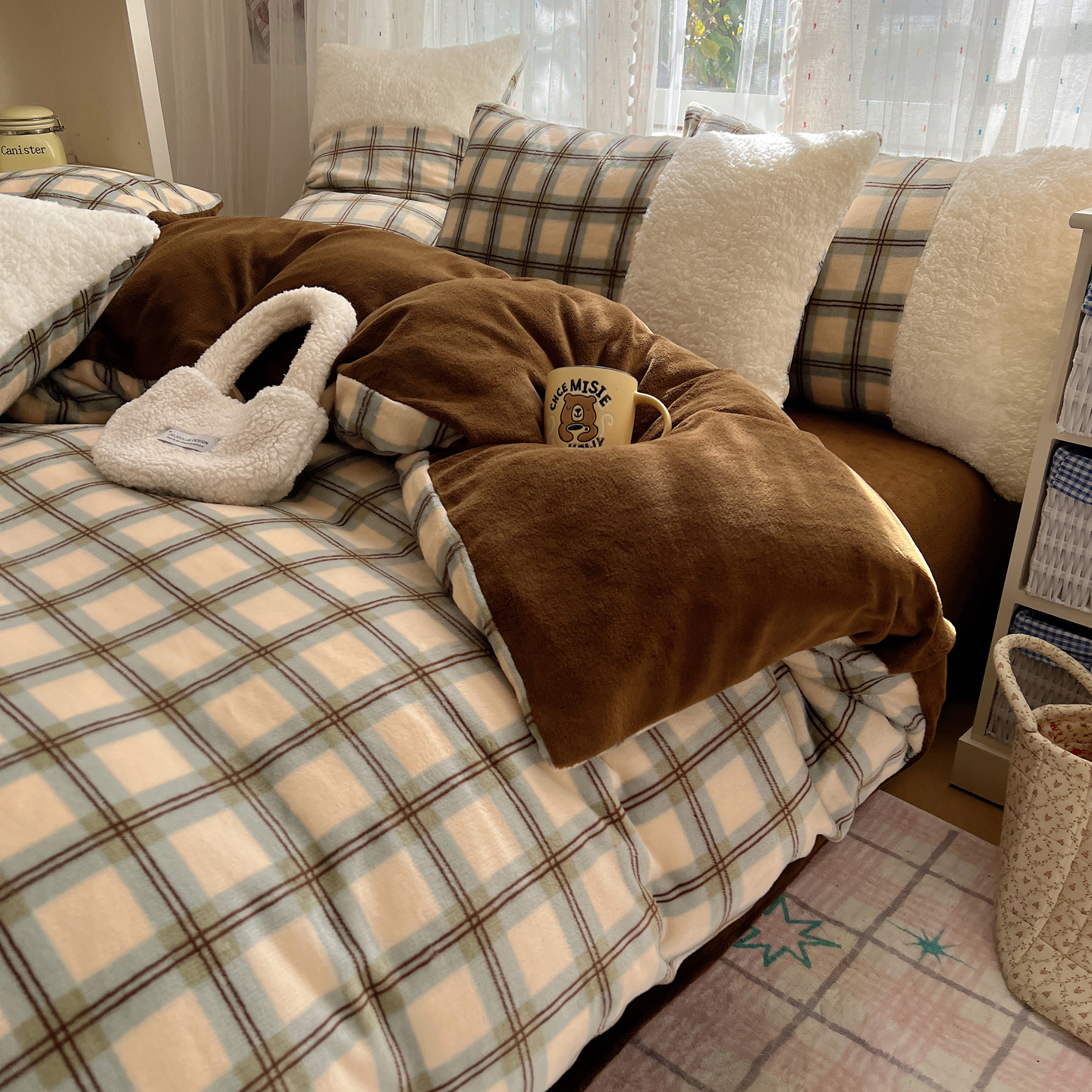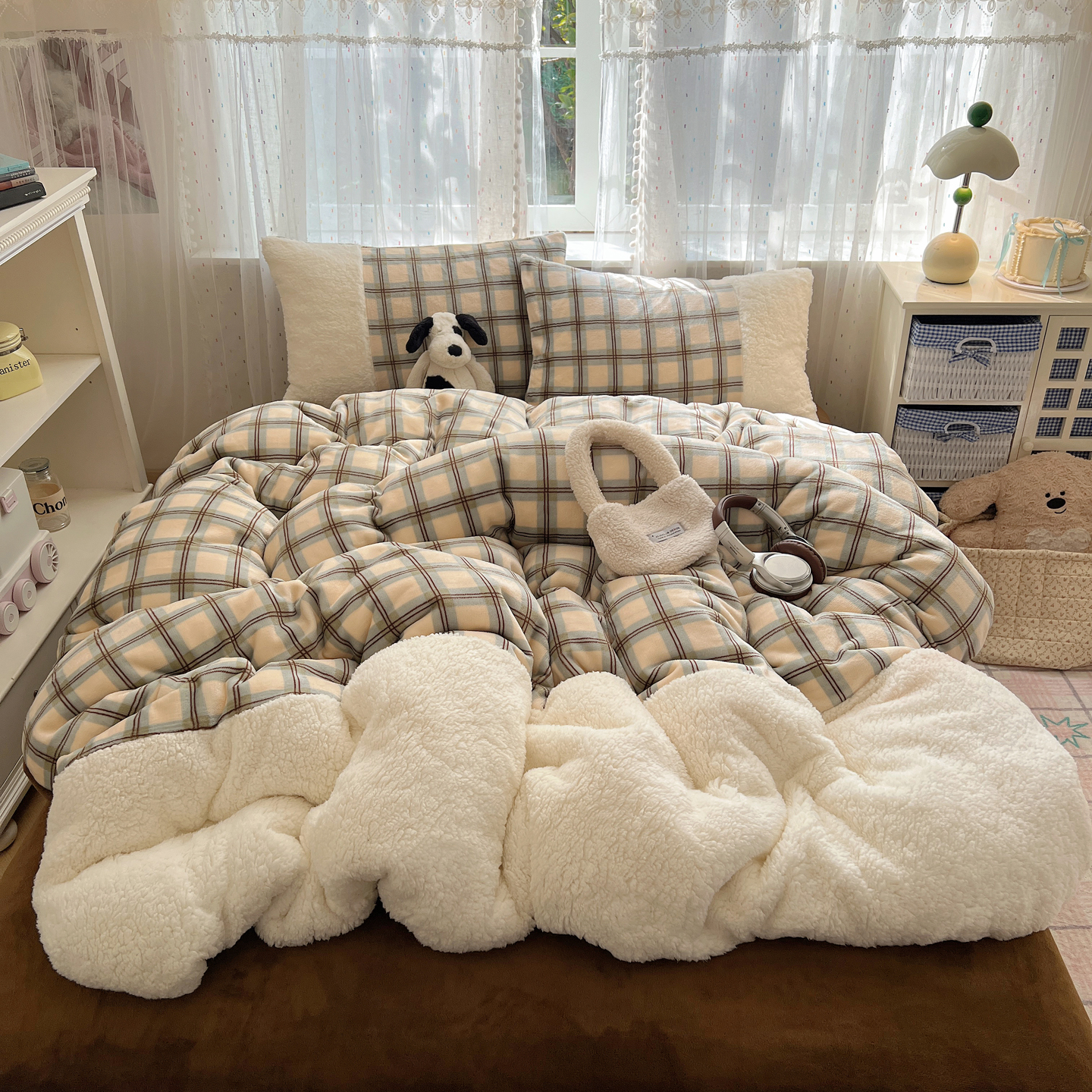 顾里家纺 2025新款复古博主风高克重羊羔毛拼接牛奶绒套件 松露奶昔