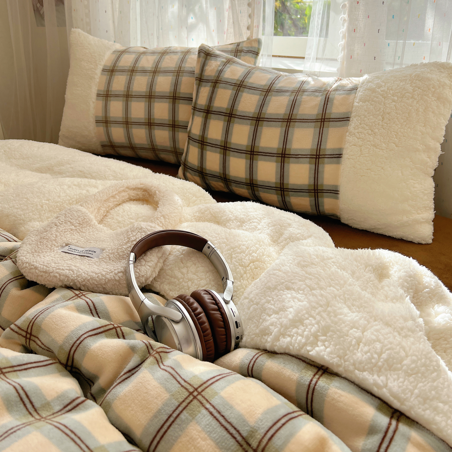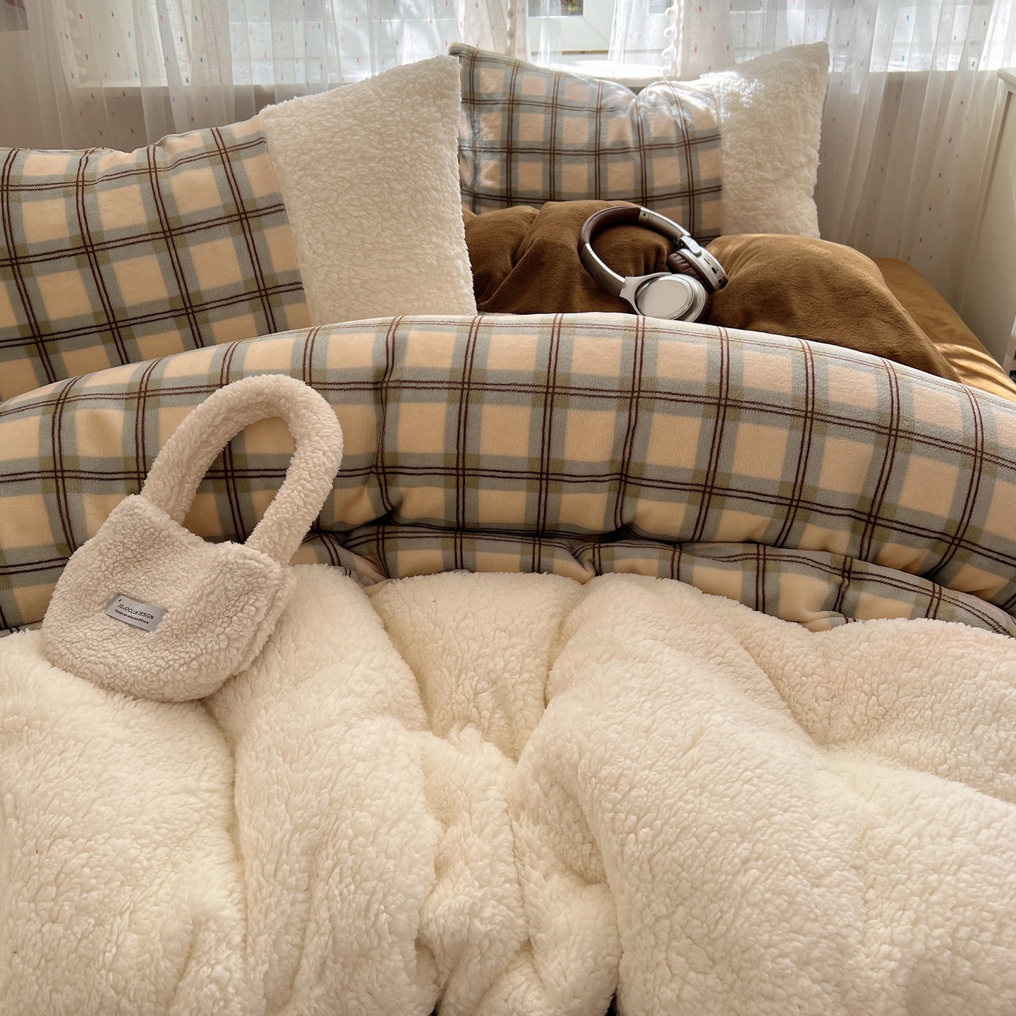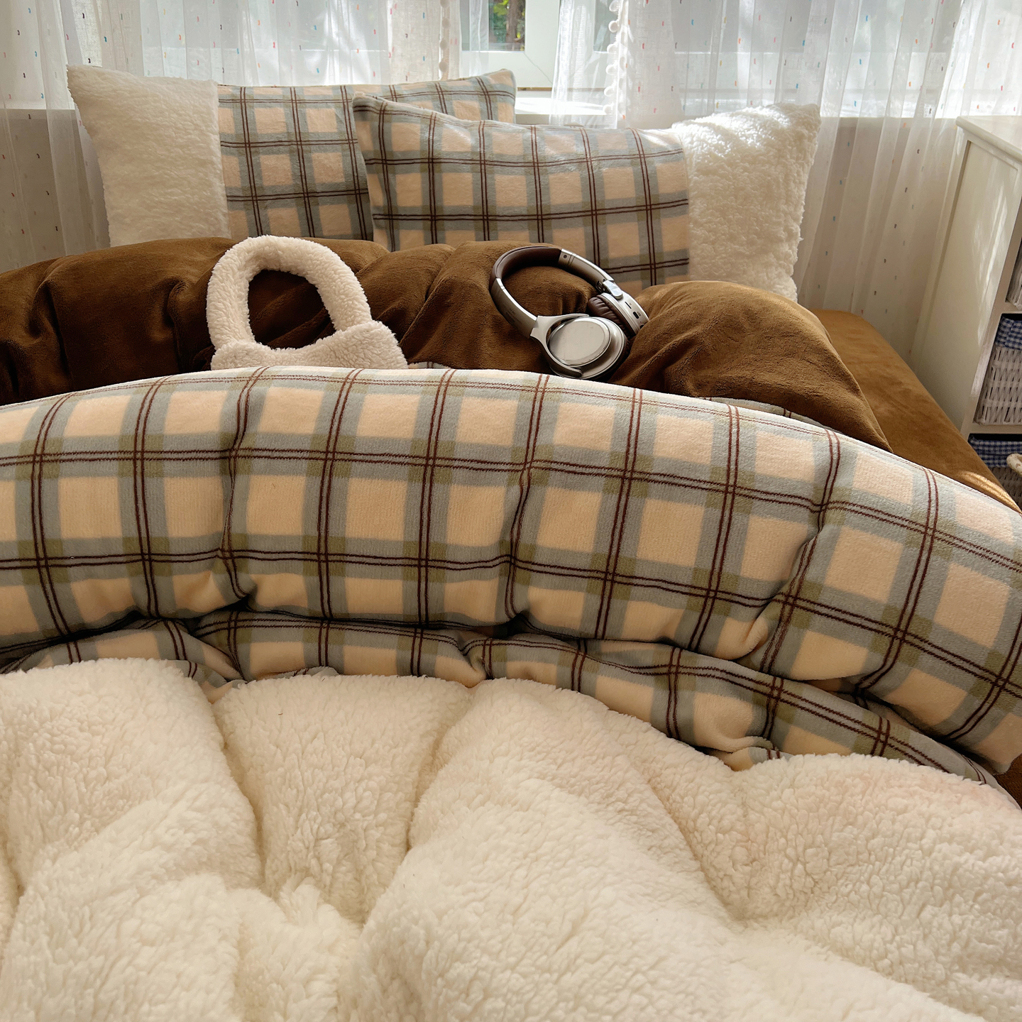 商品名称:顾里家纺 2025新款复古博主风高克重羊羔毛拼接牛奶绒套件 松露奶昔
