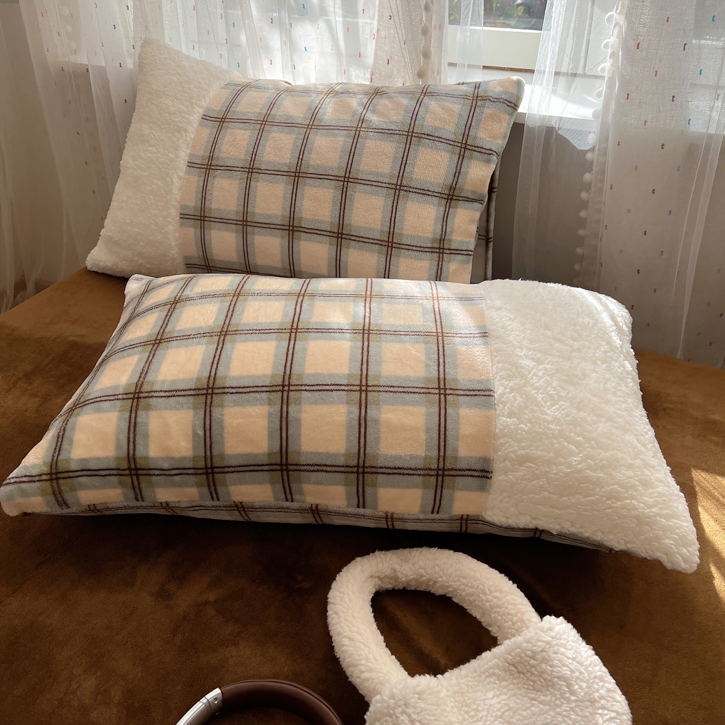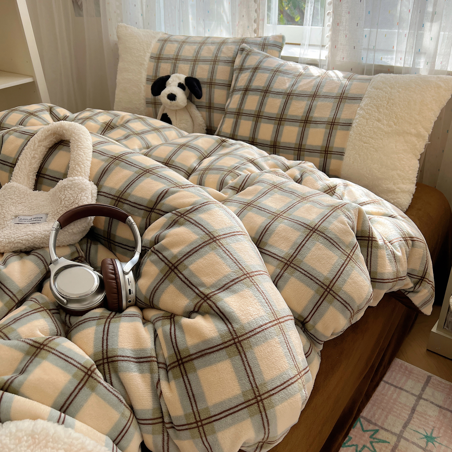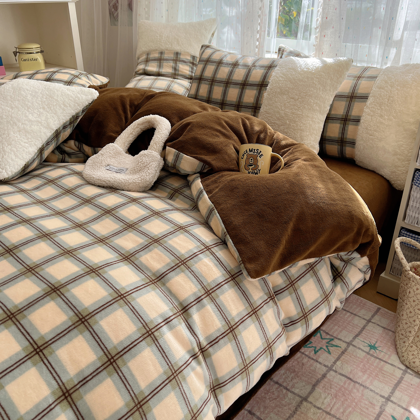 商品名称:顾里家纺 2025新款复古博主风高克重羊羔毛拼接牛奶绒套件 松露奶昔