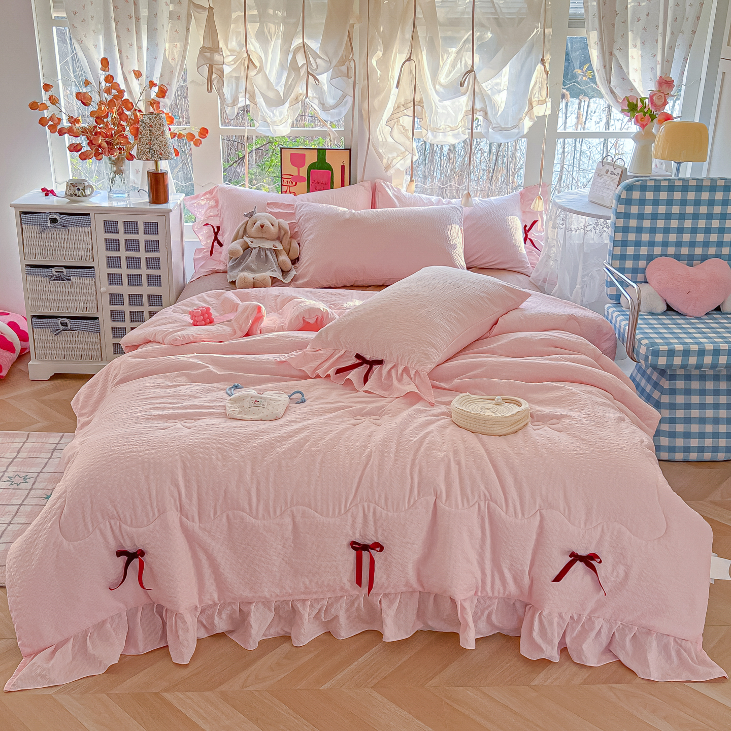 (总)爱彼家纺 2026春夏新款提花泡芙棉拼角蝴蝶结软乎乎的撸猫感单夏被夏被四件套-甜莓气泡,泡芙夏被-海盐蓝波点,泡芙夏被-奶粉波点,泡芙夏被--奶红波点,泡芙夏被--奶灰波点,组合图仅供参考不可下单