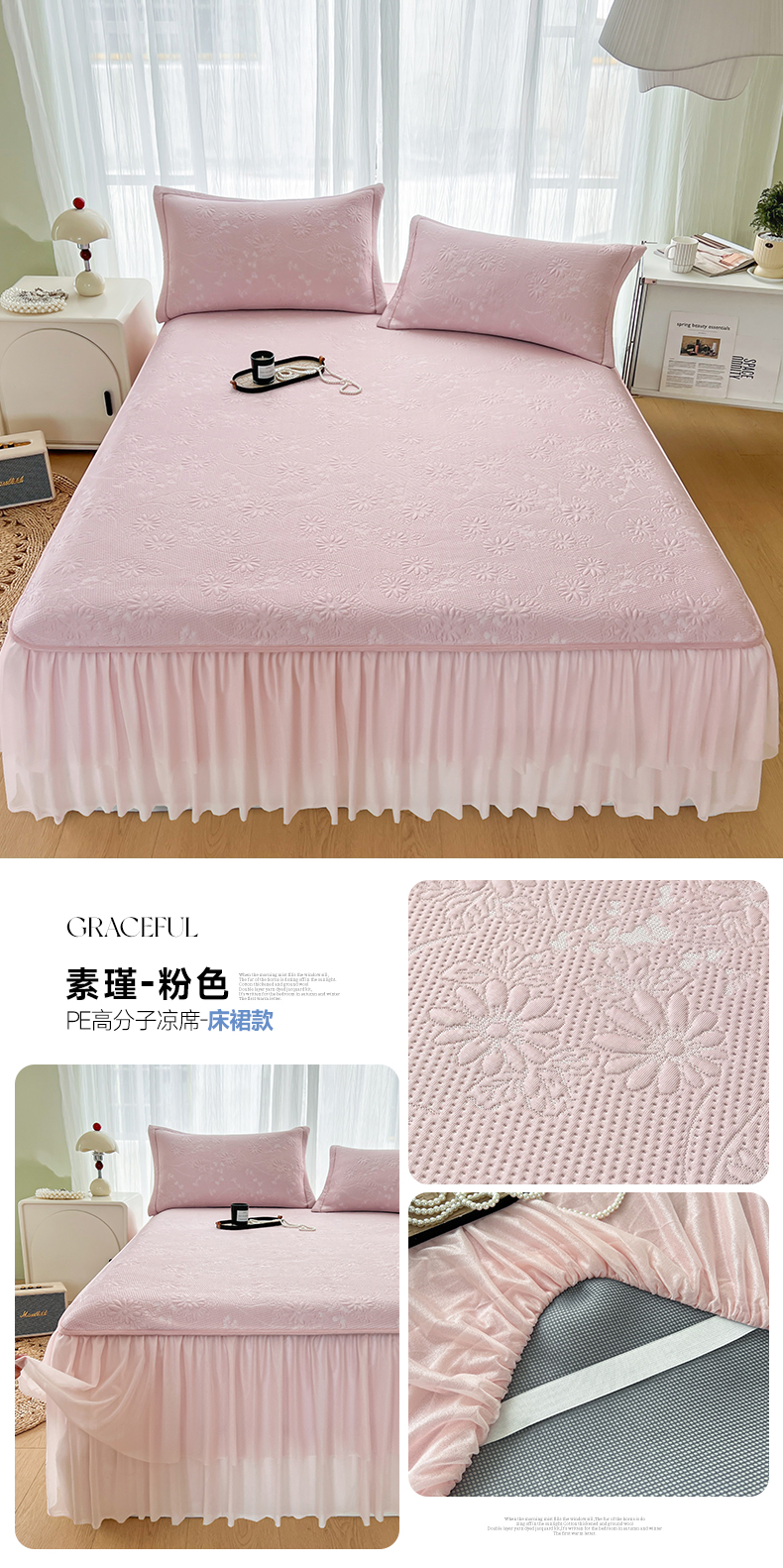 商品名称:库里梦家纺 2026新款高克重复合蕾丝花边PE高分子凉席-床裙款 芳菲-粉色