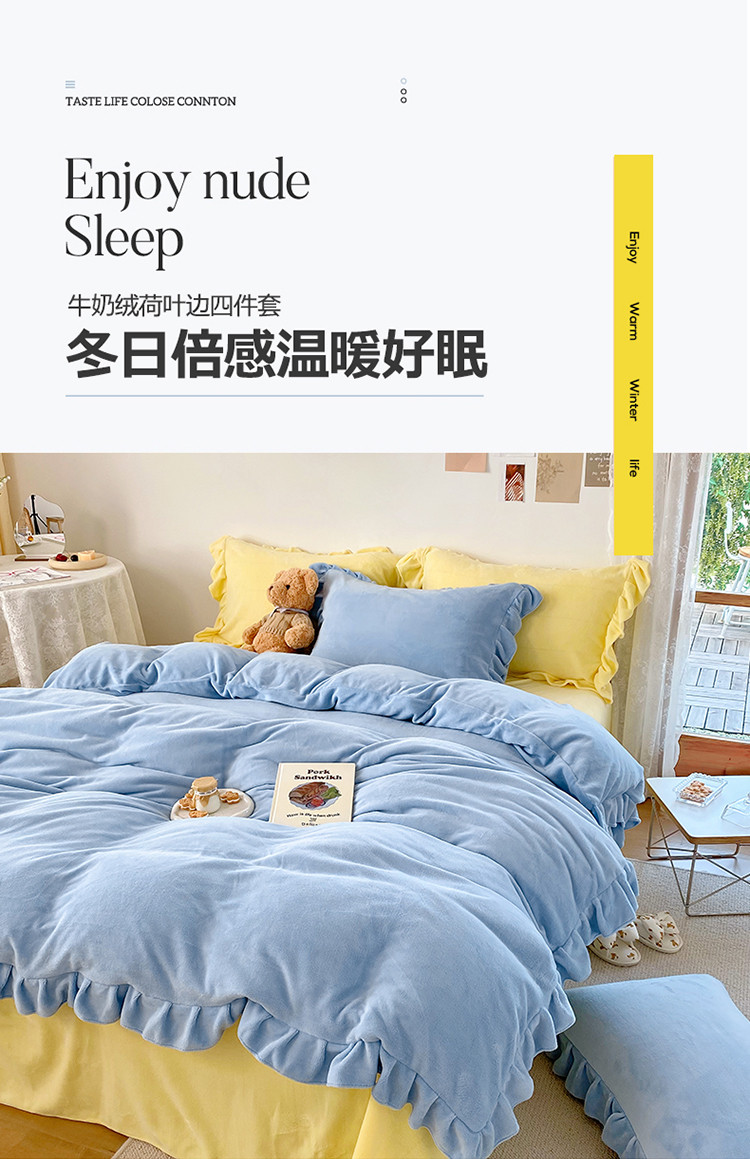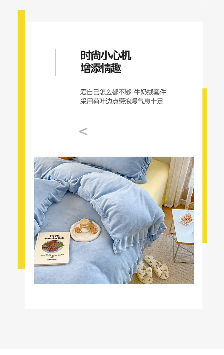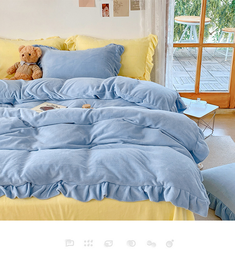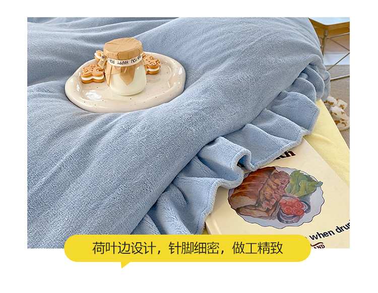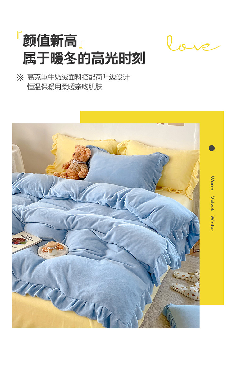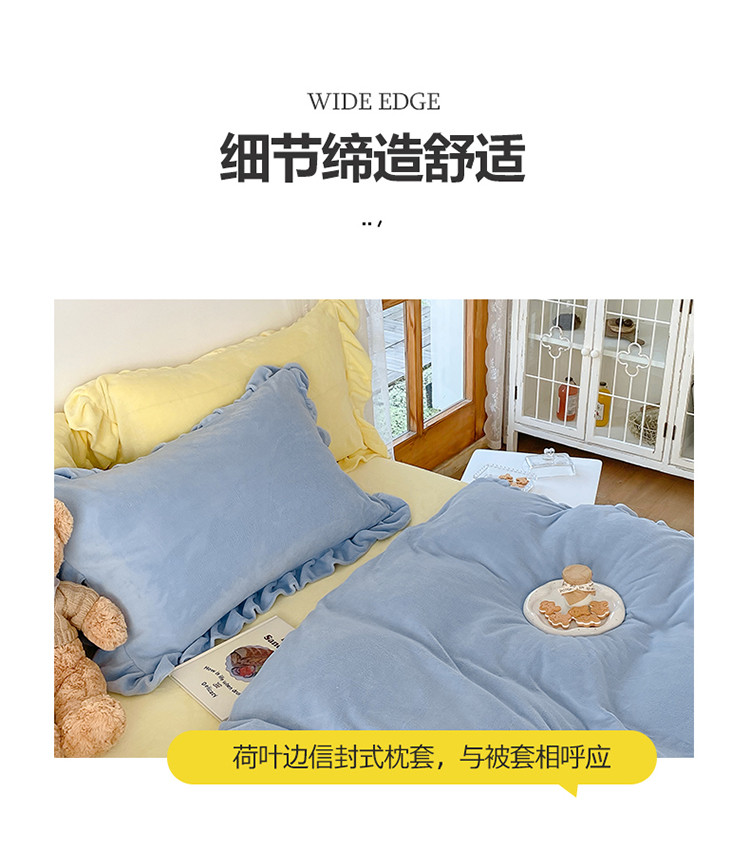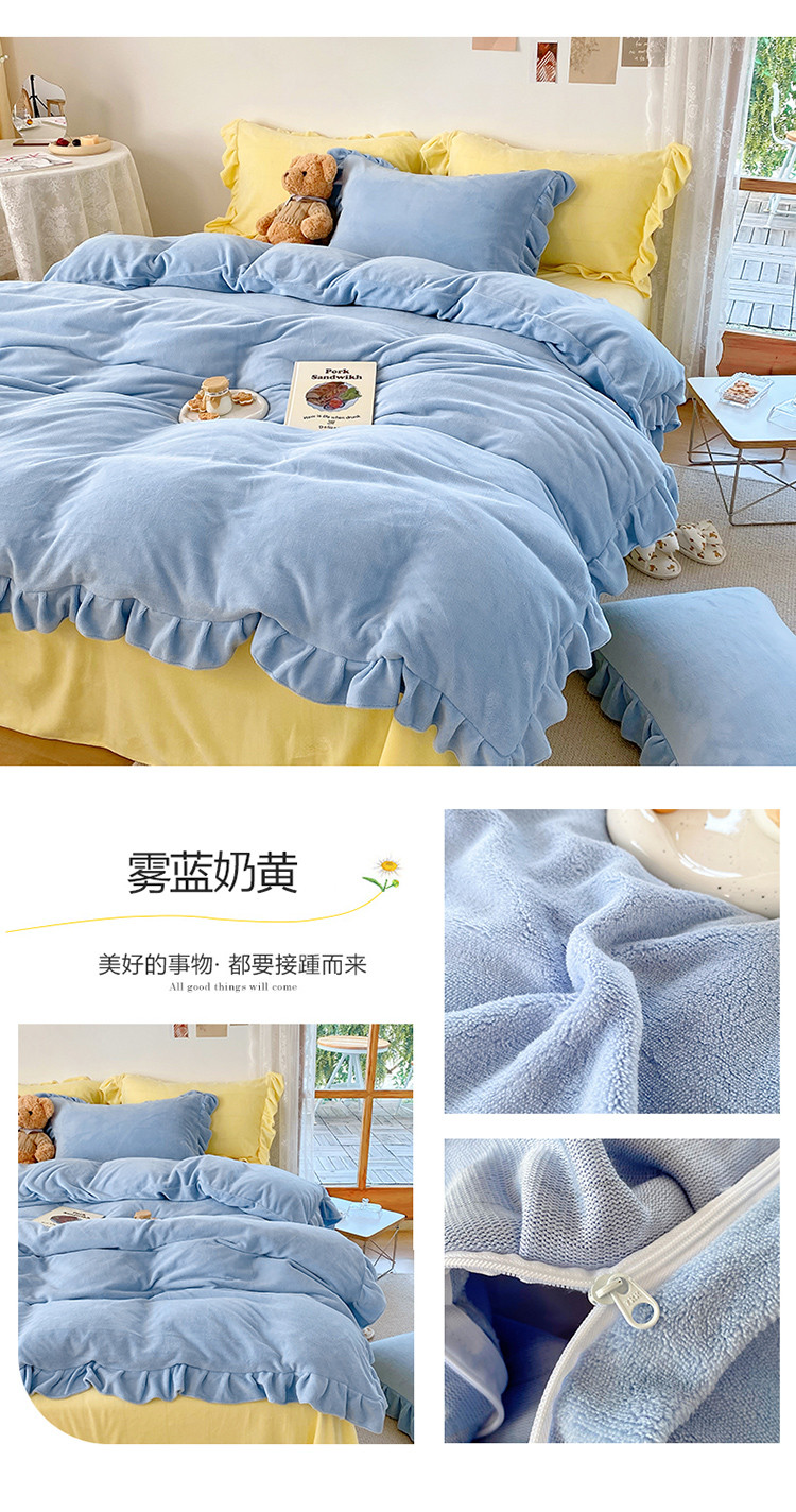当前位置: 91家纺网 > 商品网购 > 床品套件 > 四件套 > 牛奶绒四件套 > 六巷胡同 2021新款牛奶绒ins混搭花边款四件套 雾蓝奶黄