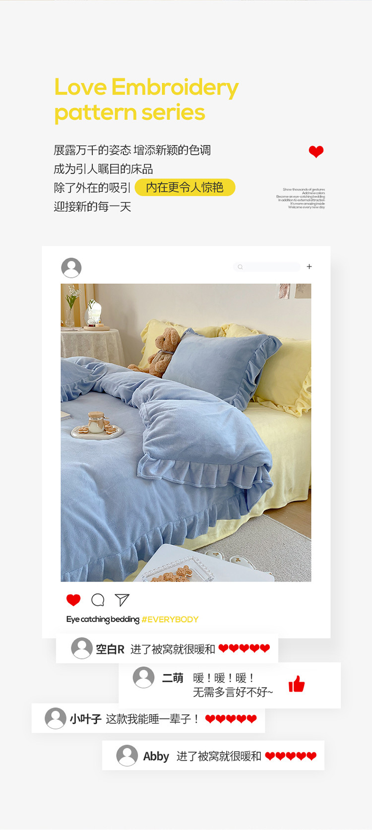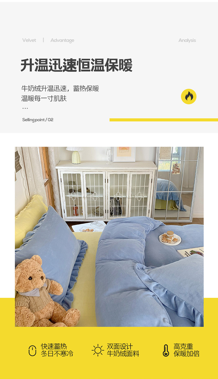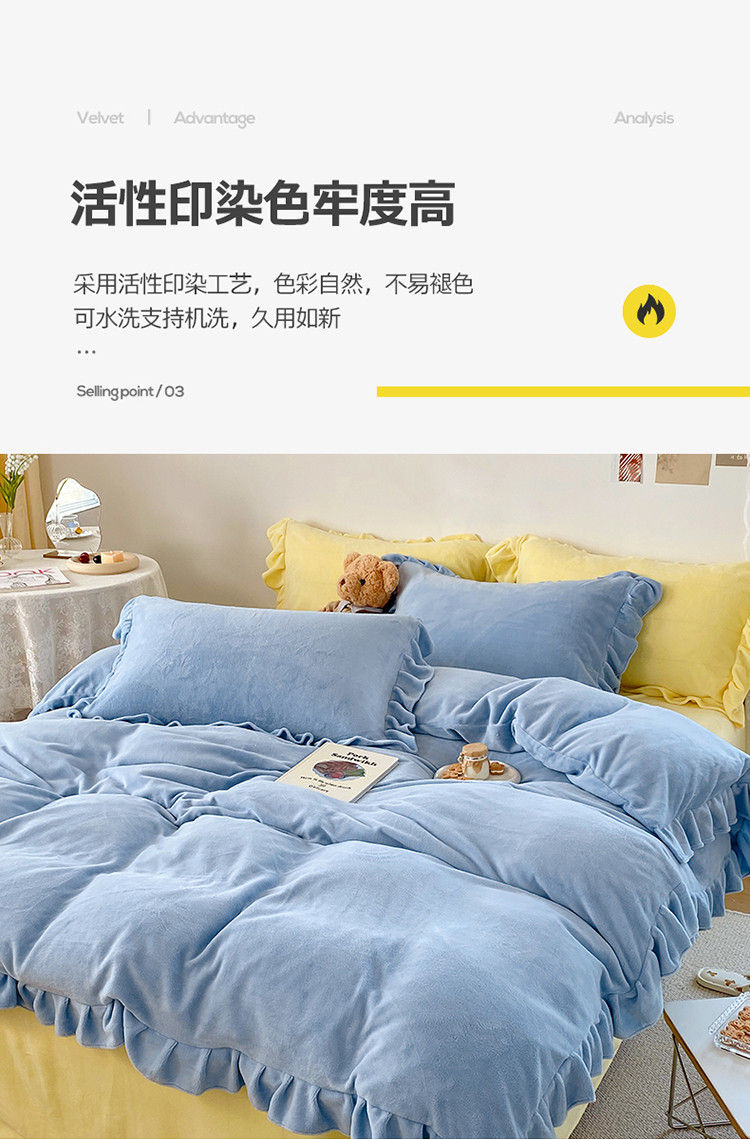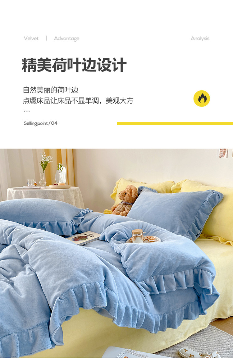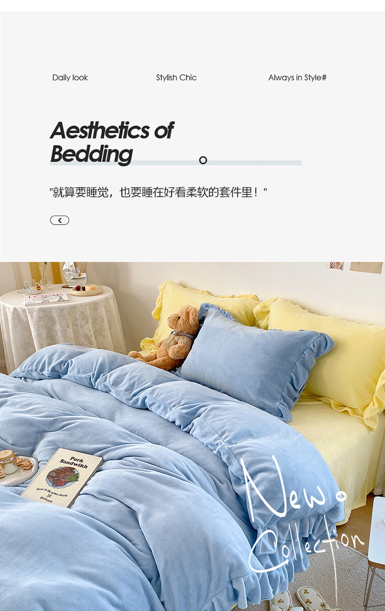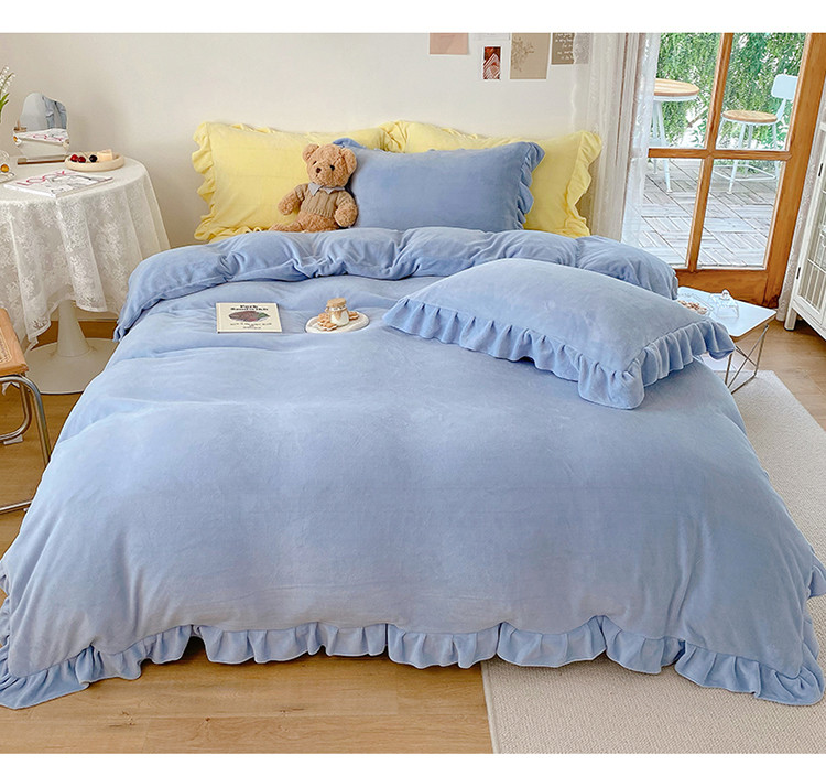 当前位置: 91家纺网 > 商品网购 > 床品套件 > 四件套 > 牛奶绒四件套 > 六巷胡同 2021新款牛奶绒ins混搭花边款四件套 雾蓝奶黄