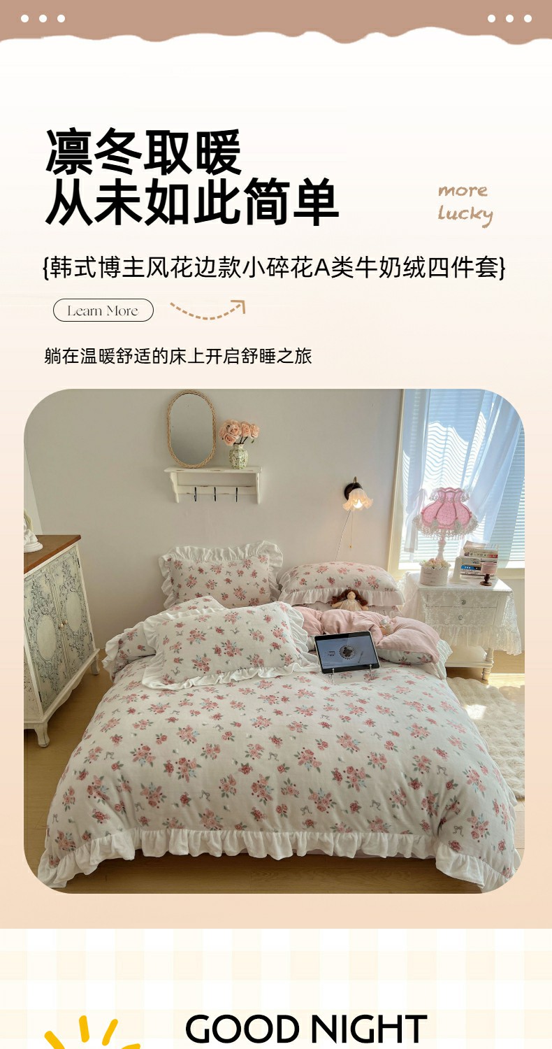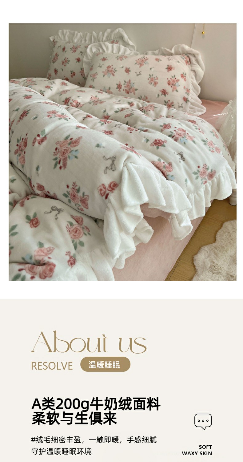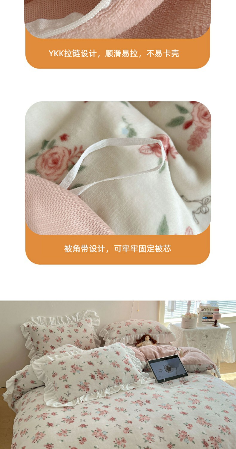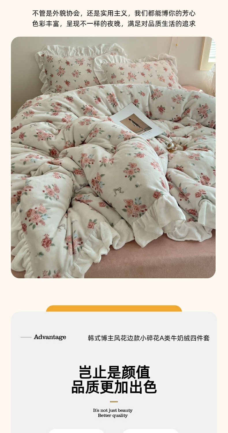 当前位置: 91家纺网 > 商品网购 > 床品套件 > 四件套 > 牛奶绒四件套 > 六巷胡同 2025新款韩式博主风花边款小碎花A类牛奶绒四件套 花边云屿桃记