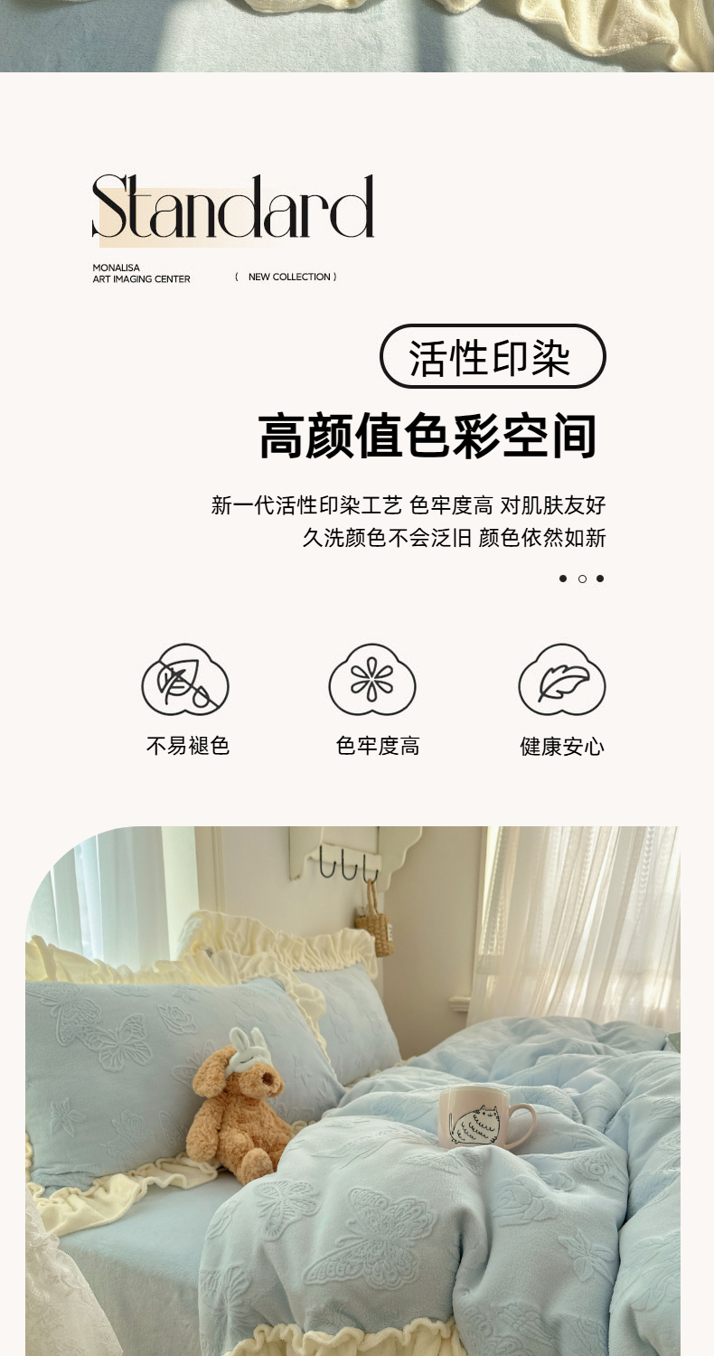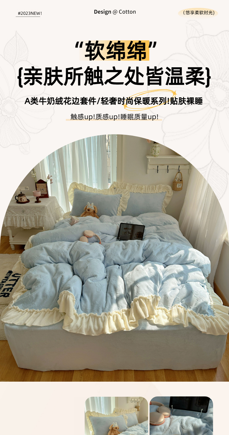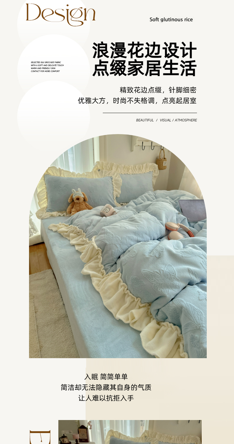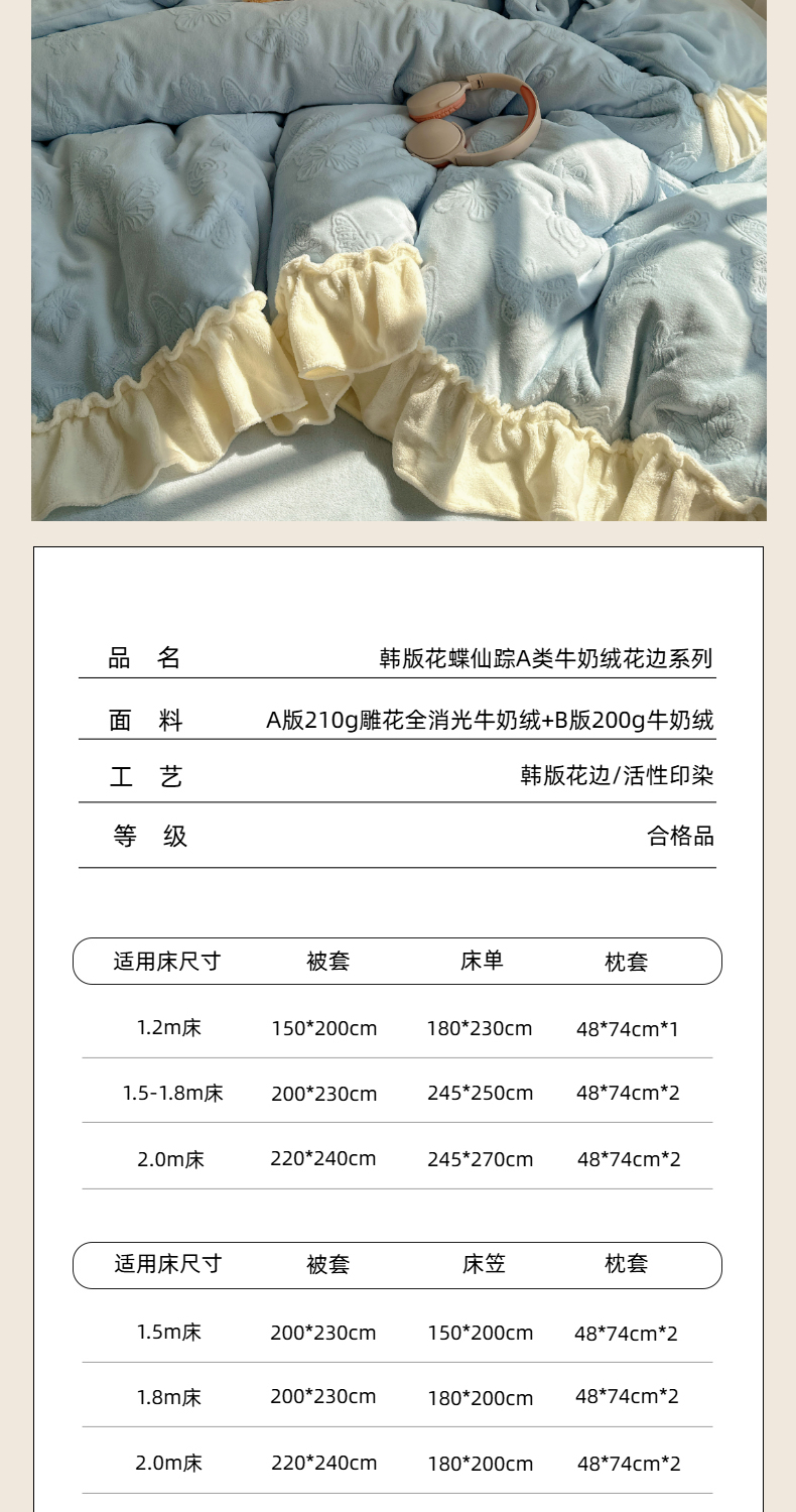 当前位置: 91家纺网 > 商品网购 > 床品套件 > 四件套 > 牛奶绒四件套 > 六巷胡同 2025新款韩版花蝶仙踪A类全消光牛奶绒花边四件套 花蝶仙踪-湖水蓝