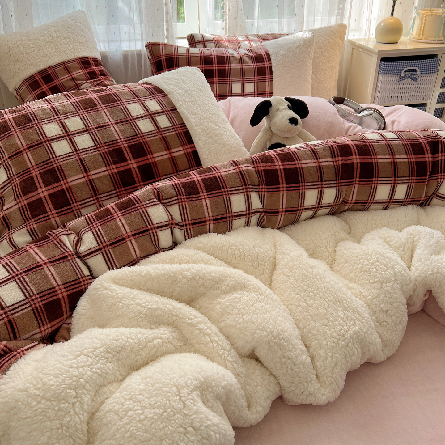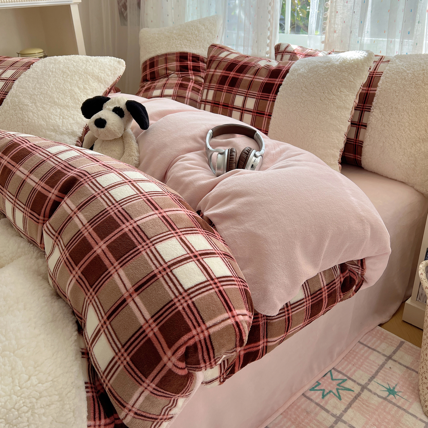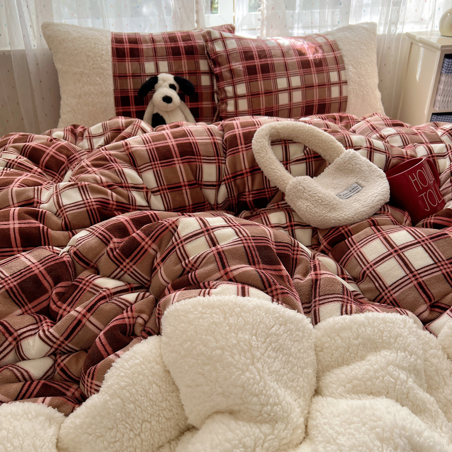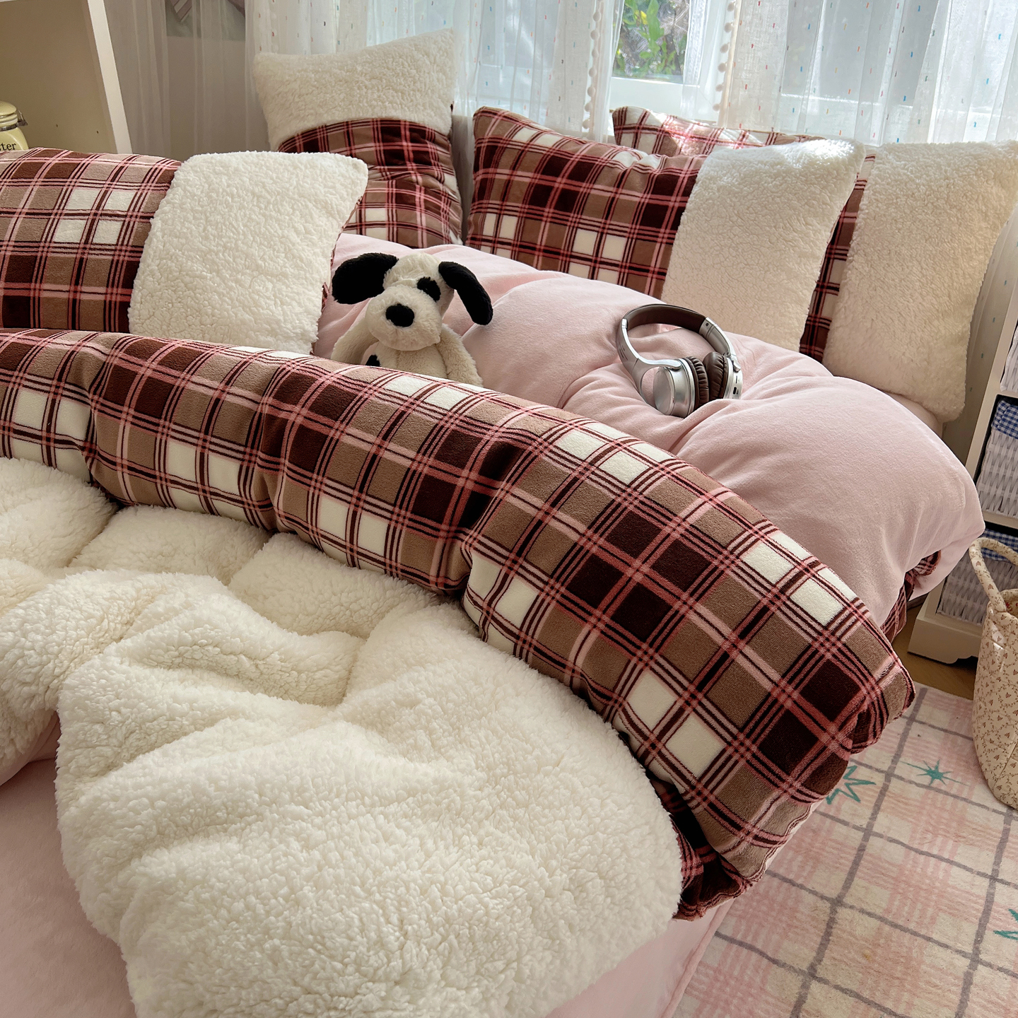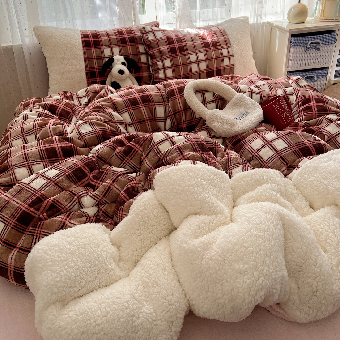 商品名称:顾里家纺 2025新款复古博主风高克重羊羔毛拼接牛奶绒套件 苏格物语