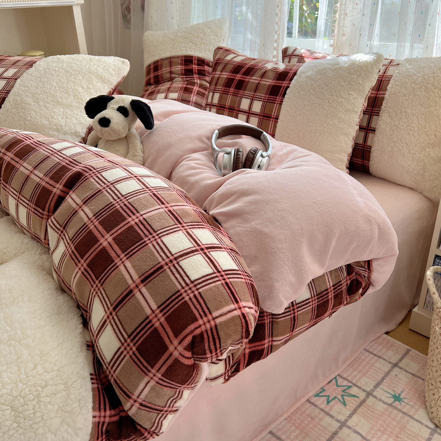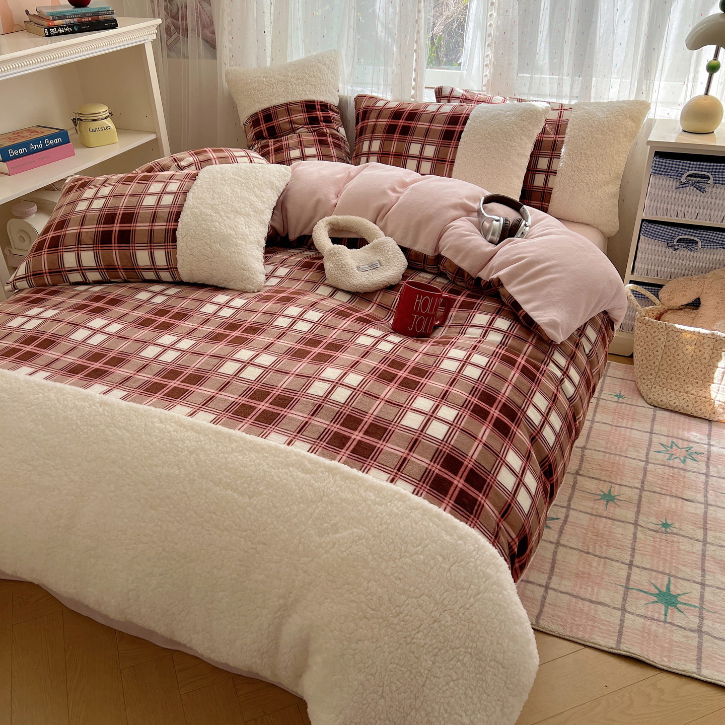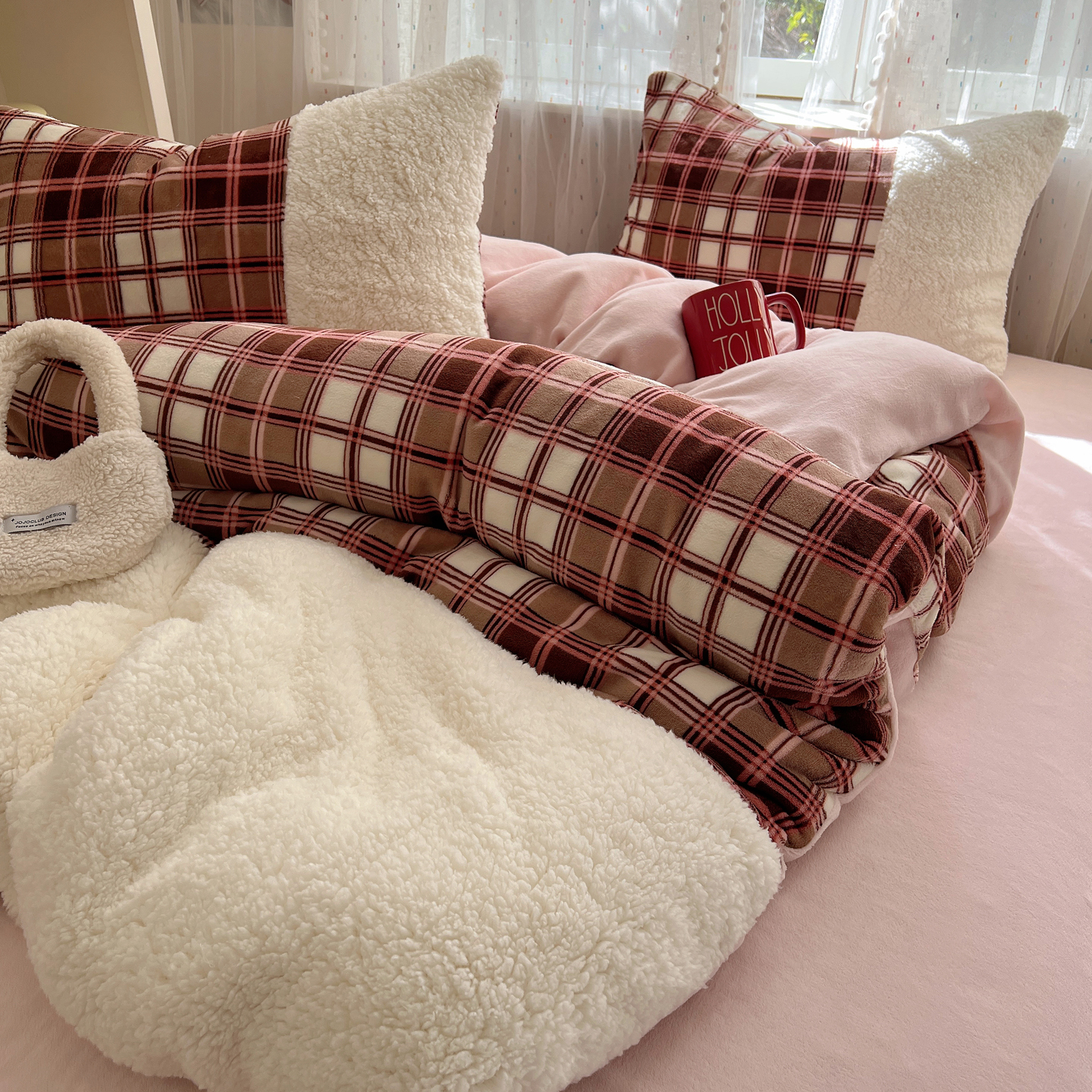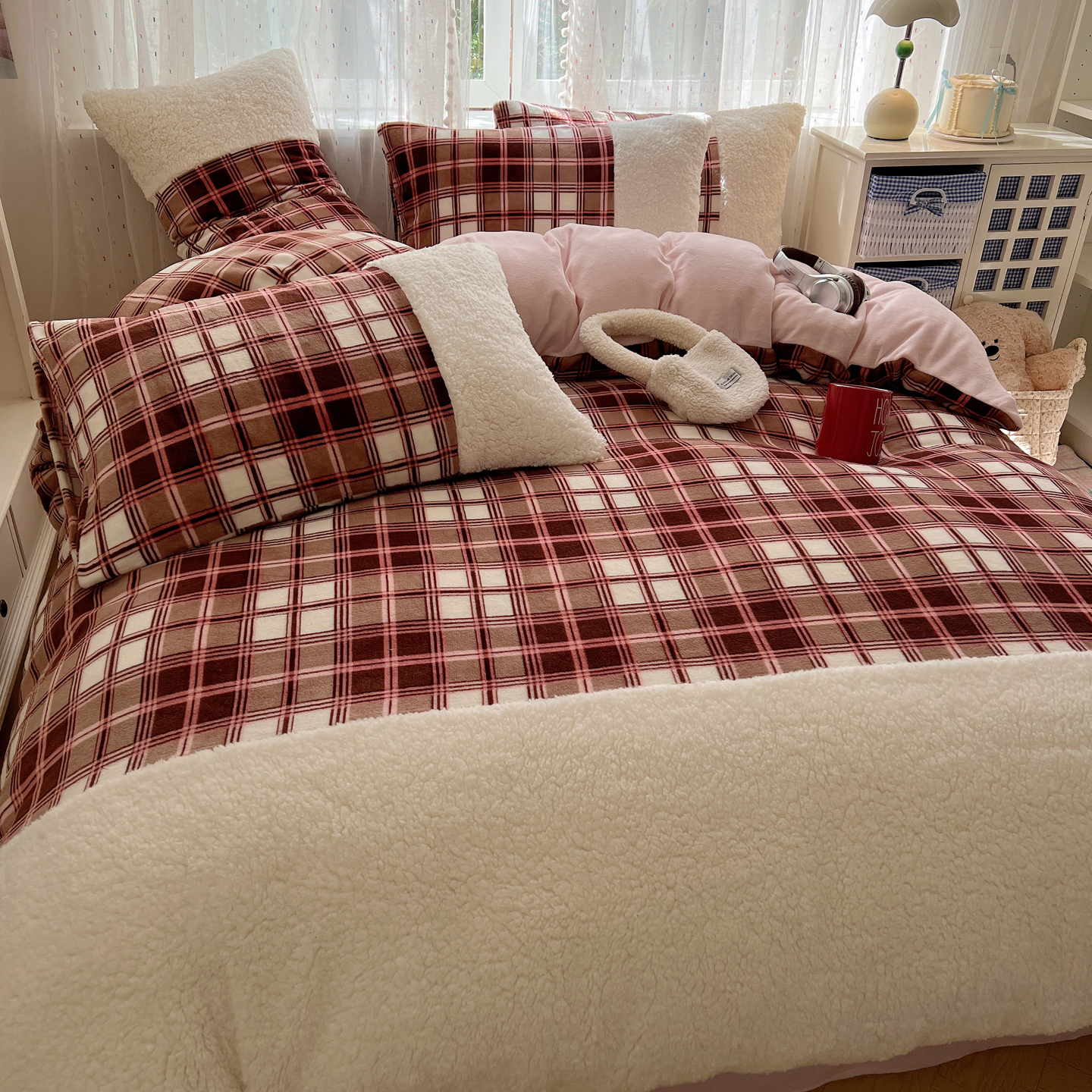 商品名称:顾里家纺 2025新款复古博主风高克重羊羔毛拼接牛奶绒套件 苏格物语