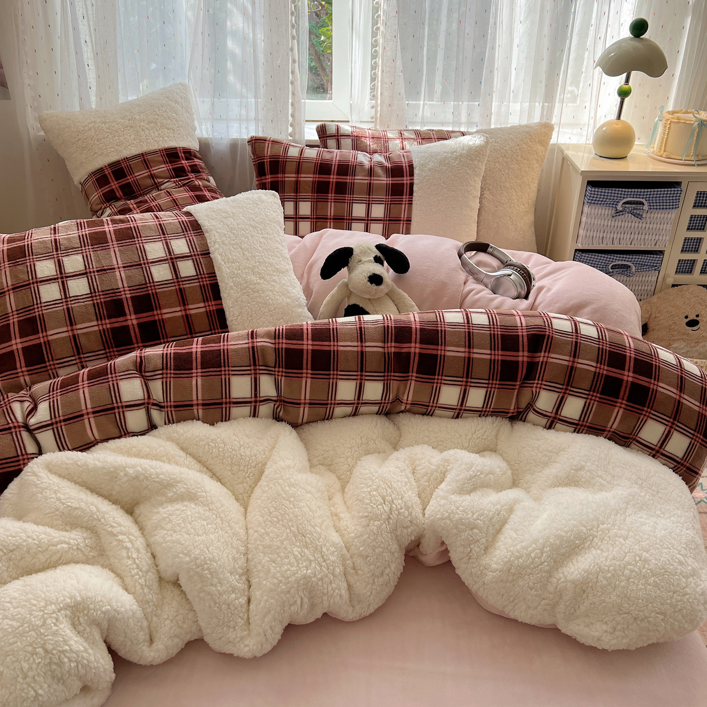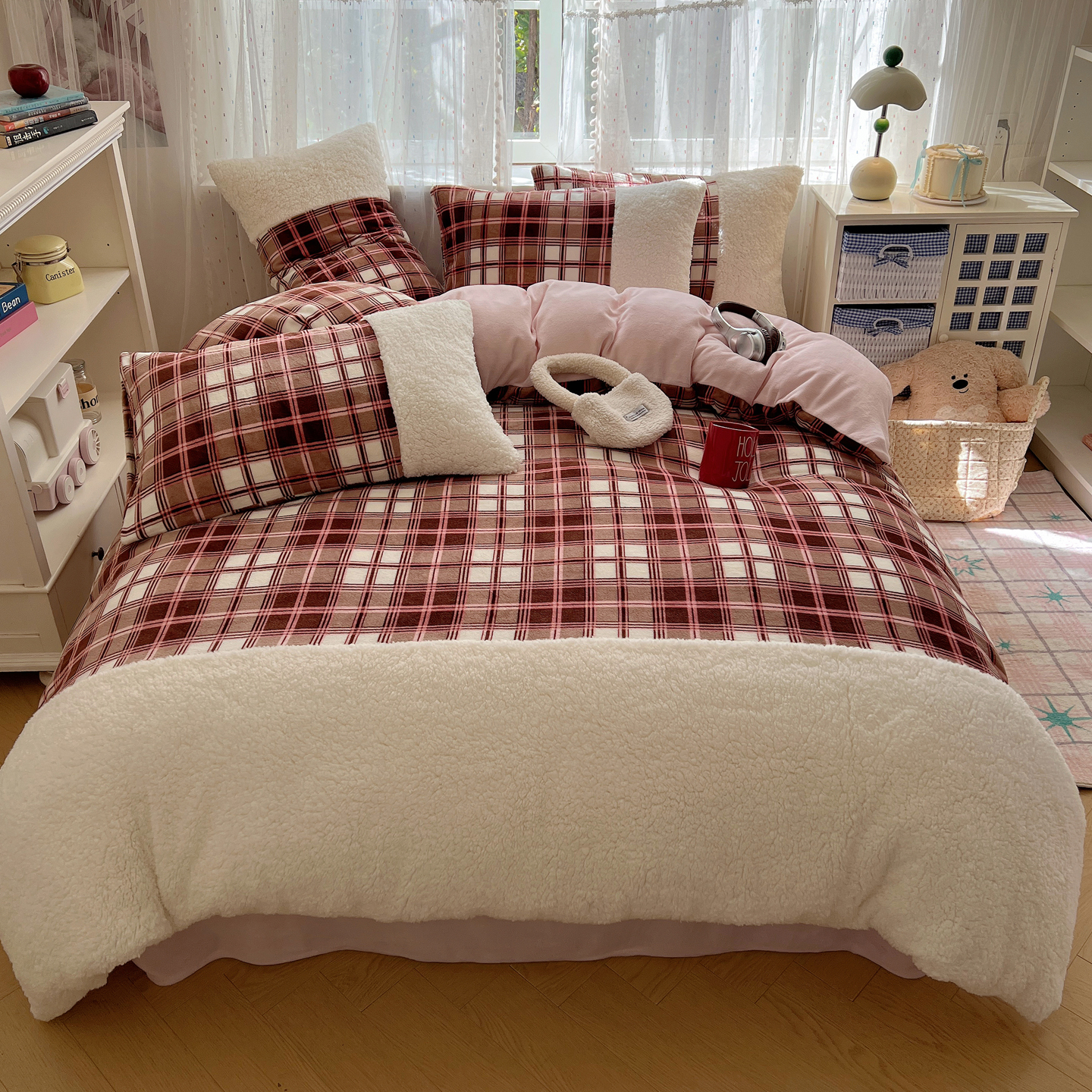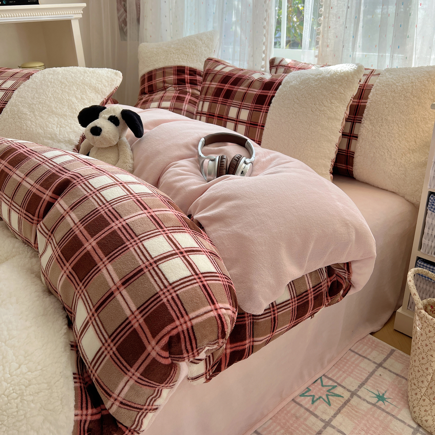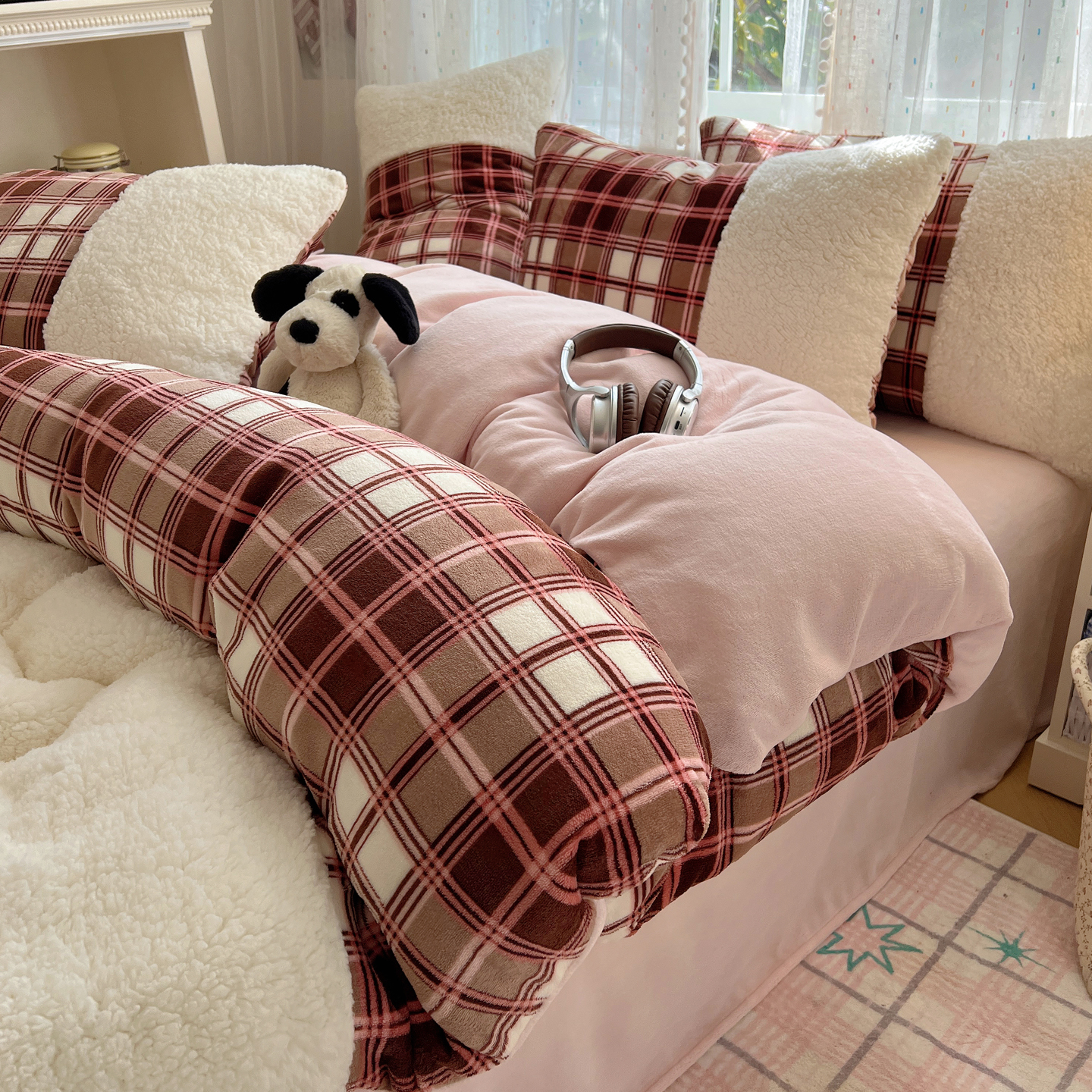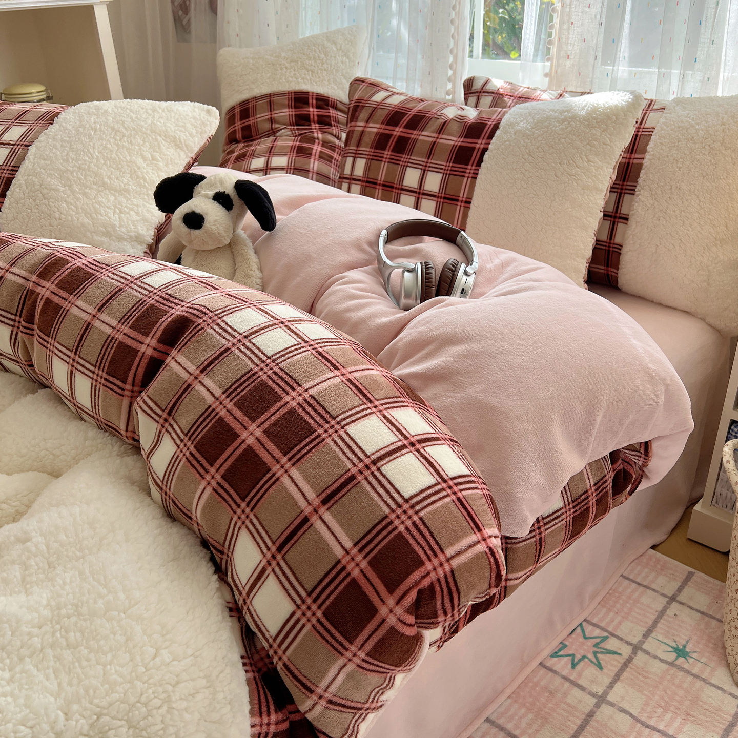 商品名称:顾里家纺 2025新款复古博主风高克重羊羔毛拼接牛奶绒套件 苏格物语