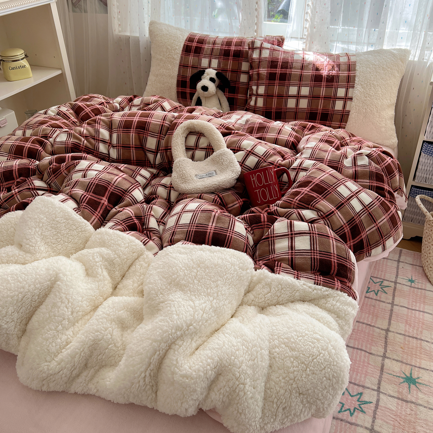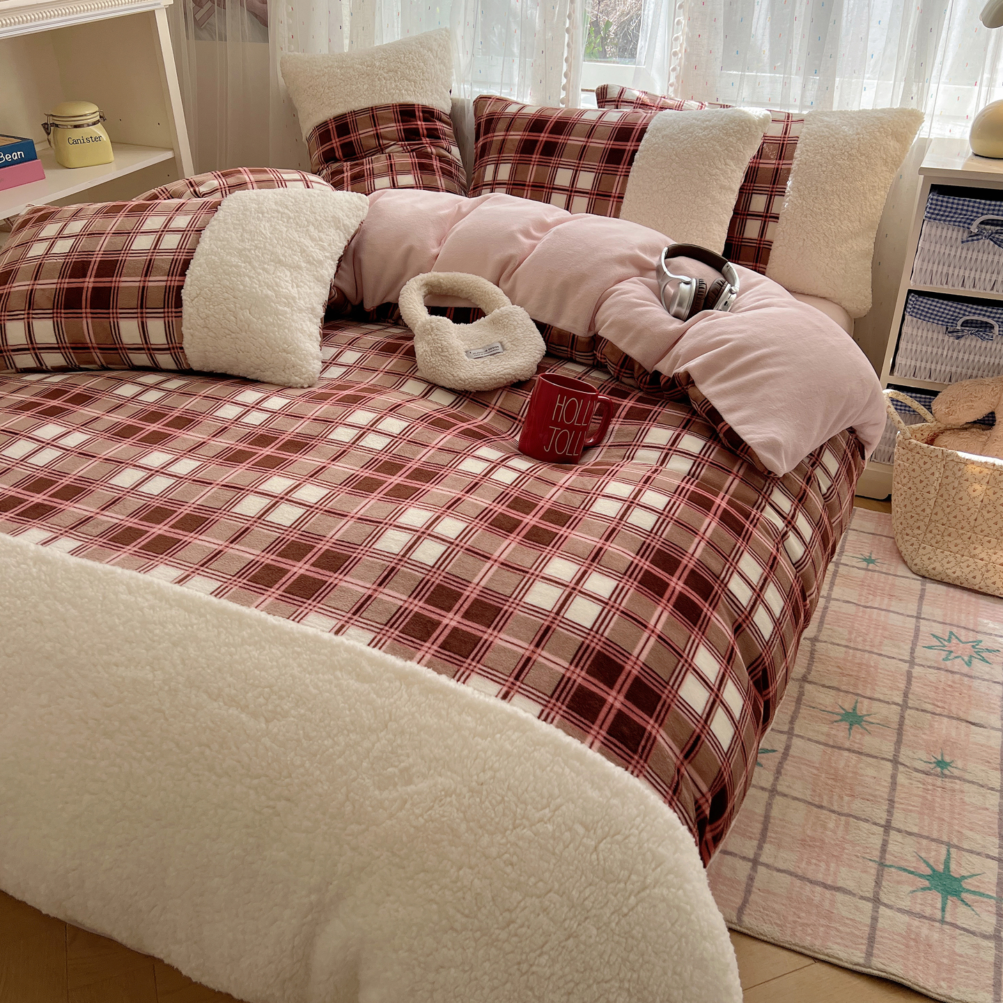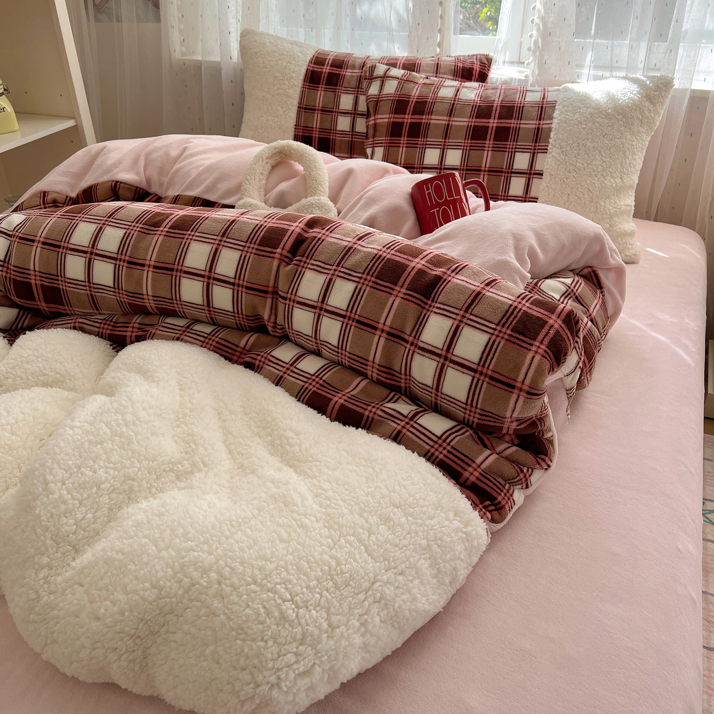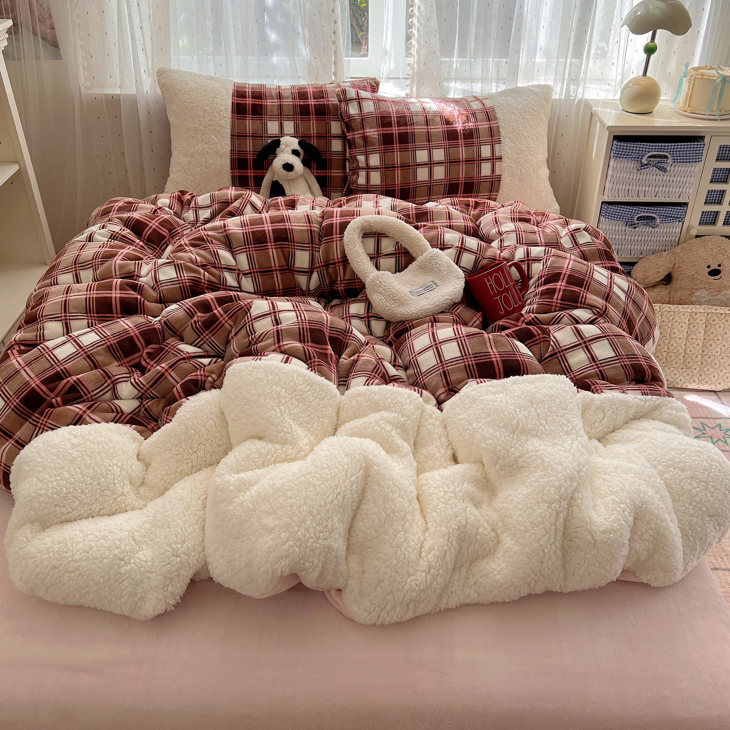 商品名称:顾里家纺 2025新款复古博主风高克重羊羔毛拼接牛奶绒套件 苏格物语