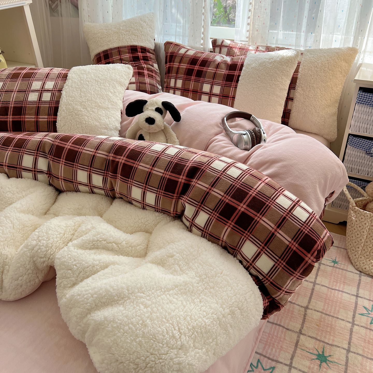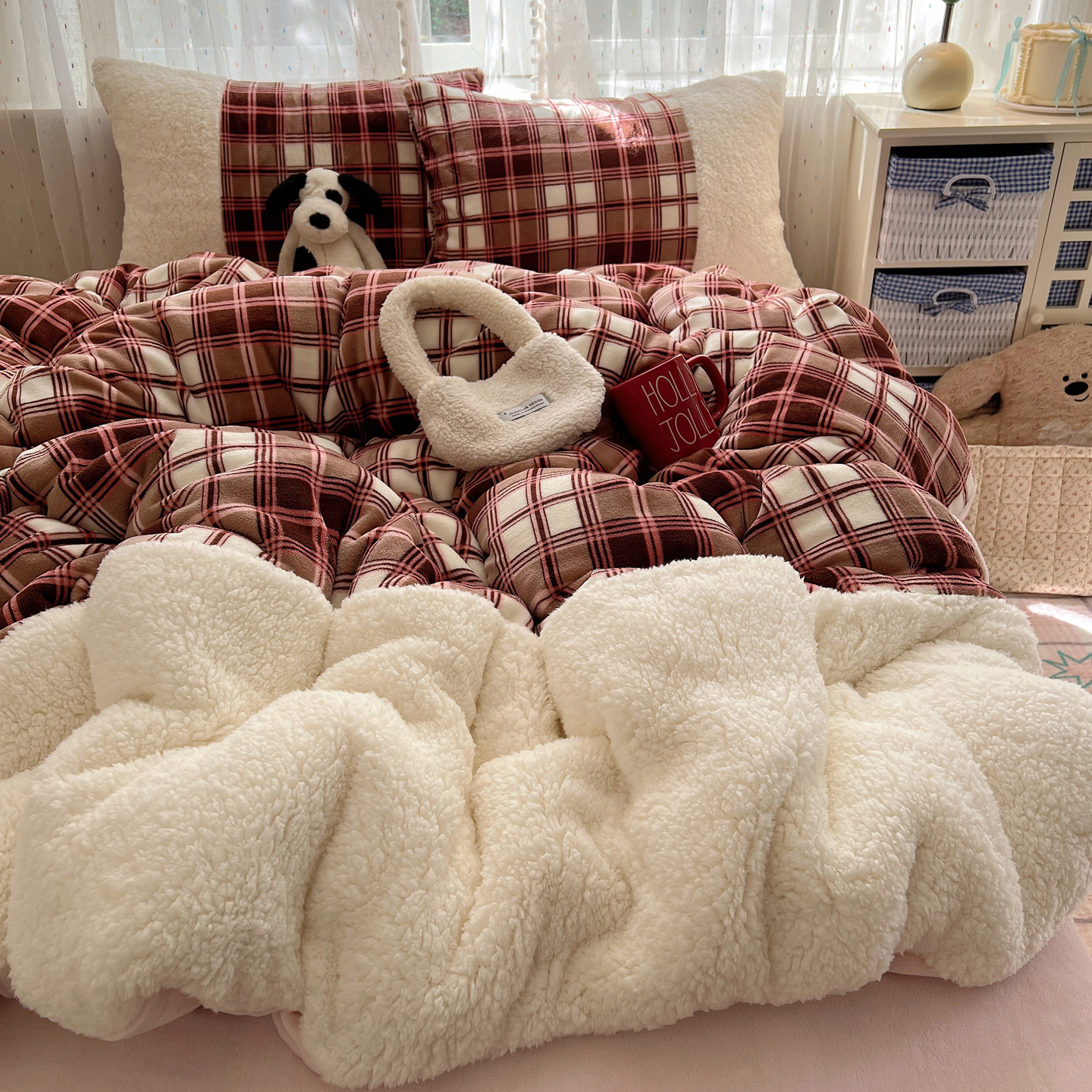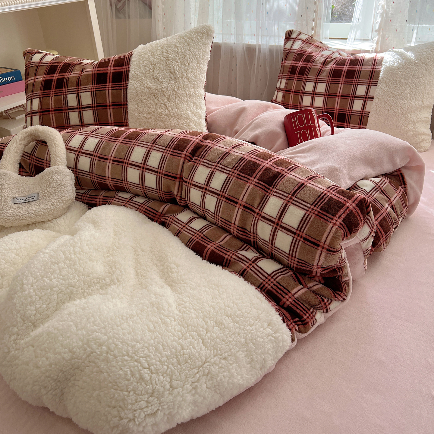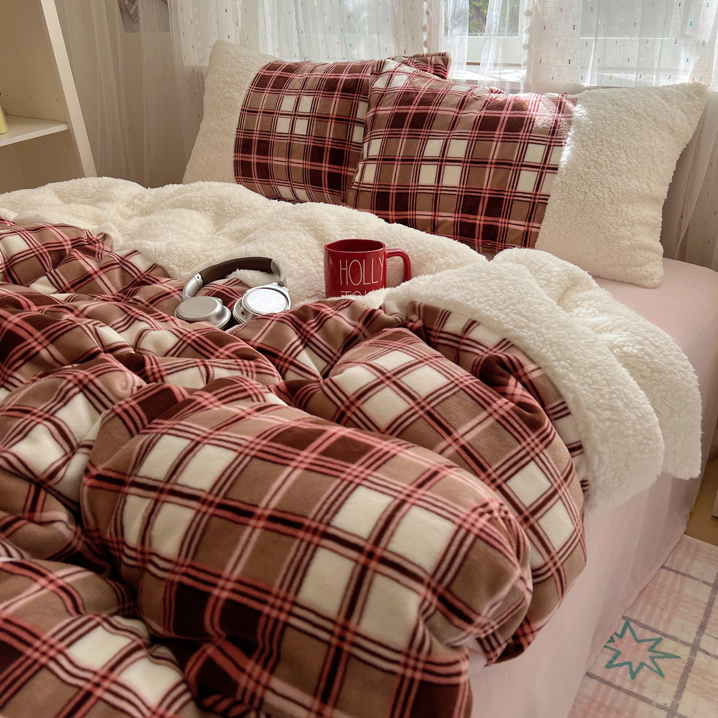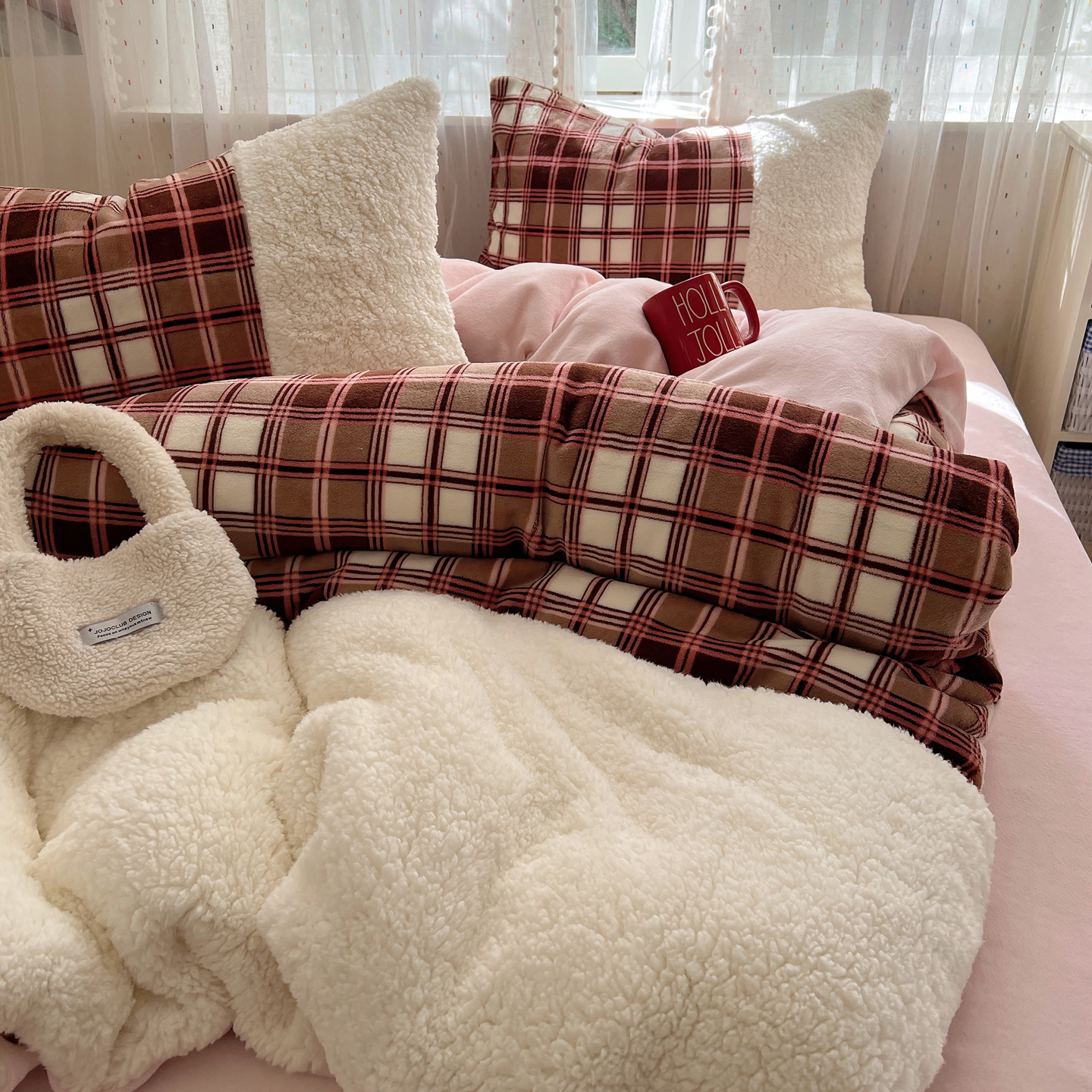 商品名称:顾里家纺 2025新款复古博主风高克重羊羔毛拼接牛奶绒套件 苏格物语
