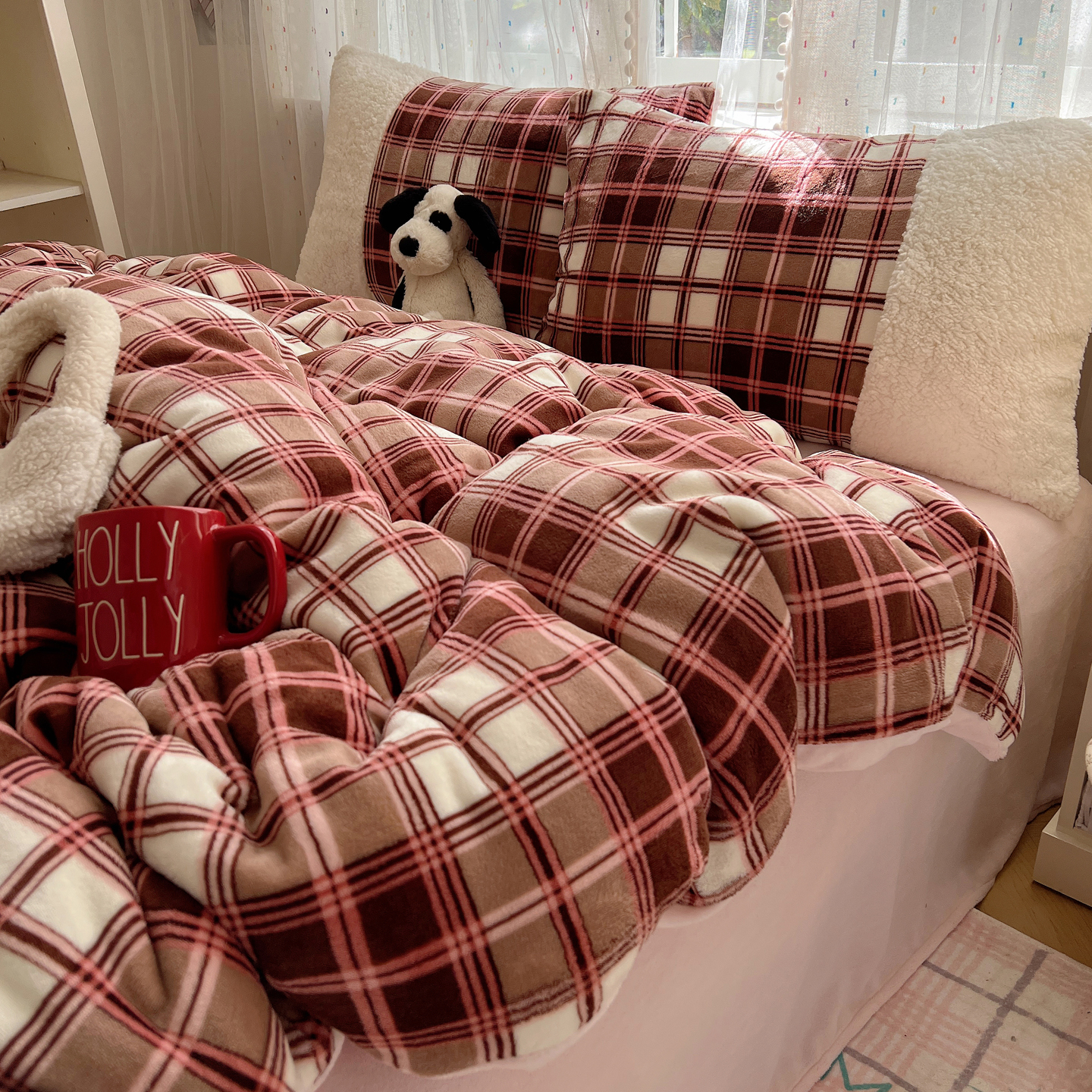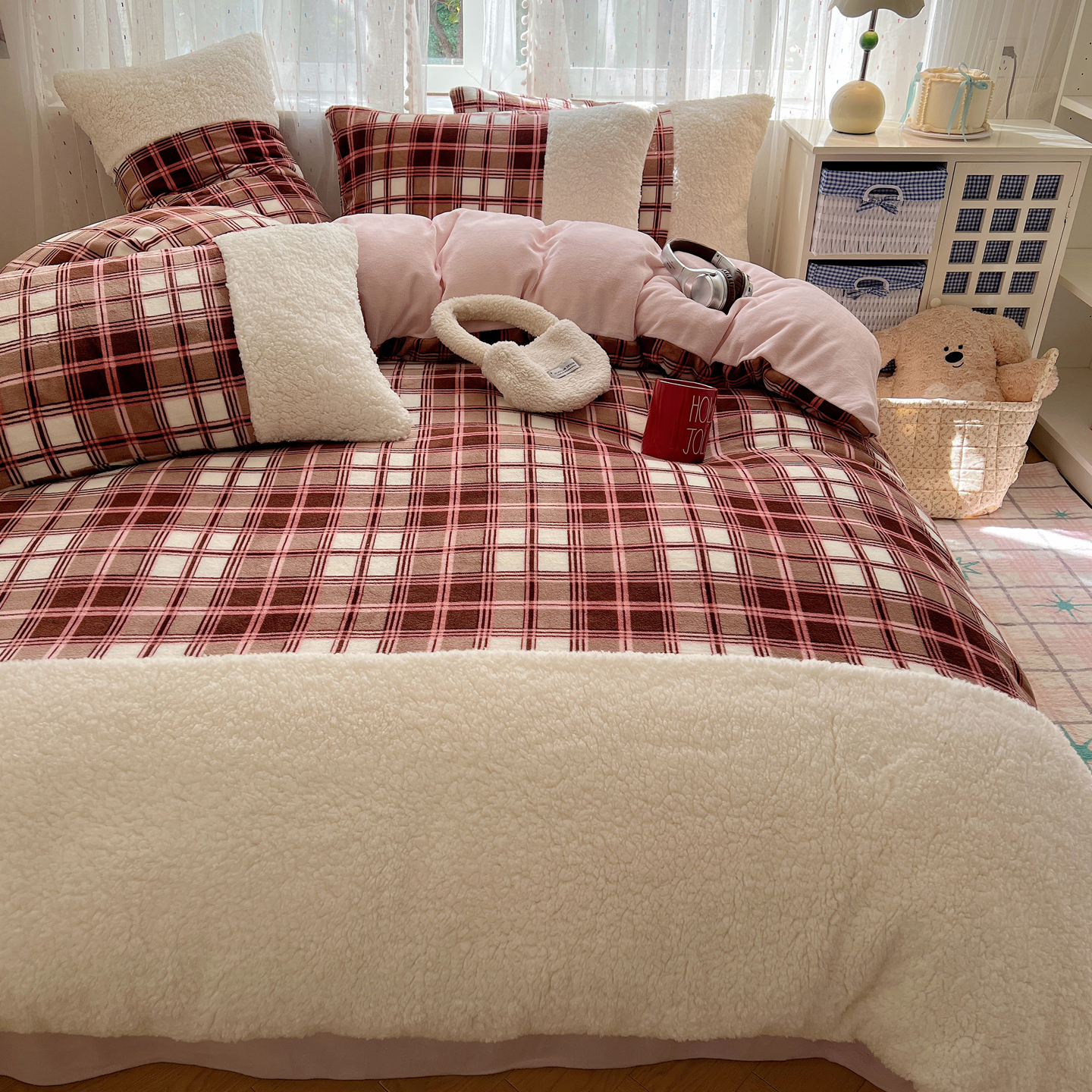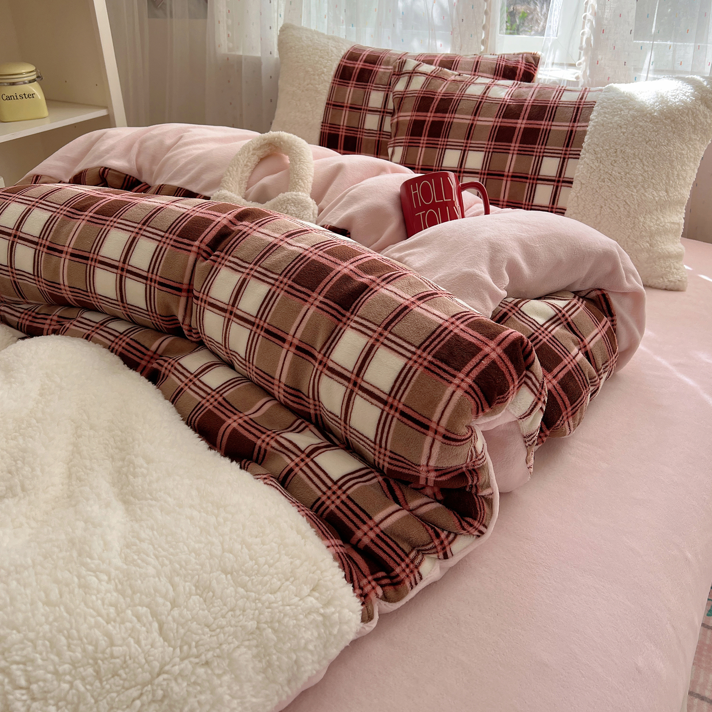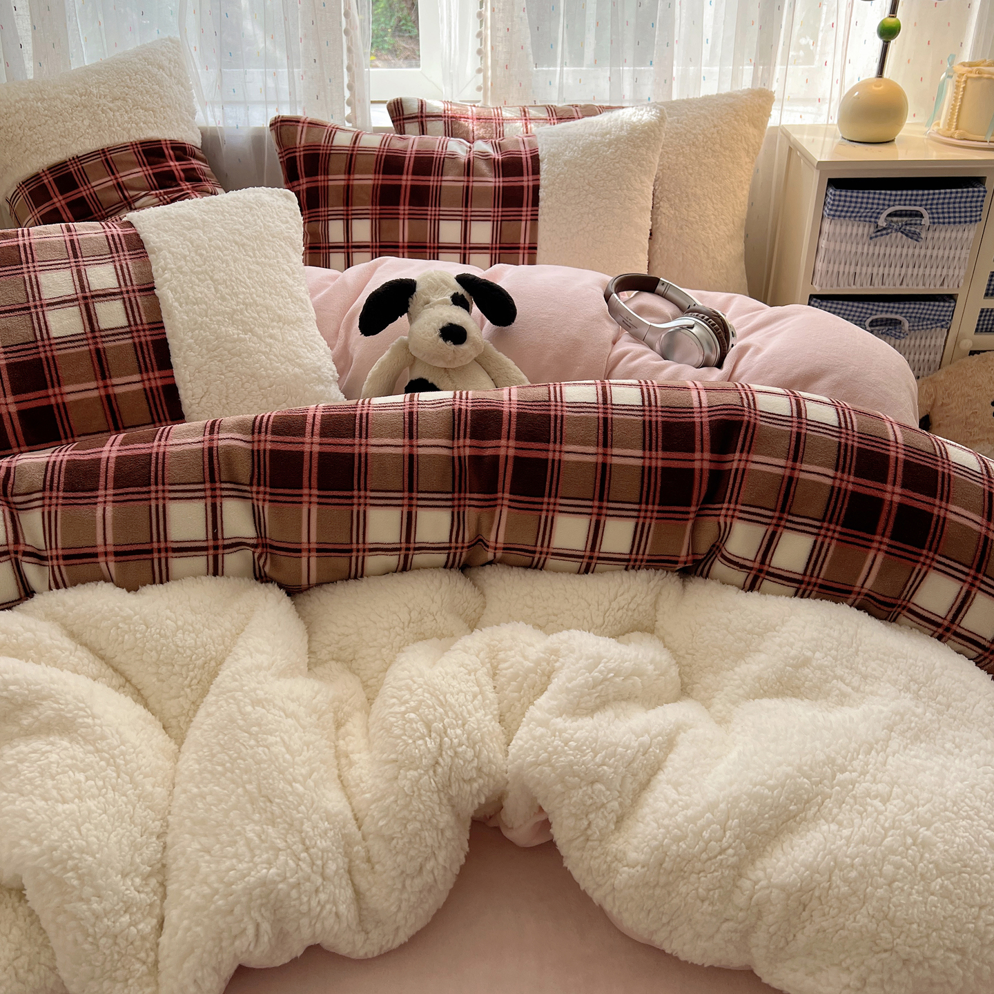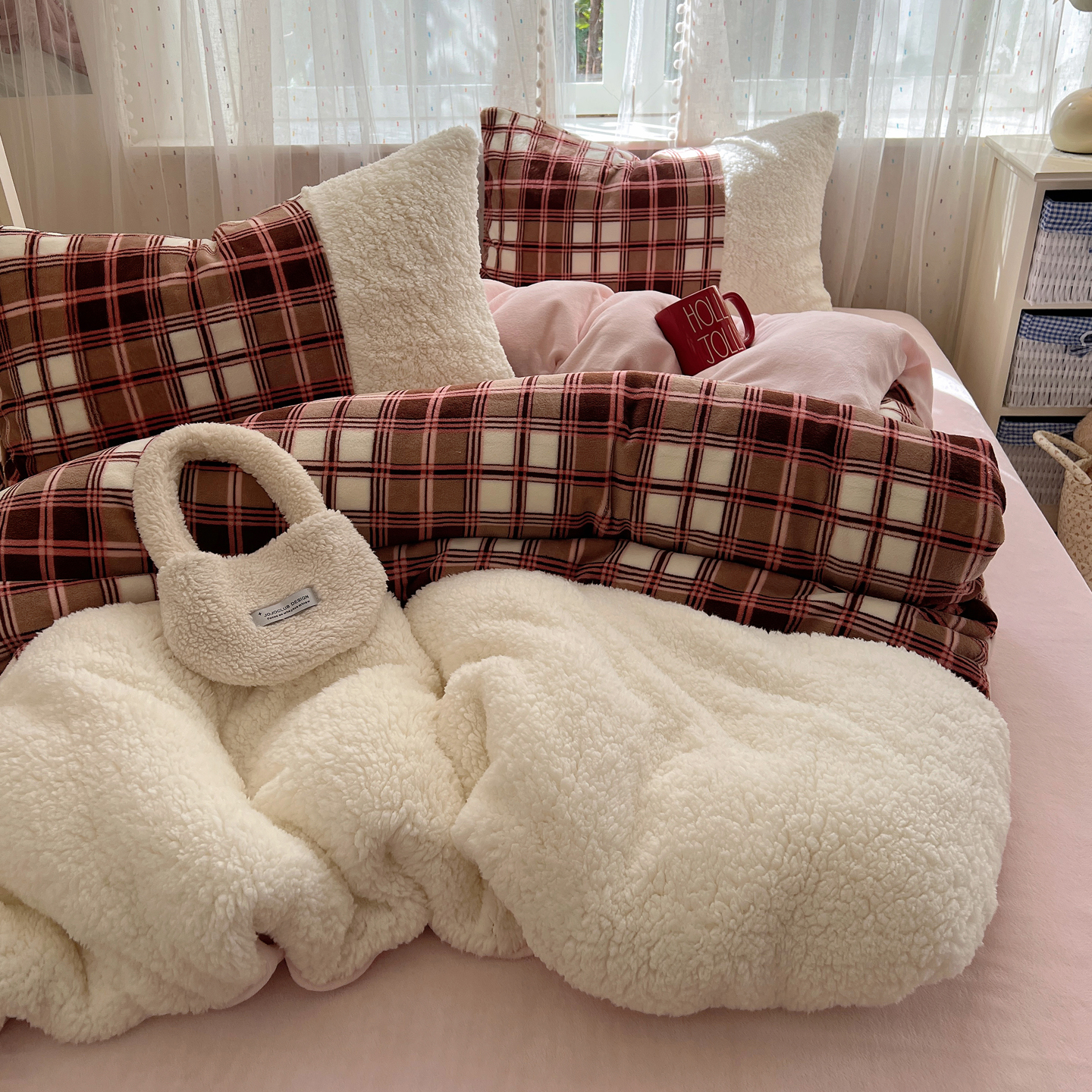 商品名称:顾里家纺 2025新款复古博主风高克重羊羔毛拼接牛奶绒套件 苏格物语