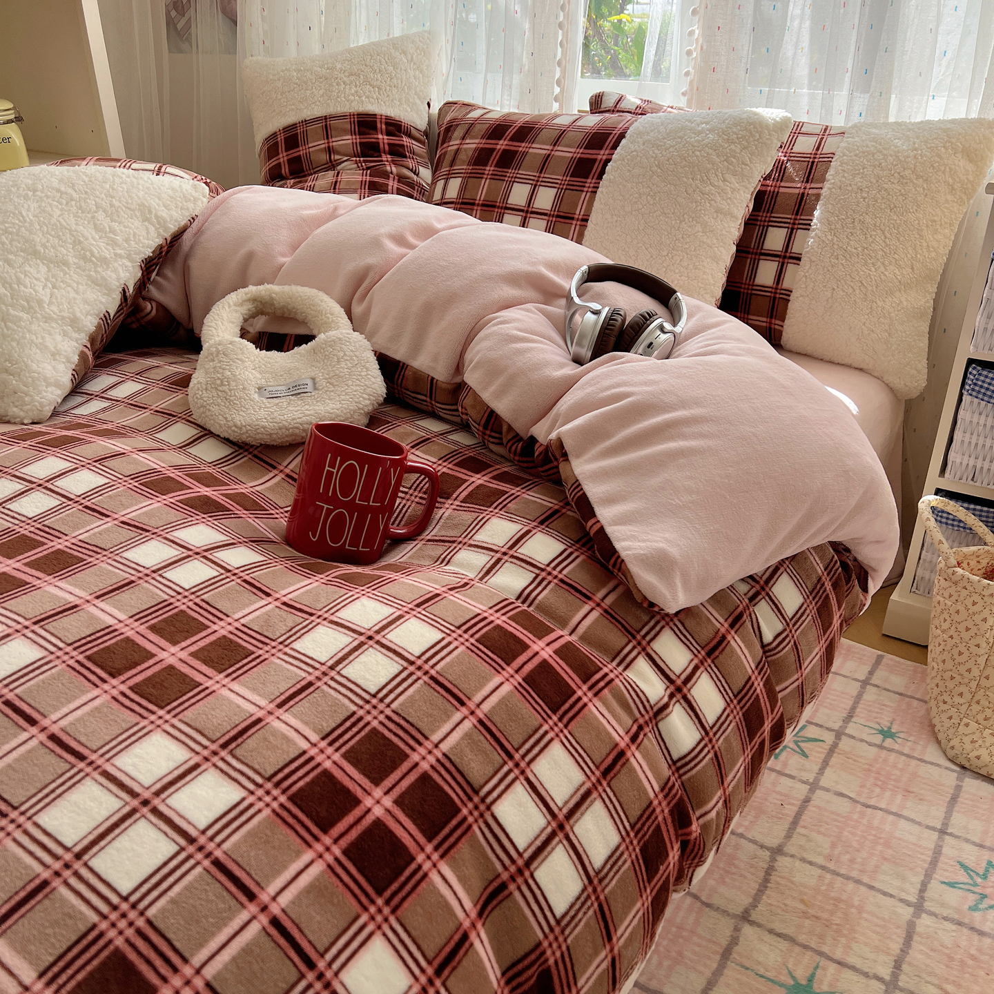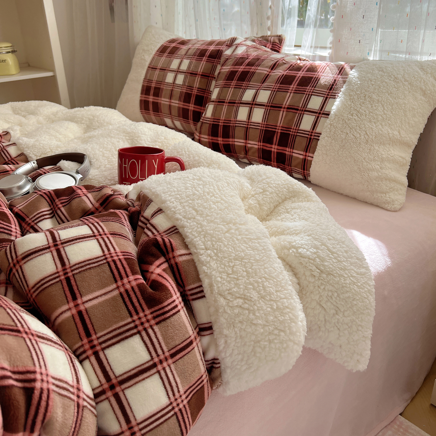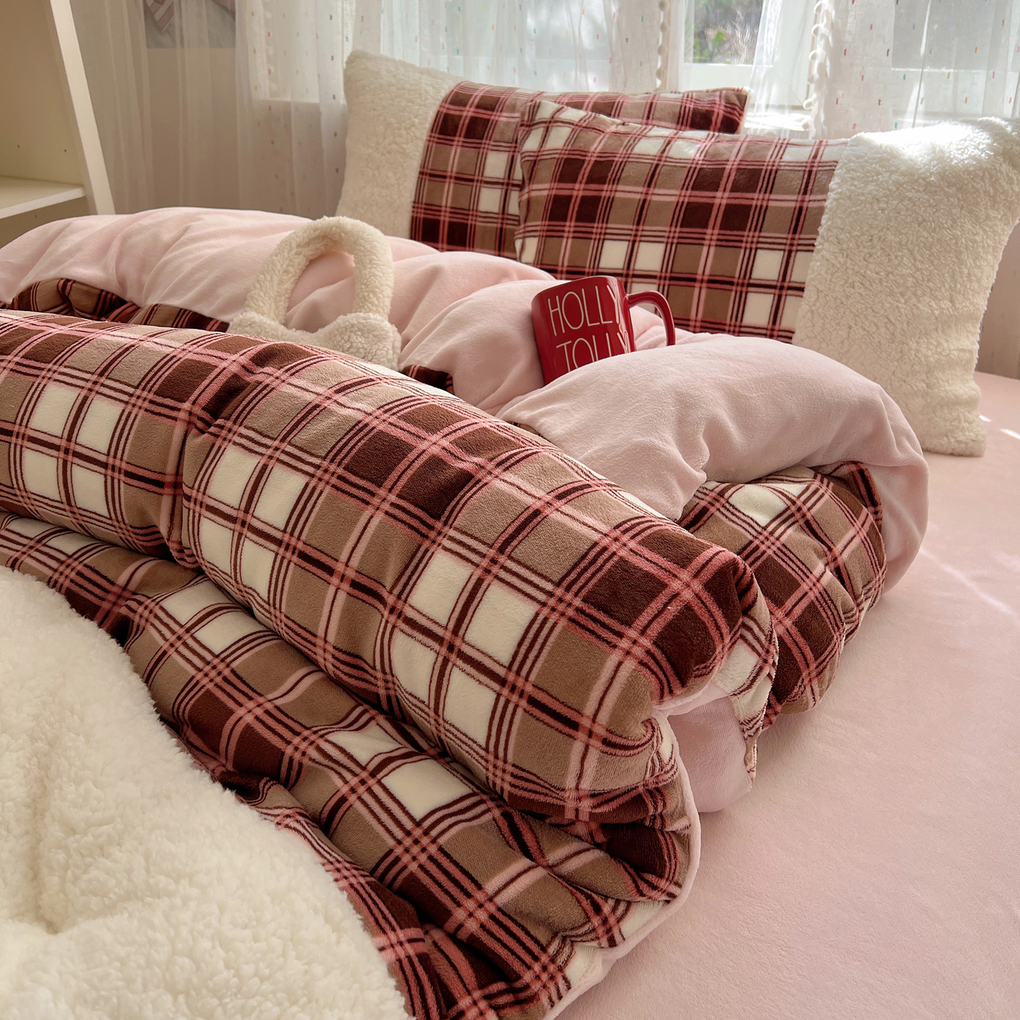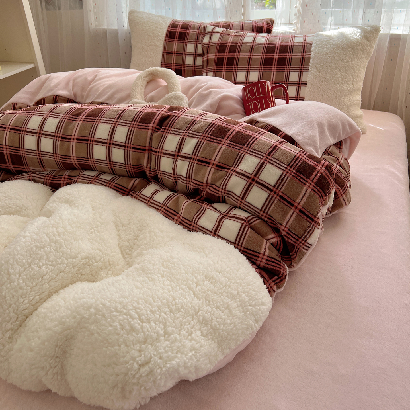 商品名称:顾里家纺 2025新款复古博主风高克重羊羔毛拼接牛奶绒套件 苏格物语