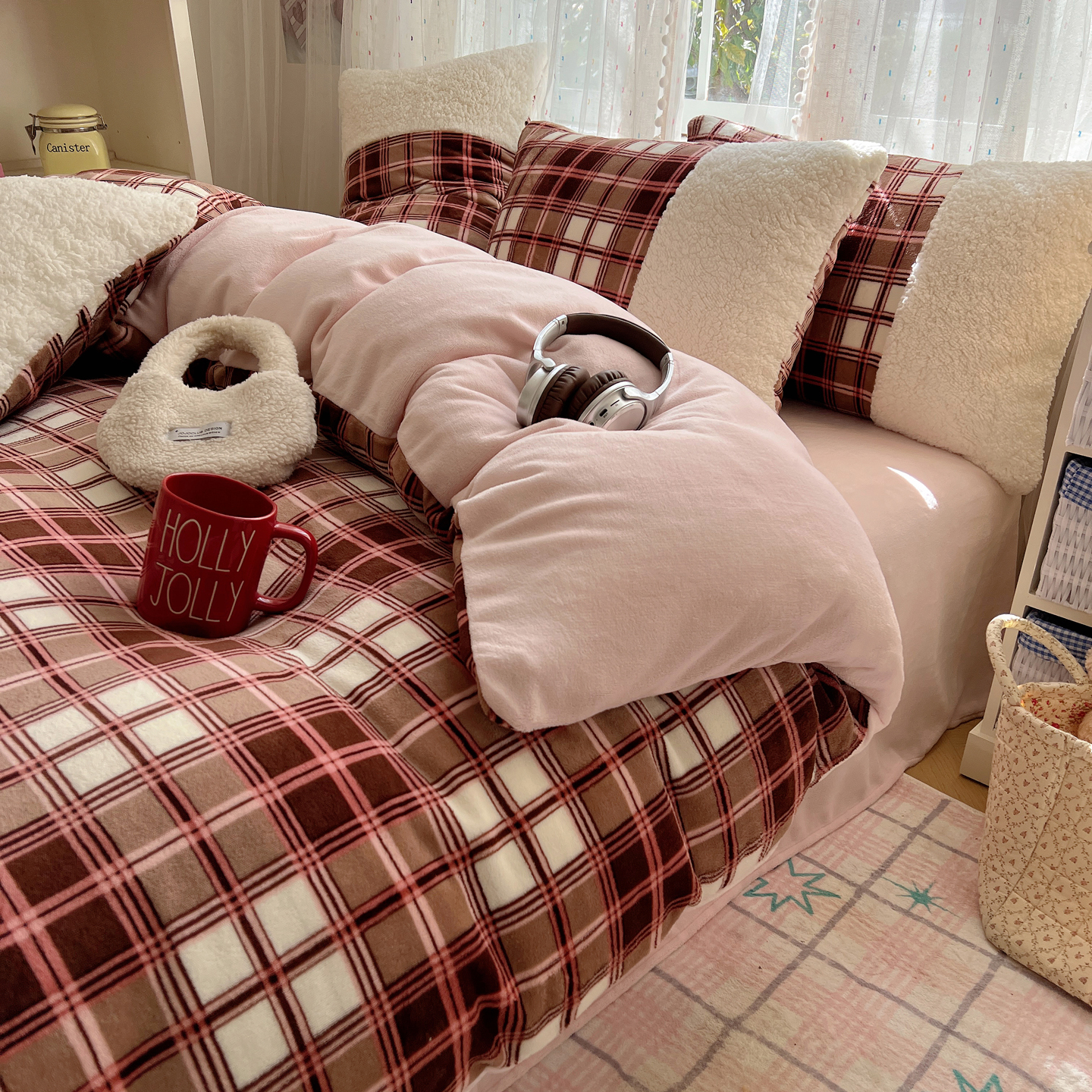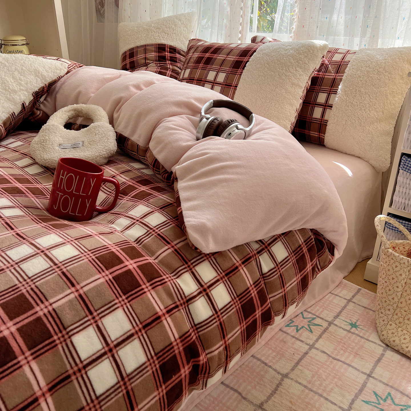 顾里家纺 2025新款复古博主风高克重羊羔毛拼接牛奶绒套件 苏格物语