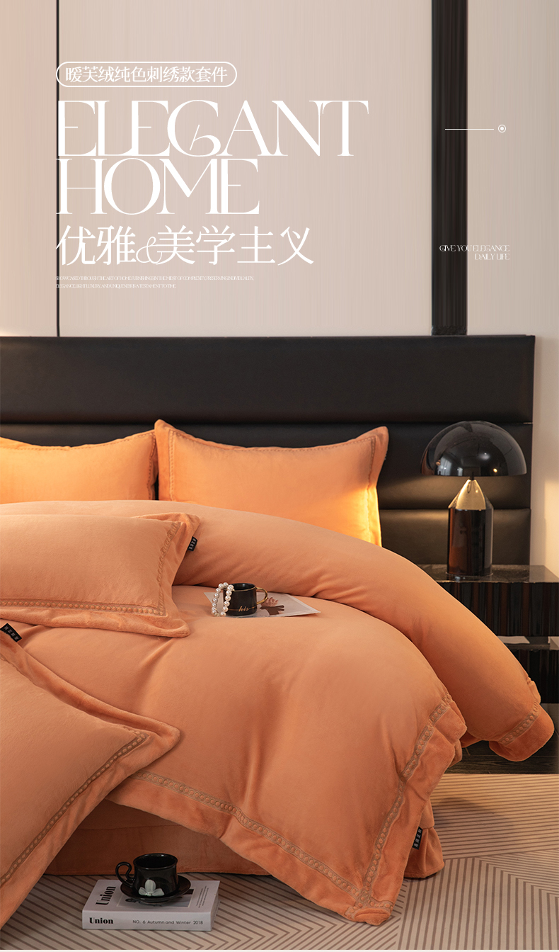 (总)暖洋家纺 2025新款暖芙绒纯色刺绣款套件四件套,爱玛橙,银灰色,香槟色,杏仁,玉色,湖绿色,蓝灰
