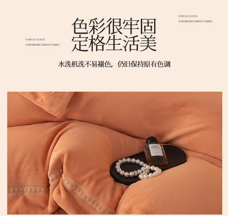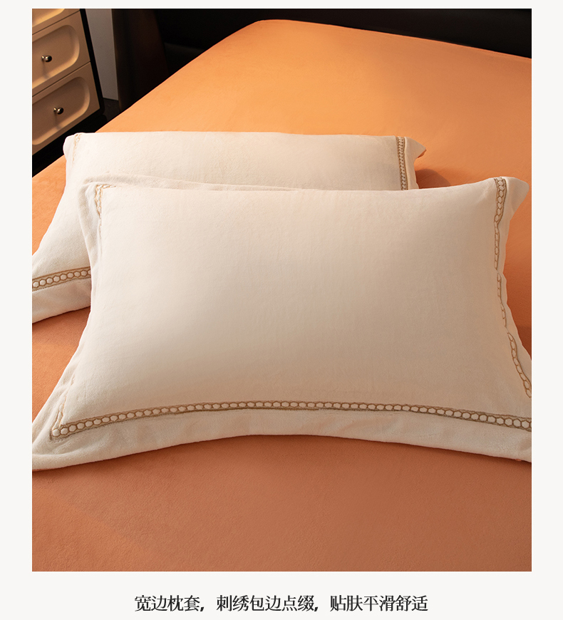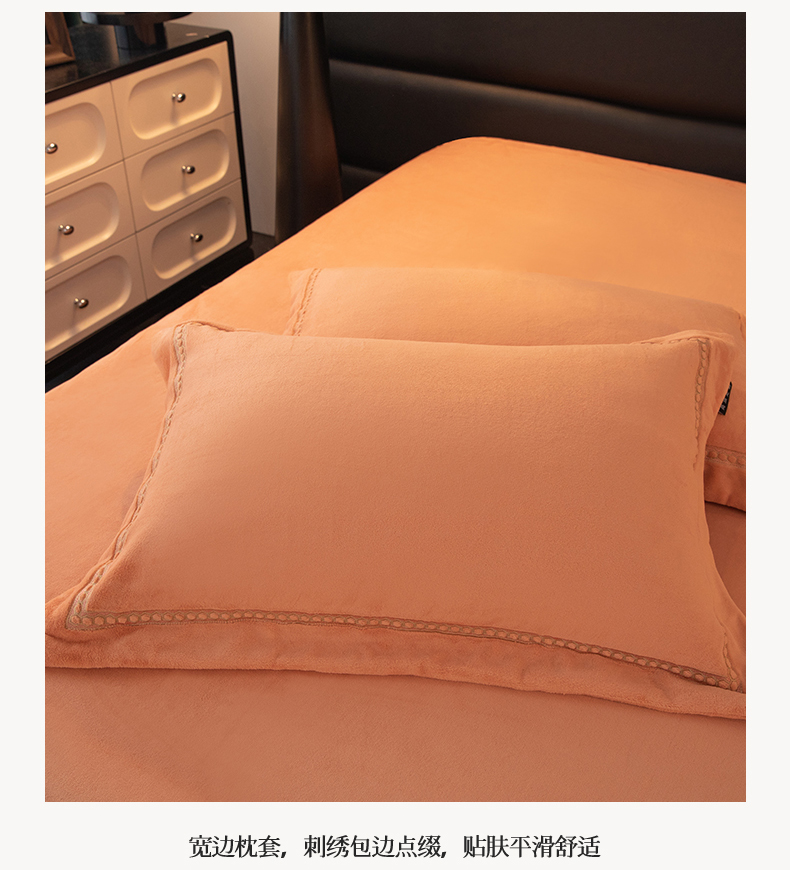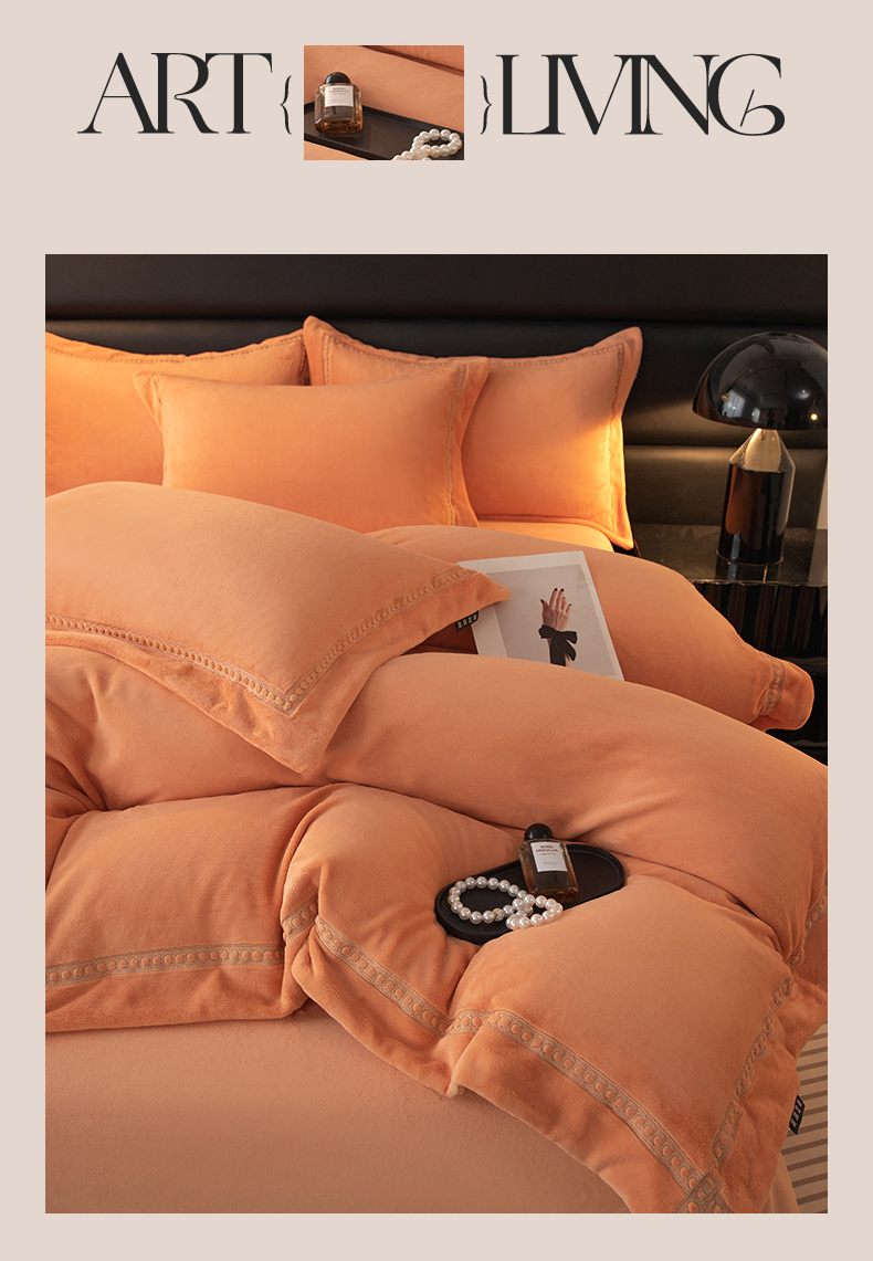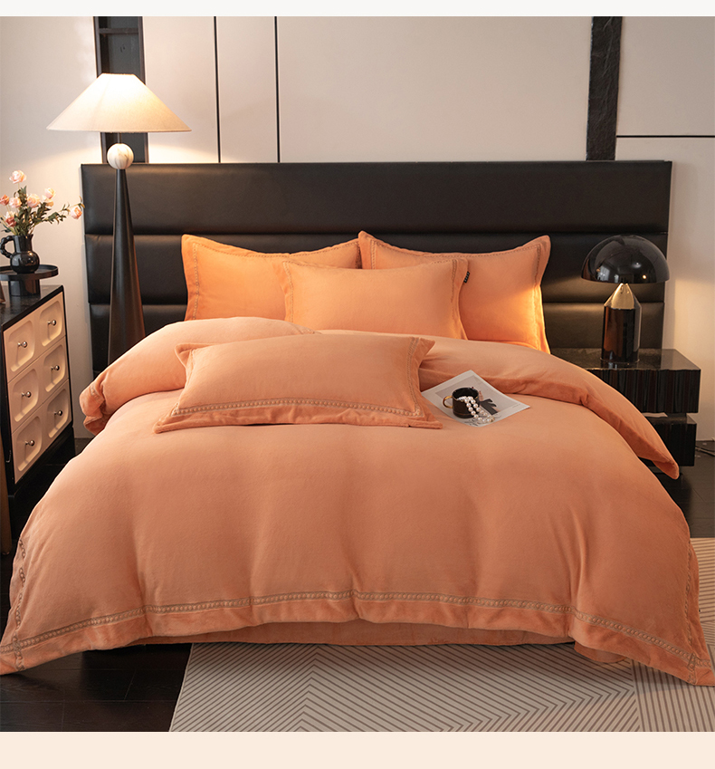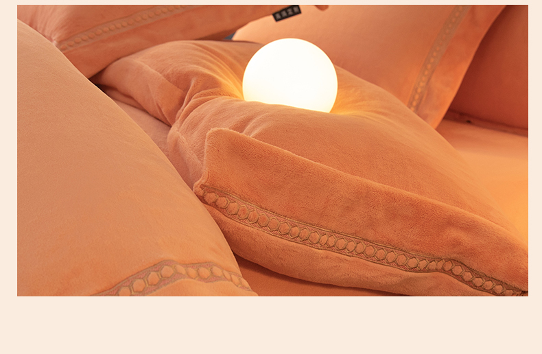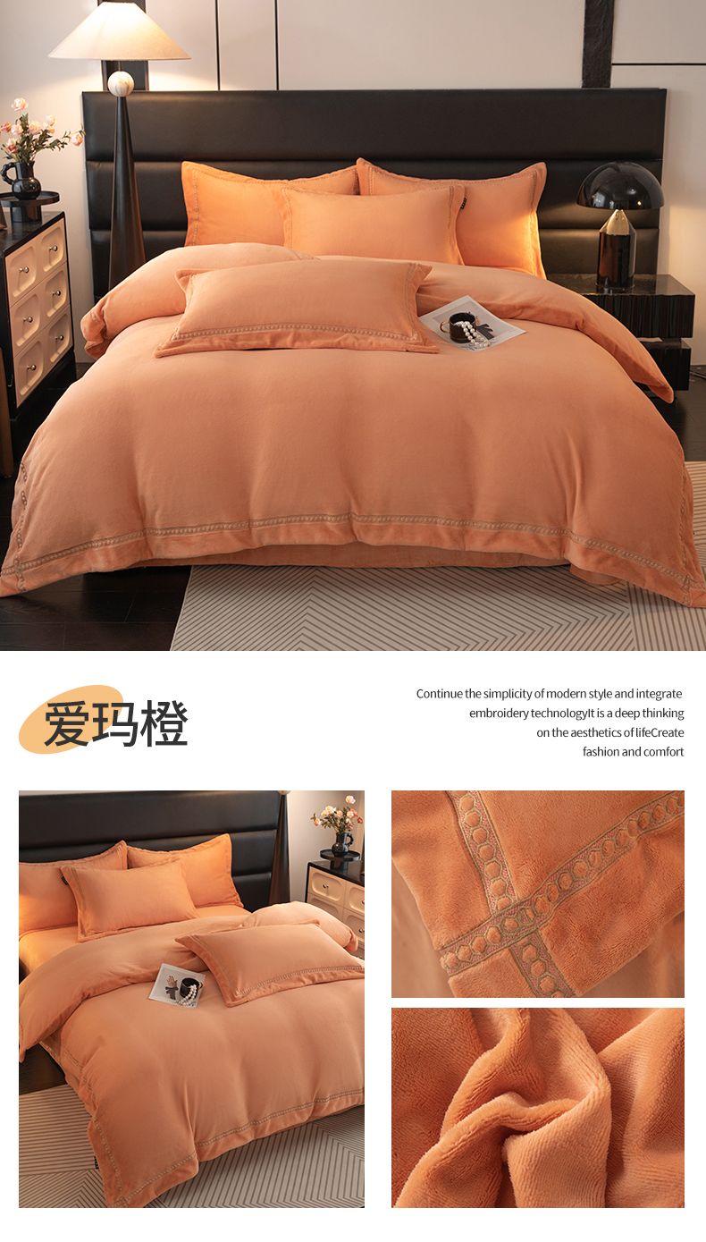 (总)暖洋 2024新款A类暖芙绒纯色刺绣工艺款牛奶绒四件套,爱码橙,湖绿色,蓝灰,藕粉,香槟色,杏仁,银灰色,玉色,富贵,血青,胭脂红