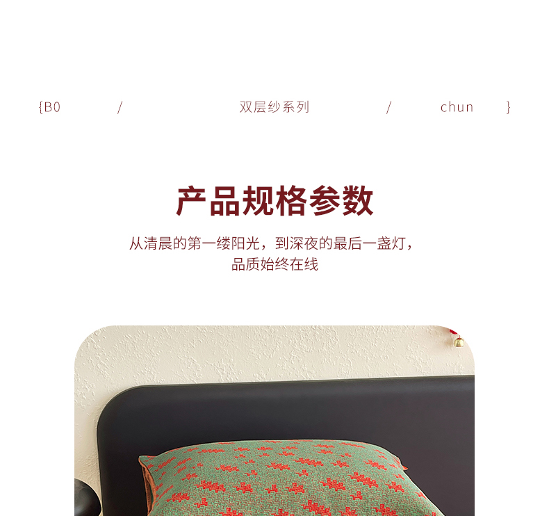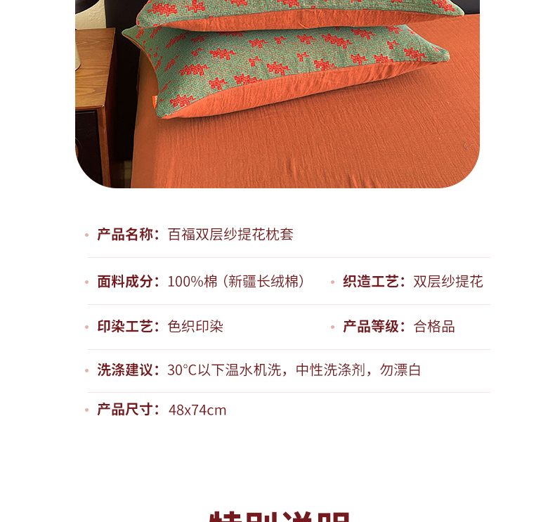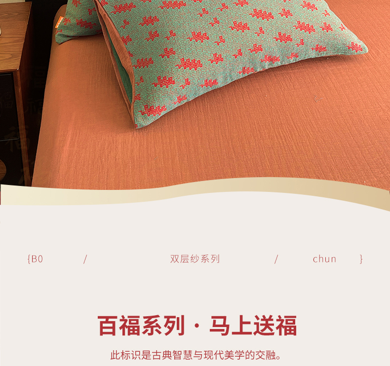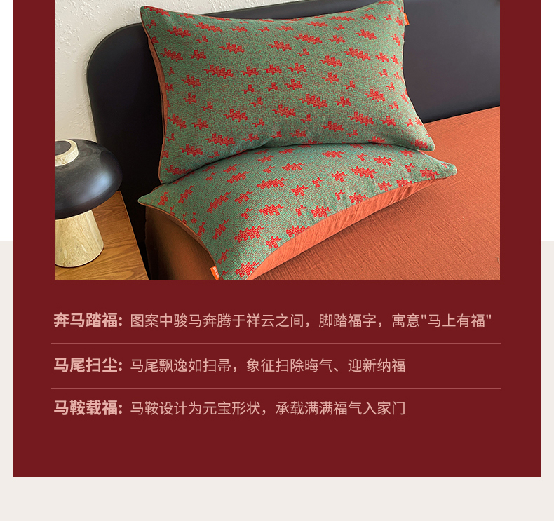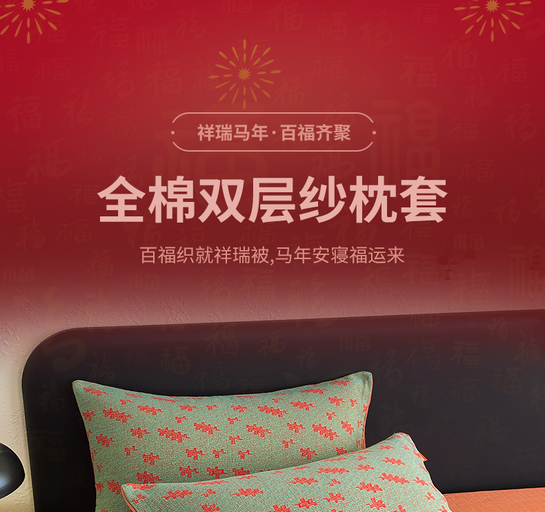 商品名称:春皖家纺 2026新款全棉色织双层纱提花百福系列拉链款-单枕套 绿赤兔