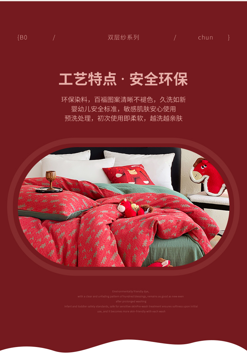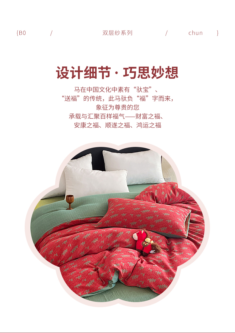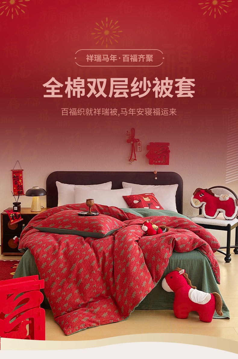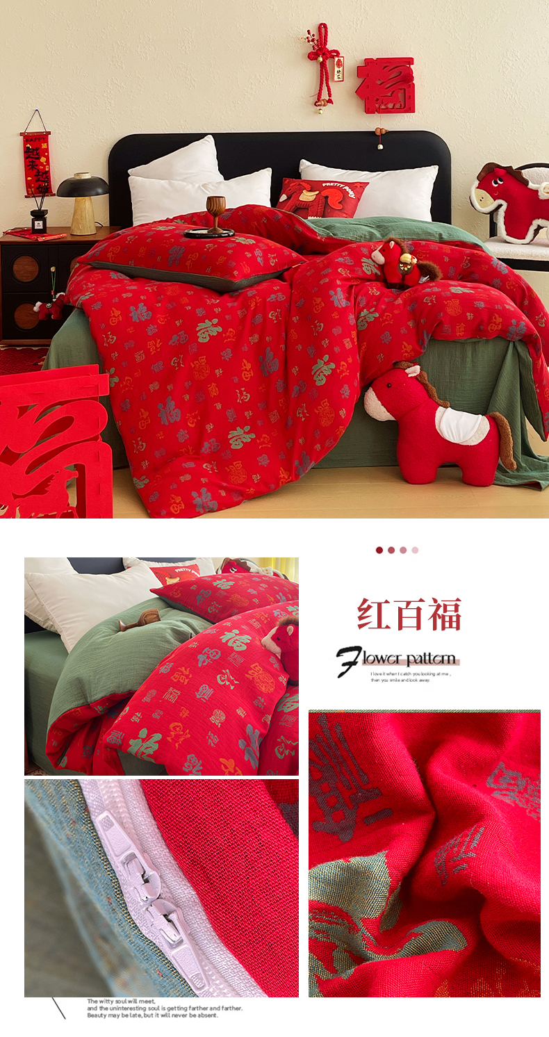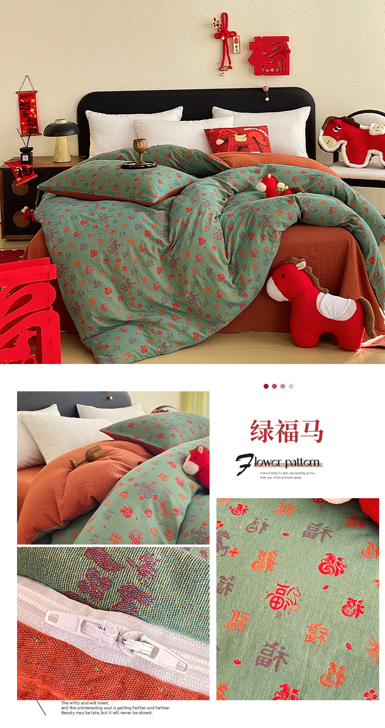 (总)春皖家纺 2026新款全棉色织双层纱提花百福系列拉链款-四件套,红百福,红赤兔,红福马,绿赤兔,绿福马,红绝影,绿绝影